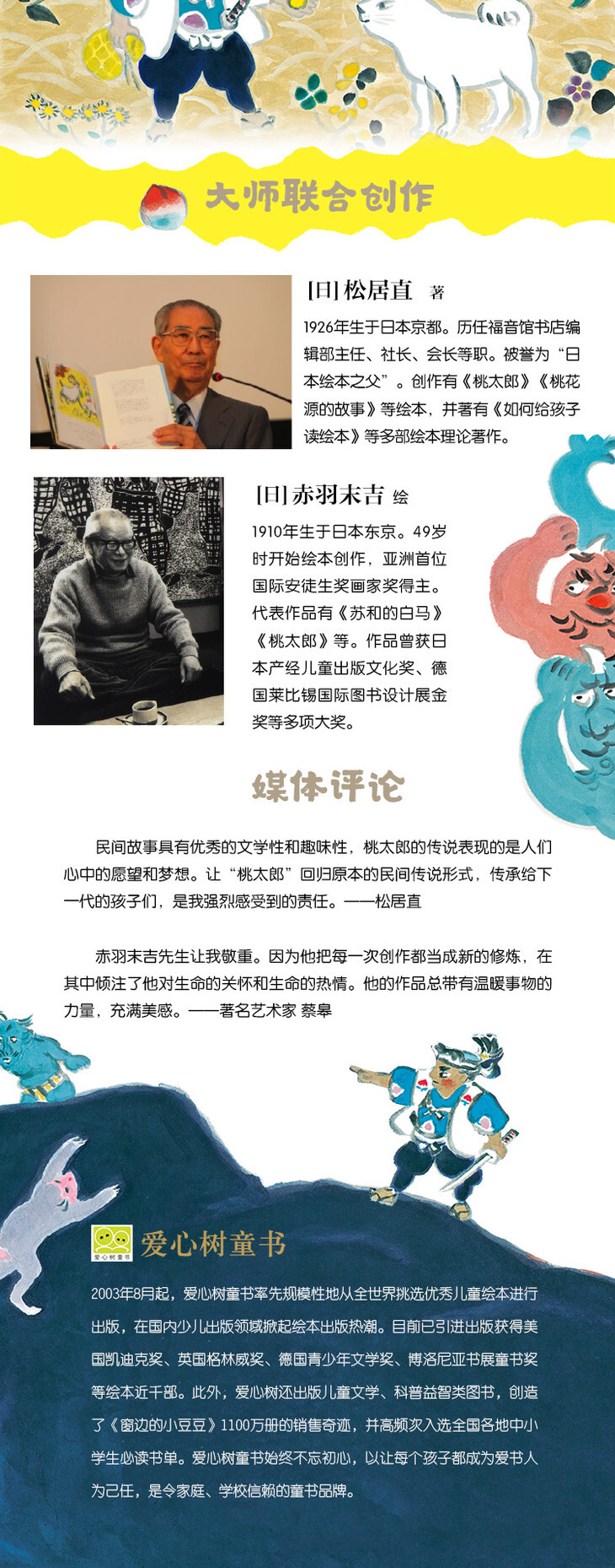 民间故事具有文学性和趣味性,桃太郎的传说表现的是人们心中的愿望和梦想。让“桃太郎”回归原本的民间传说形式,传承给下一代的孩子们,是我强烈感受到的责任。民间故事也展现着人们的幸福与不幸、恐惧与悲伤、惊奇与欢乐,典型地呈现了人生百态,孩子通过故事去体验这些珍贵的经验,可以获取其中的智慧和力量。——松居直
