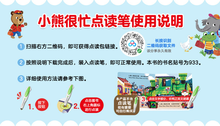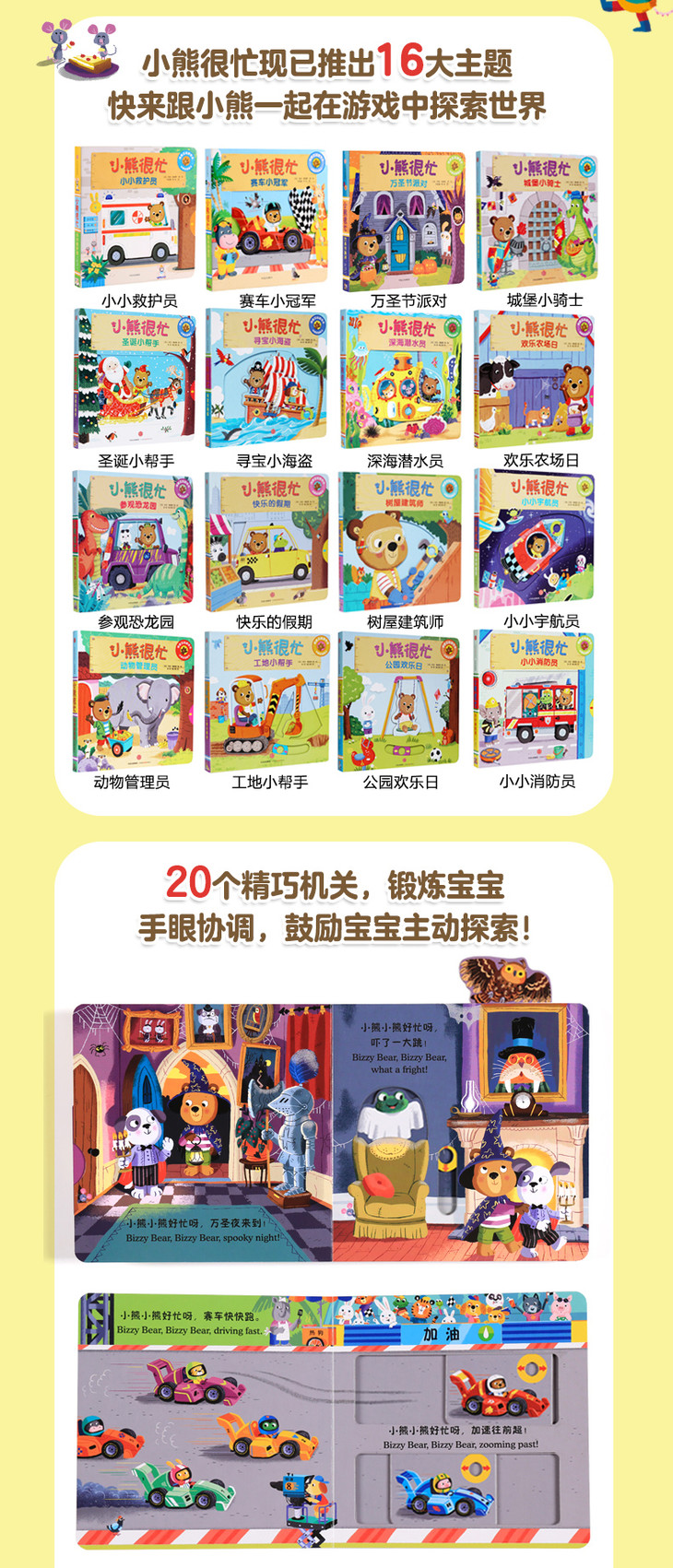 《小熊很忙系列(升级版)》为全新超厚白卡纸音频升级版,有趣好玩的故事配上丰富的互动机关,宝宝用小手推一推、拉一拉、转一转、滑一滑,就能看到意想不到的惊喜,既锻炼了小手的灵,又鼓励宝宝主动探索。扫描封底二维码,即可跟随外教磨耳朵、学发音。朗朗上口的中英歌谣,打造浸入式阅读环境,从小培养宝宝的英文语感。这本书让宝宝会从“玩”中去探索世界,体验身边不同的生活和职业。