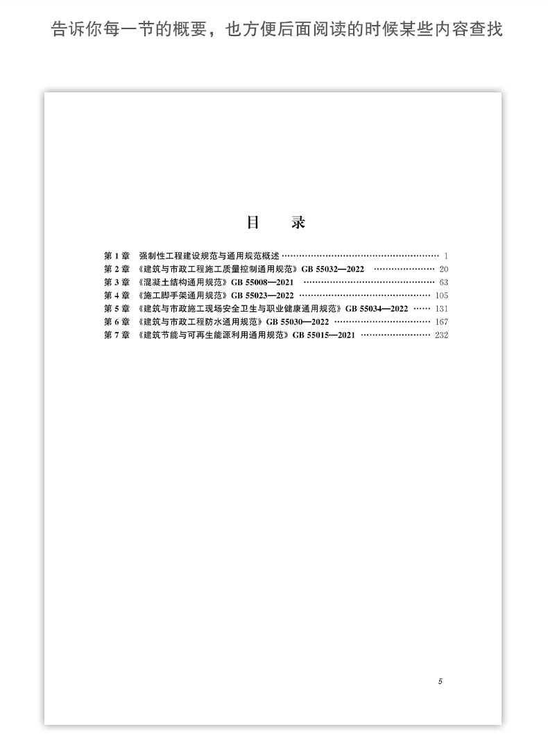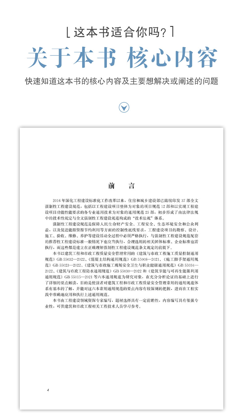 本书以建筑工程和市政工程质量安全管理常用的《建筑与市政工程施工质量控制通用规范》GB 55032-2022、《混凝土结构通用规范》GB 55008-2021、《施工脚手架通用规范》GB 55023-2022、《建筑与市政施工现场安全卫生与职业健康通用规范》GB 55034-2022、《建筑与市政工程防水通用规范》GB 55030-2022和《建筑节能与可再生能源利用通用规范》GB 55015-2021等六本通用规范为研究对象,在充分分析论证的基础上进行了详细的要点解读,目的是使读者对建筑工程和市政工程质量安全管理常用的通用规范体系有基本的了解,并能对这六本常用通用规范的要点内容有较深刻的把握,进而在工程实践中准确地应用和执行上述通用规范。