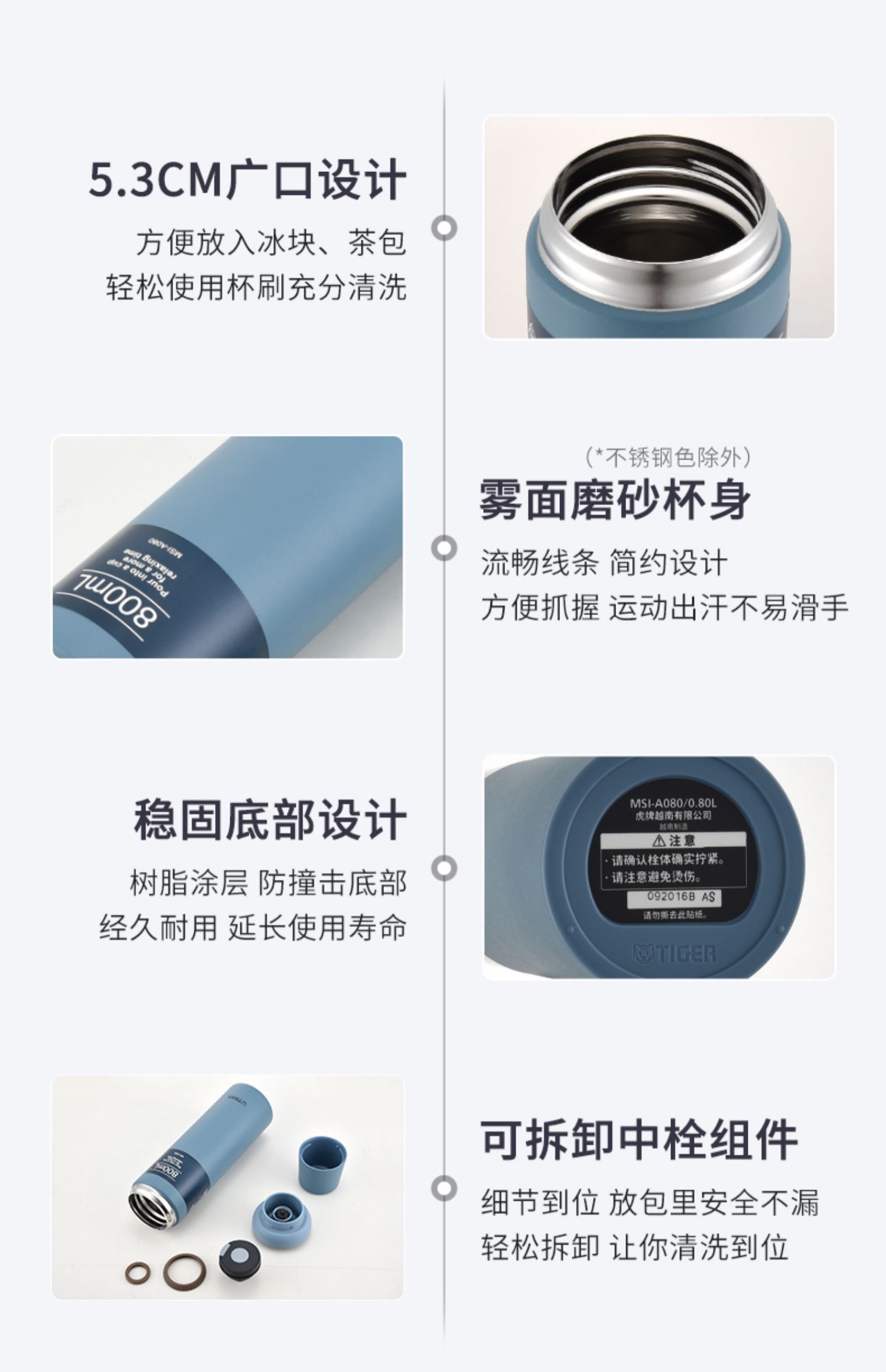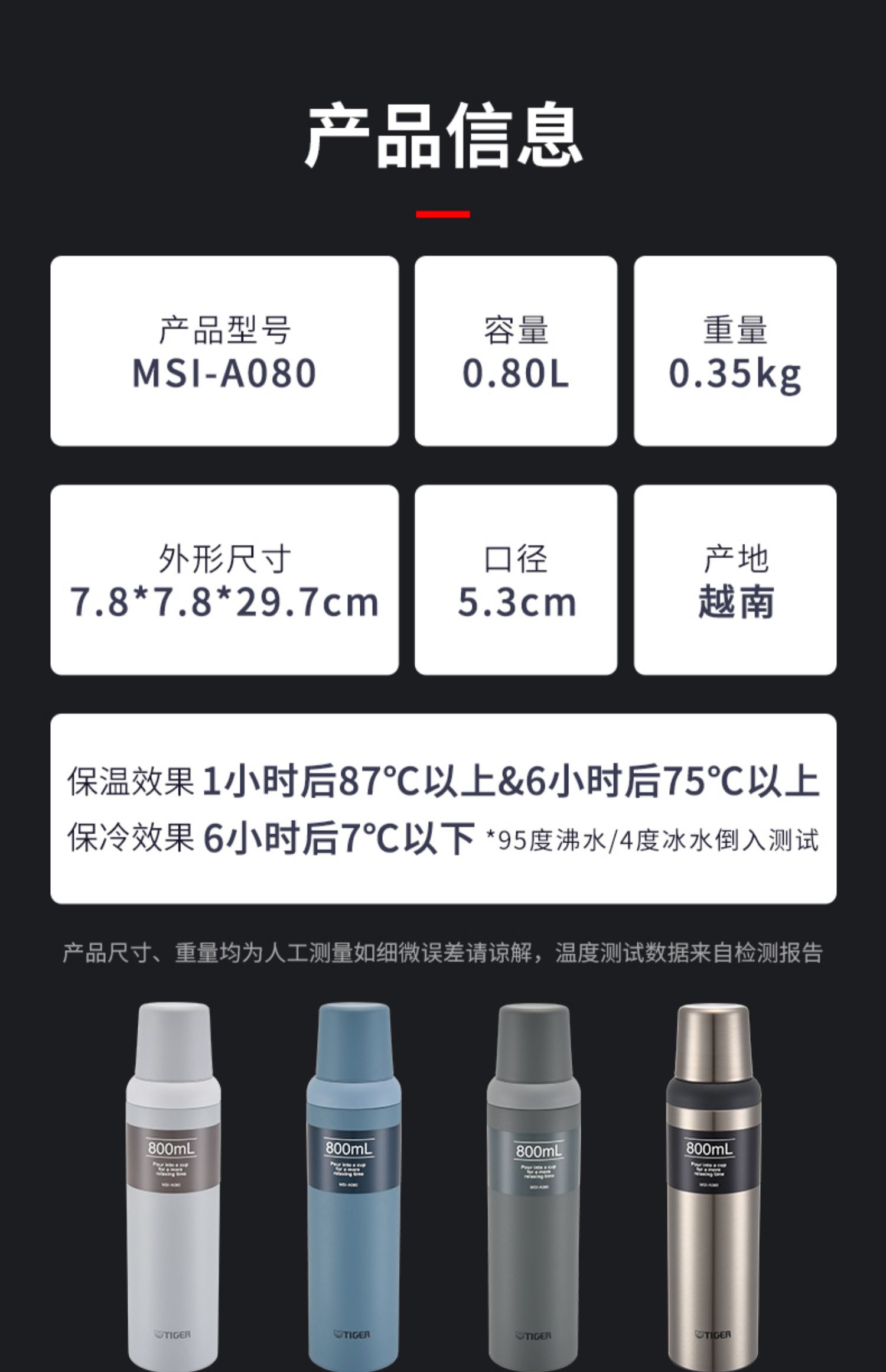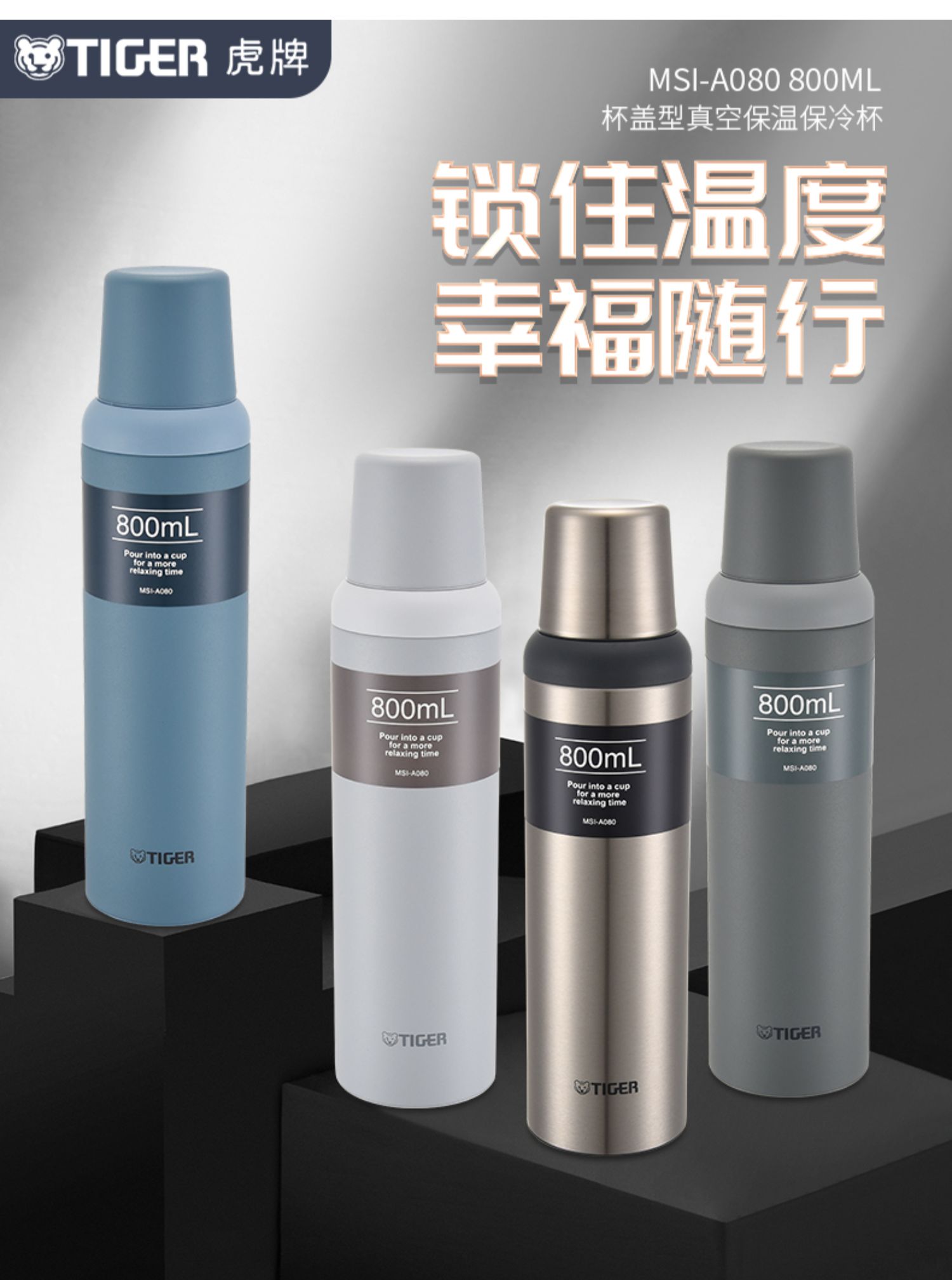 TIGER/虎牌 MSI-A080户外大容量杯盖型保温保冷不锈钢便携水杯800ML