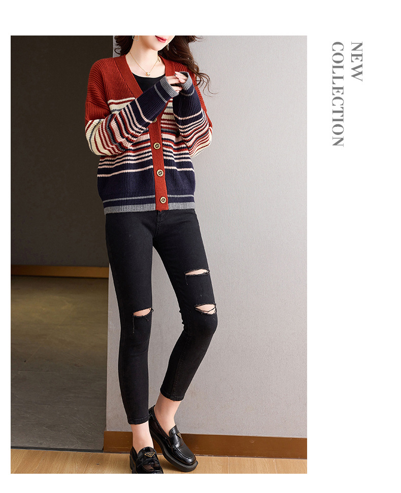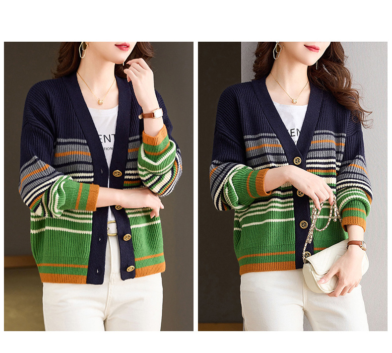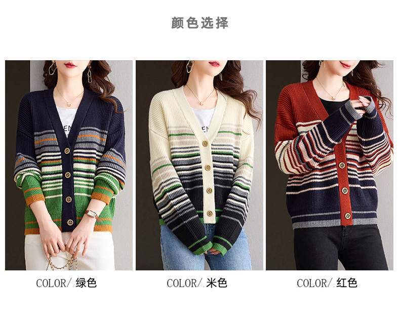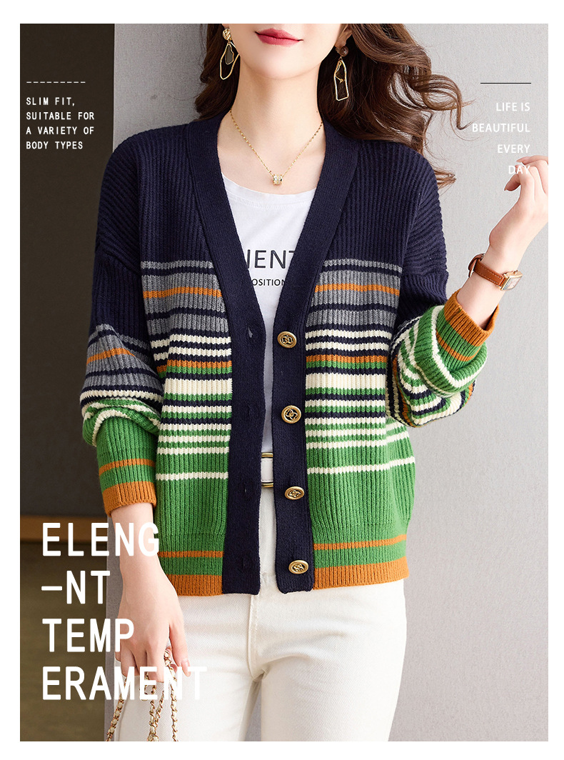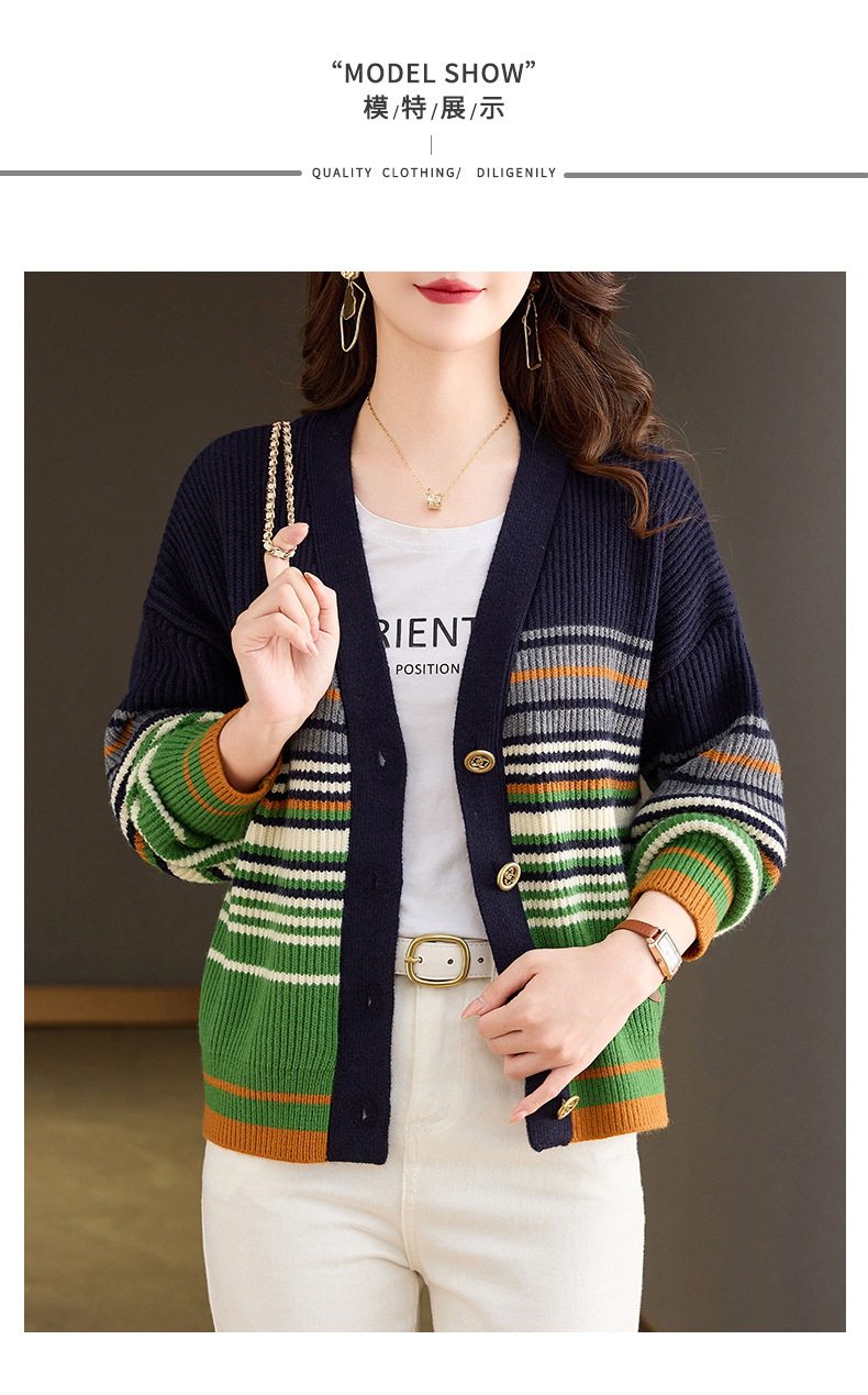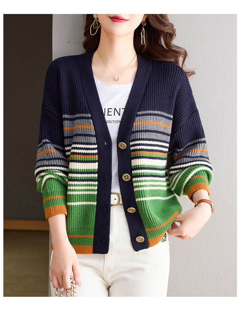 CC-26-8193 v领彩色条纹针织开衫长袖女春秋2024新款设计感拼接撞色毛衣外套