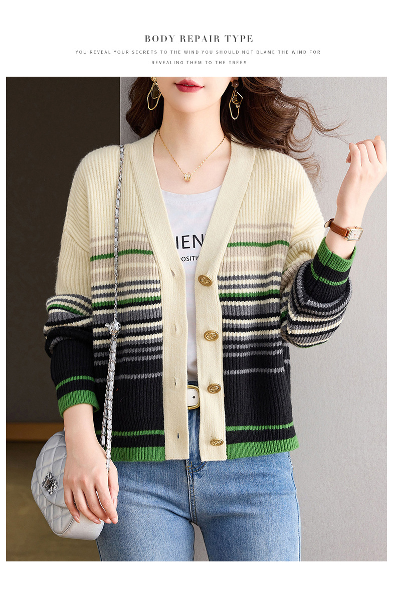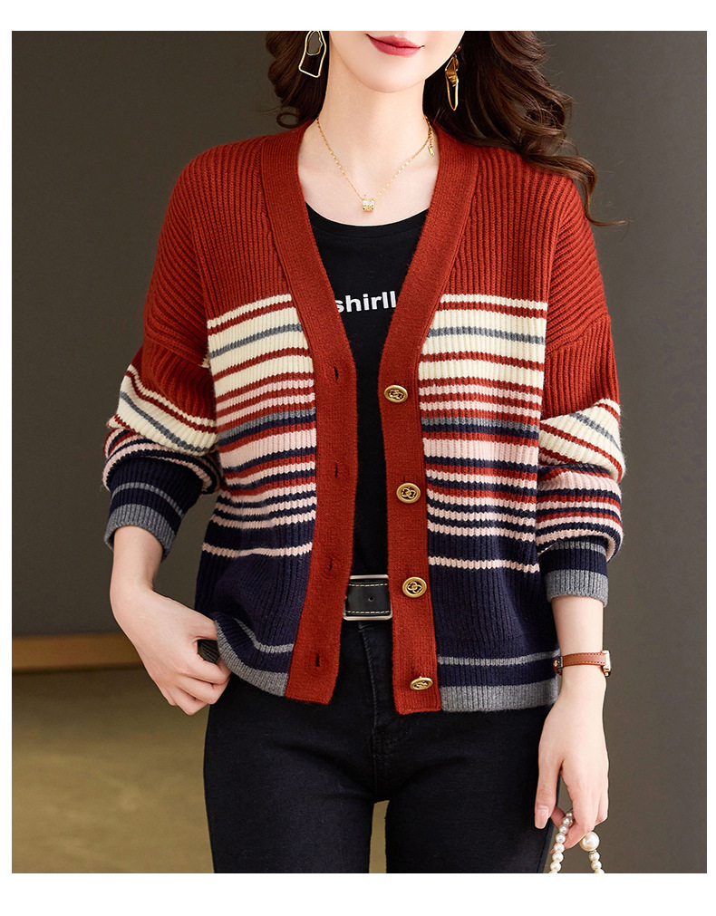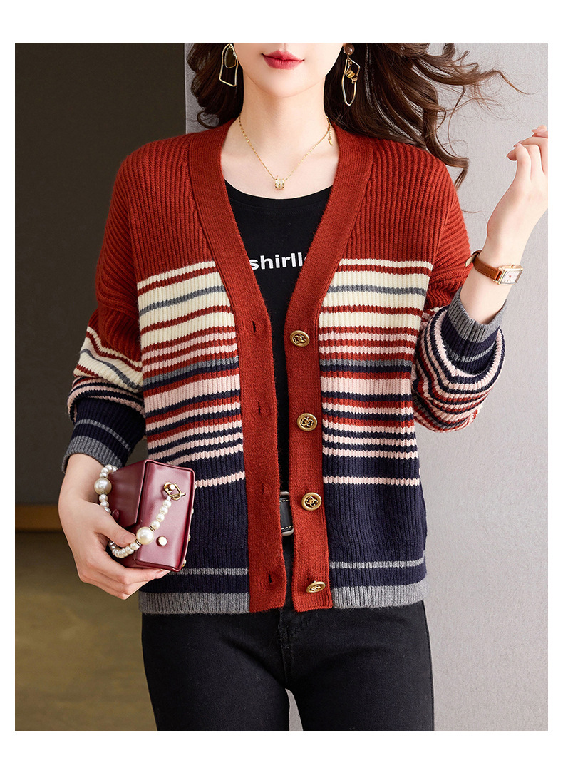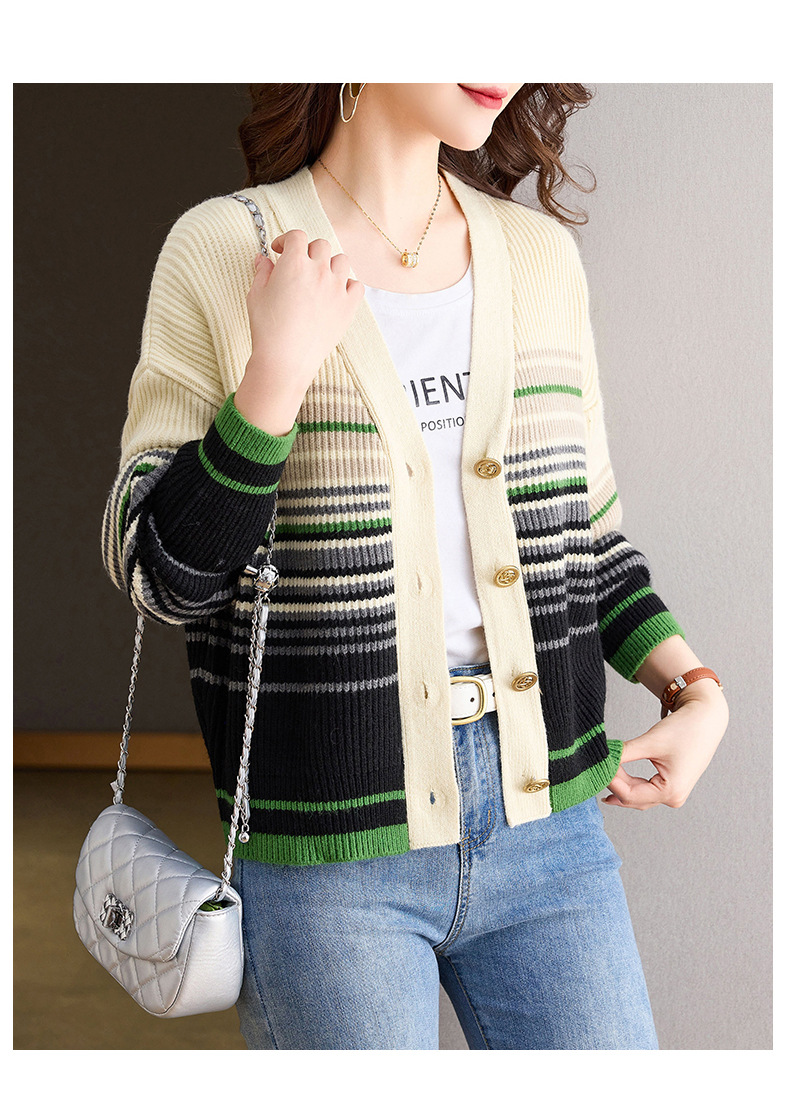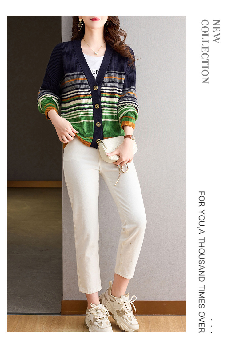 CC-26-8193 v领彩色条纹针织开衫长袖女春秋2024新款设计感拼接撞色毛衣外套