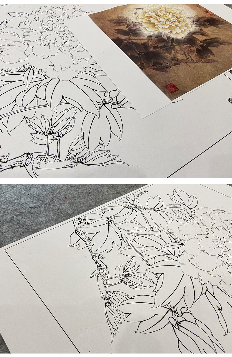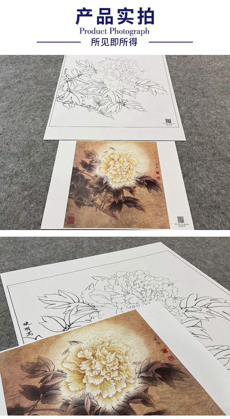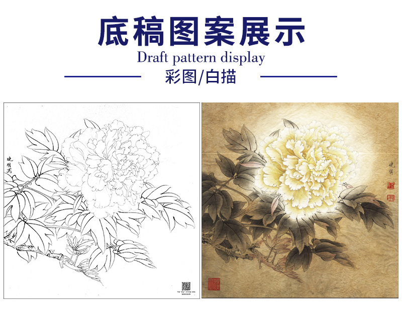 【大彩图】李晓明工笔画白描底稿斗方小品《春花秋韵》牡丹临摹勾线花鸟线稿K039