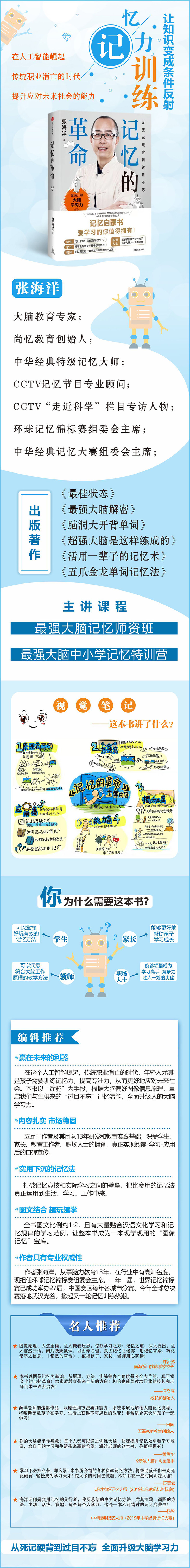 张海洋,大脑教育专家;尚忆教育创始人;中华经典特级记忆大师;中央电视台记忆节目专业顾问;《走近科学》栏目专访人物;环球记忆锦标赛组委会主席;中华经典记忆大赛组委会主席;出版著作:《zuiqiang大脑解密》、《超强大脑是这样练成的》、《zui佳状态》、《活用一辈子的记忆术》、《五爪金龙单词记忆法》、《脑洞大开背单词》等;主讲课程:zuiqiang大脑记忆师资班、zuiqiang大脑中小学记忆特训营。