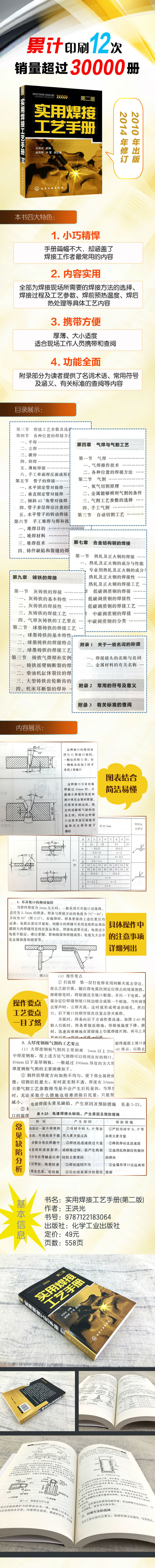 《实用焊接工艺手册(第2版)》是《实用焊接工艺手册》(第二版),此书第一版深受广大读者的欢迎。手册第一章至第五章介绍了常用的熔焊与热切割的工艺内容,包括焊条电弧焊、埋弧自动焊、钨极和熔化极氩弧焊、CO2气体保护焊、气焊与气割、电渣焊、等离子弧焊接与切割和碳弧气刨等工艺知识;第六章至第十三章介绍了各种常用材料的焊接工艺,包括碳钢、合金结构钢、不锈钢和耐热钢、铸铁、铝及铝合金、铜及铜合金、异种金属等材料的焊接工艺。附录部分还为读者提供了有关名词术语、常用符号及意义和有关标准的查阅等内容。本书内容简洁、实用性强。不涉及焊接冶金、焊接电源原理、焊接结晶过程等理论性较强的知识,全部为焊接现场所需要的焊接方法的选择、焊接过程及工艺参数、焊前预热温度、焊后热处理等具体的工艺内容。
