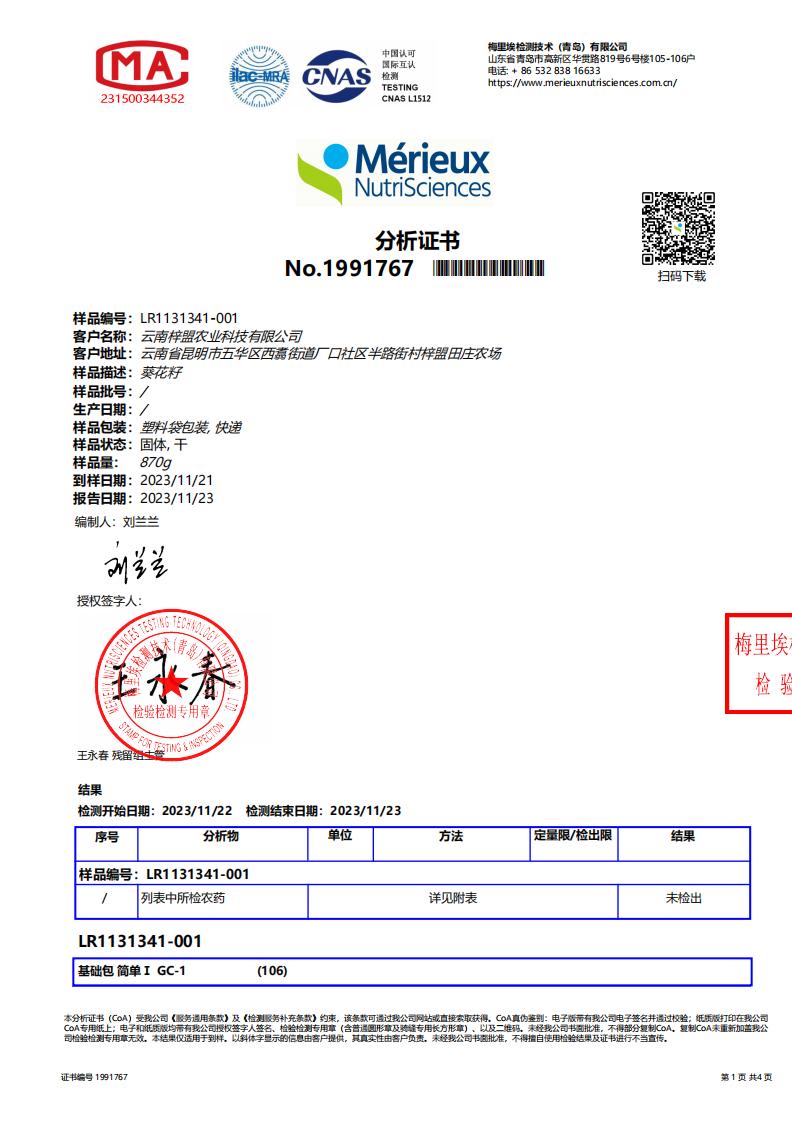 去年第一年种植的的红皮瓜子也做了检测,280+农残无检出,今年依然是同样的种植方式。