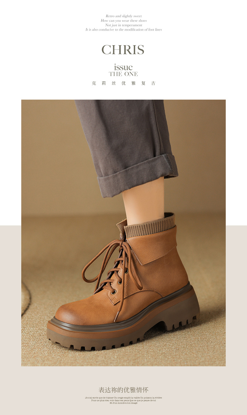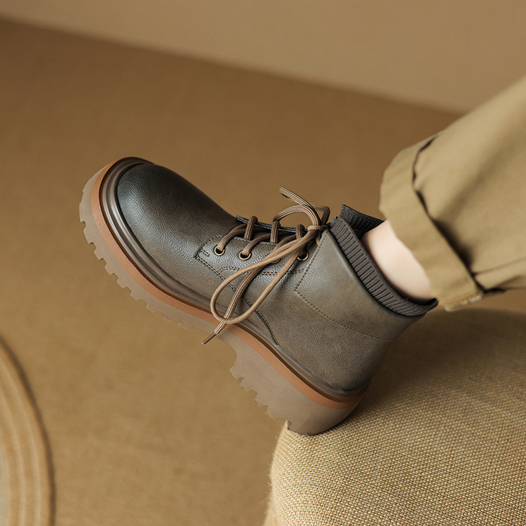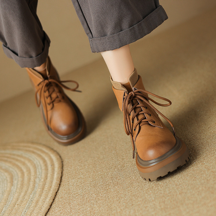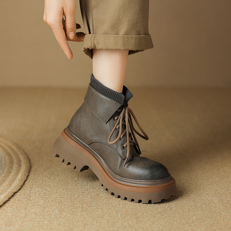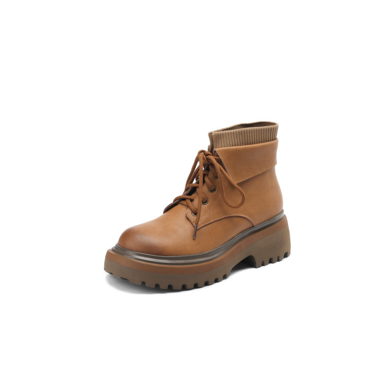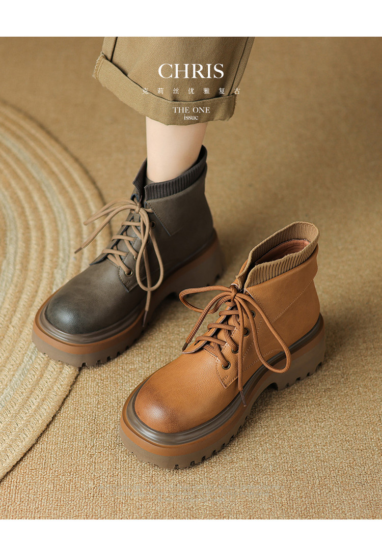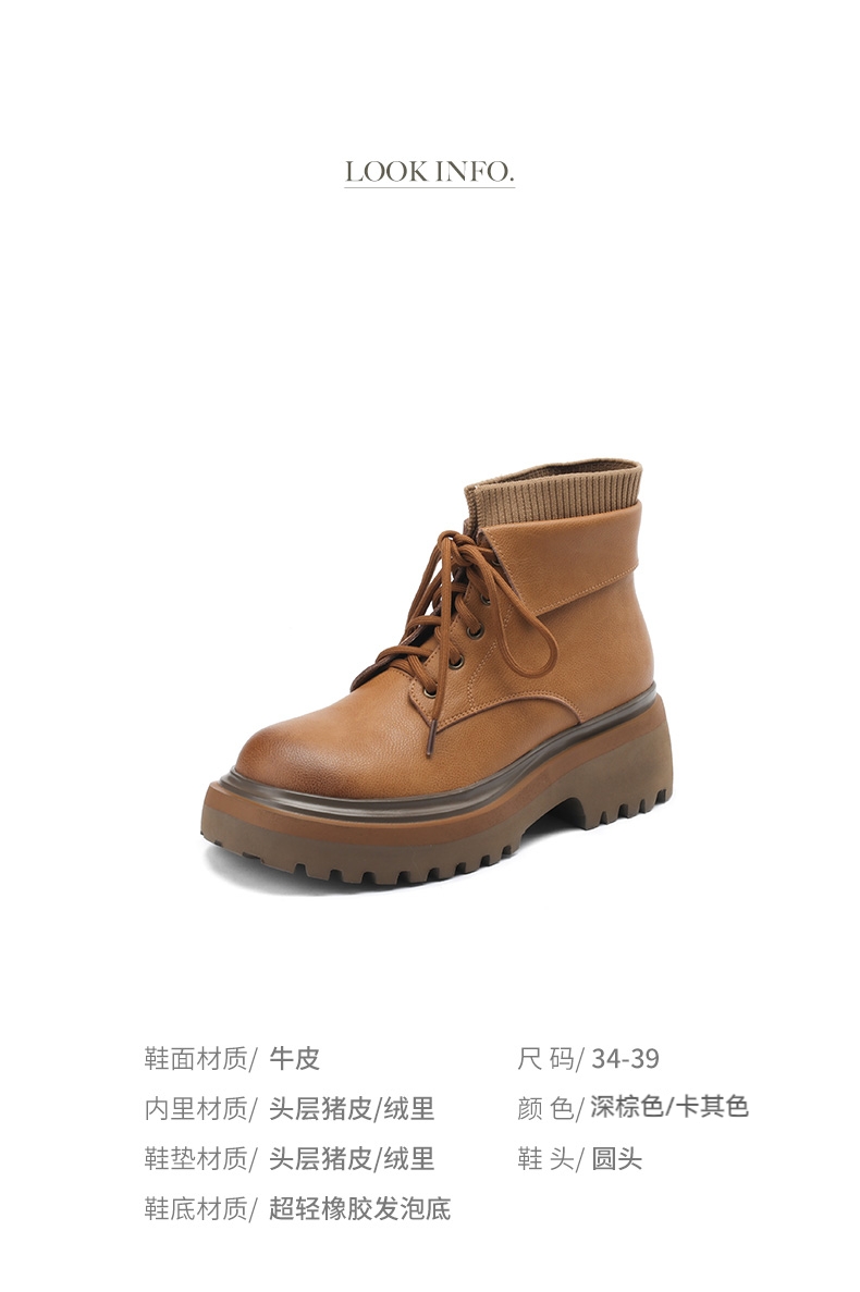 【预售5天】秋冬新款真皮厚底圆头擦色系带马丁靴女松糕底卡其色复古短靴MDY&AM2169-15