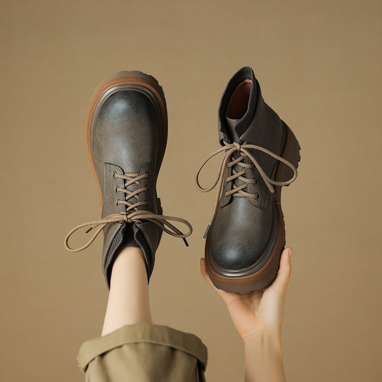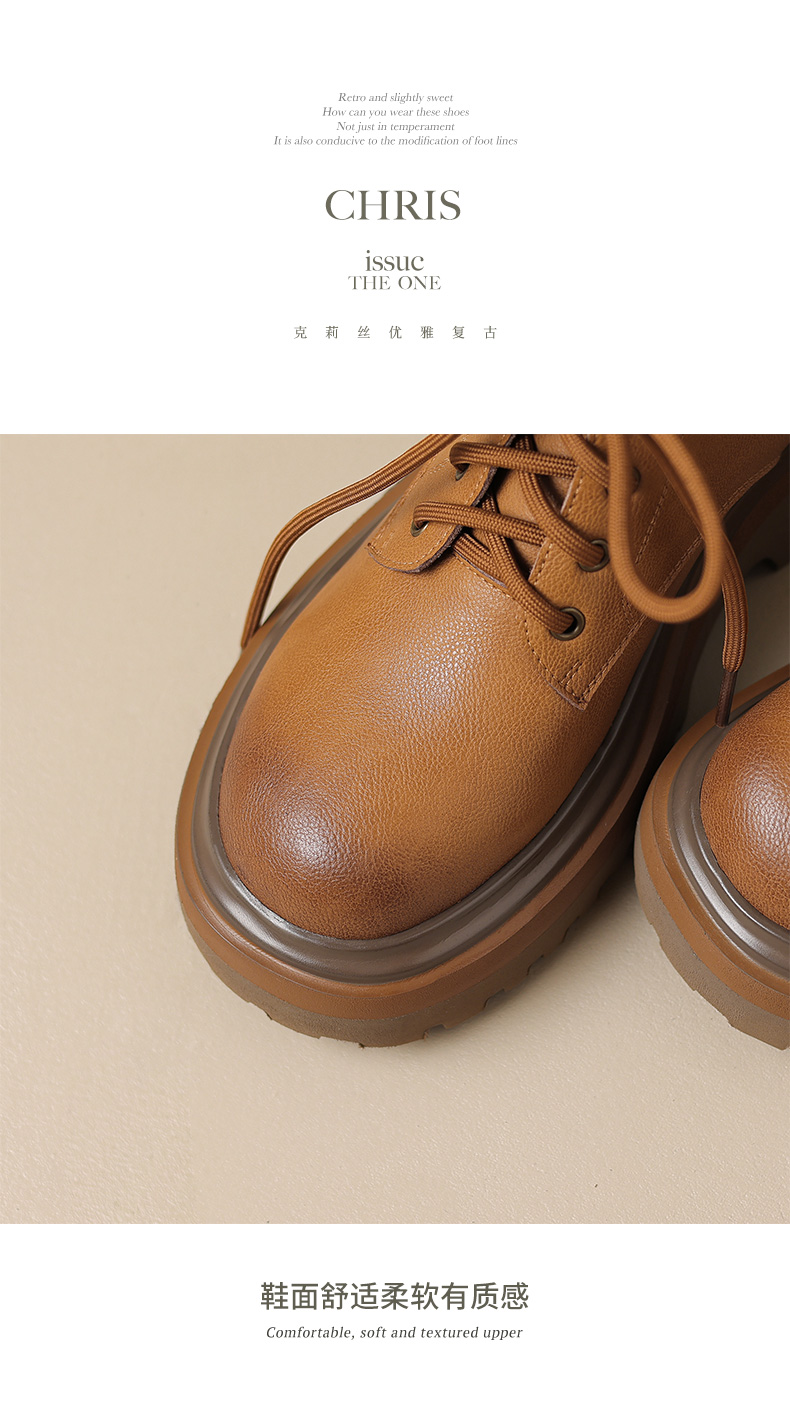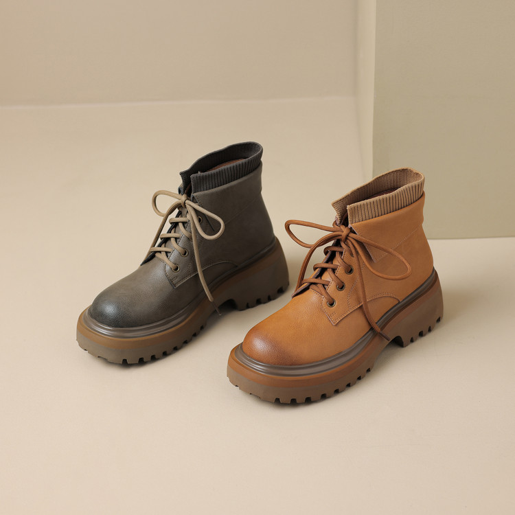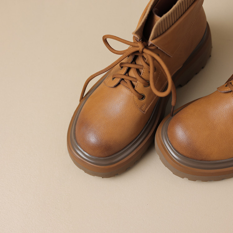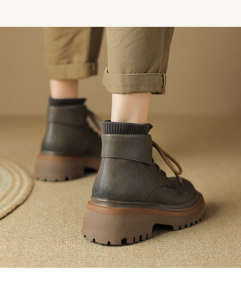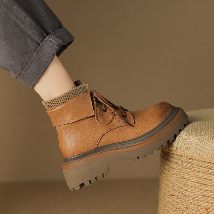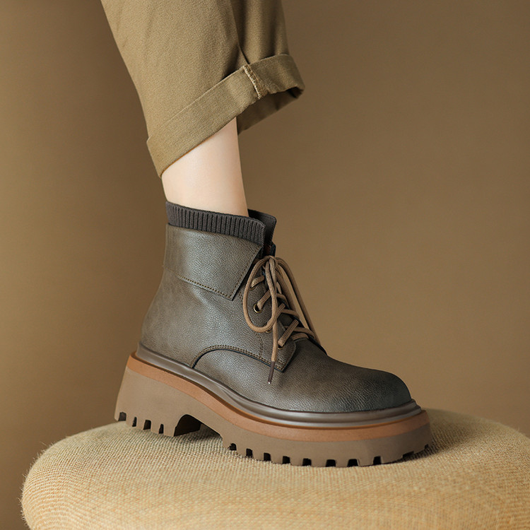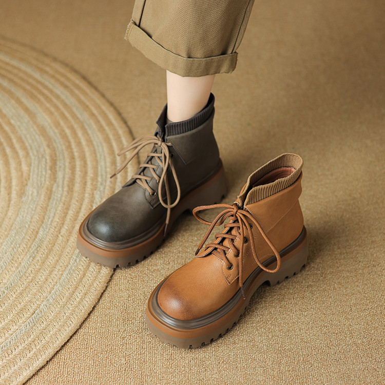 【预售5天】秋冬新款真皮厚底圆头擦色系带马丁靴女松糕底卡其色复古短靴MDY&AM2169-15