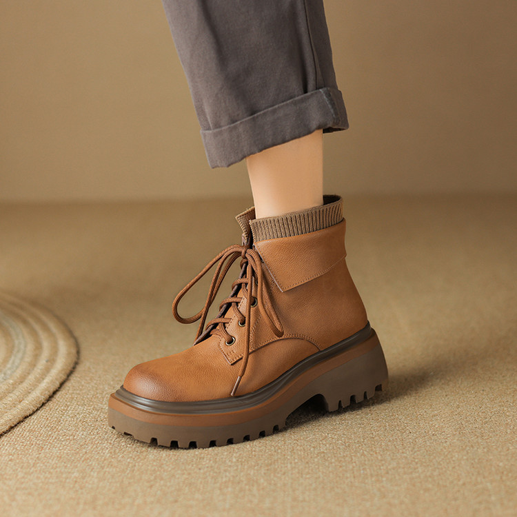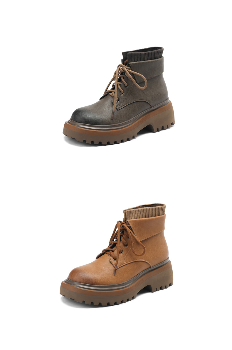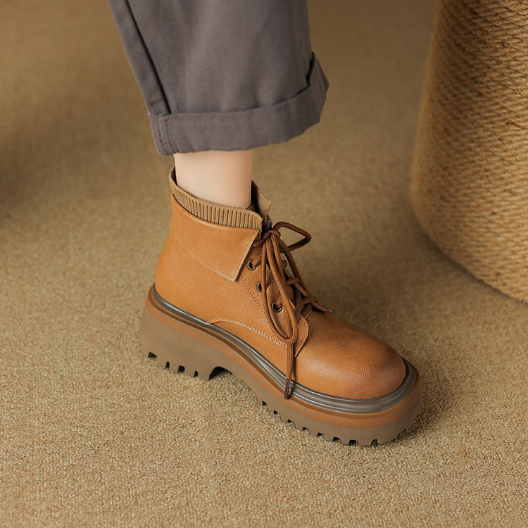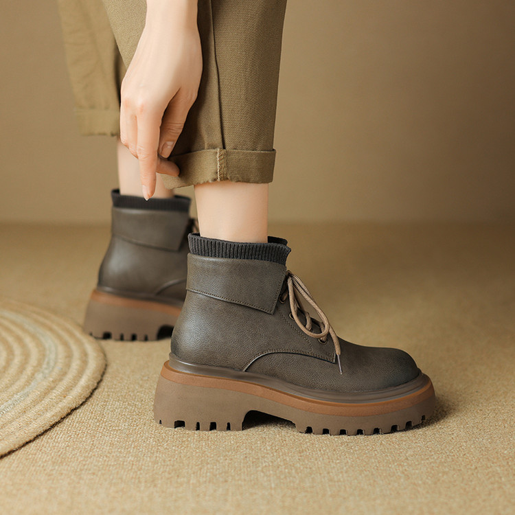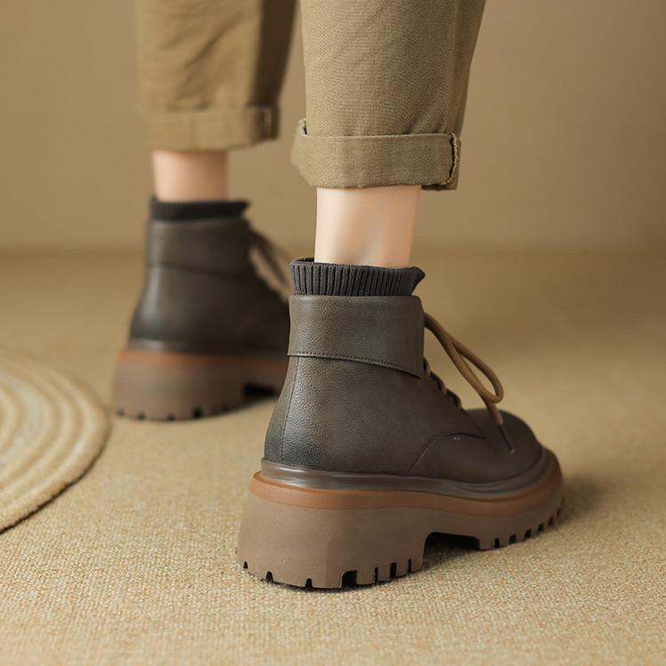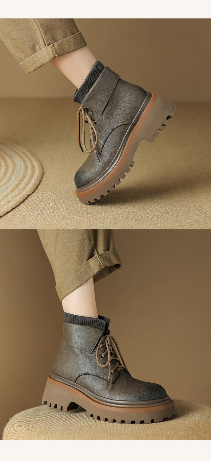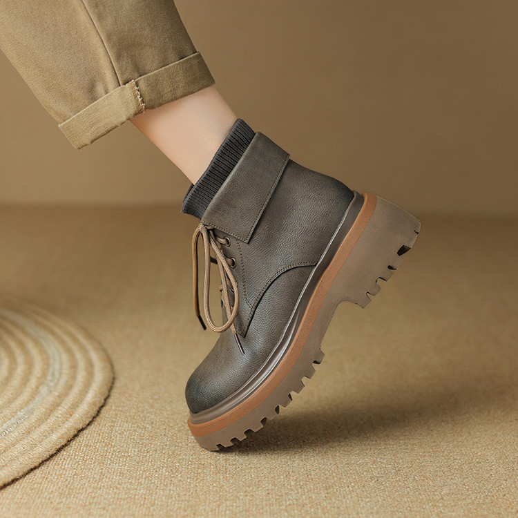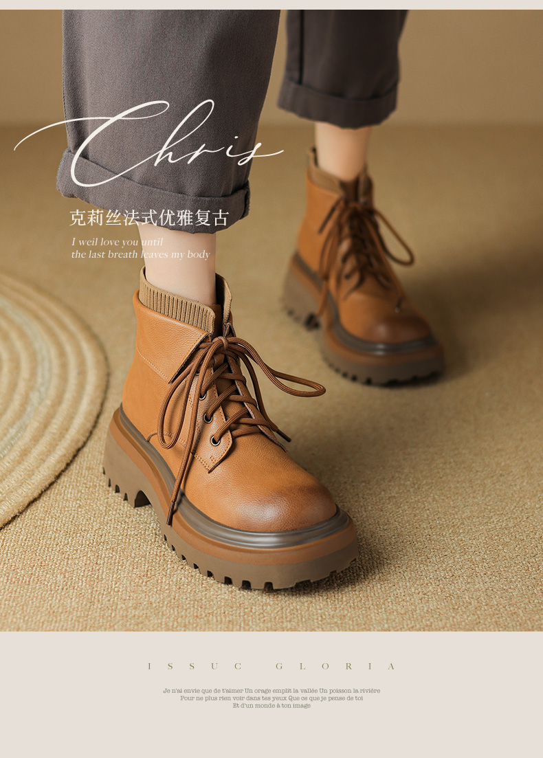 【预售5天】秋冬新款真皮厚底圆头擦色系带马丁靴女松糕底卡其色复古短靴MDY&AM2169-15