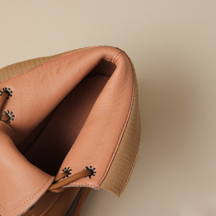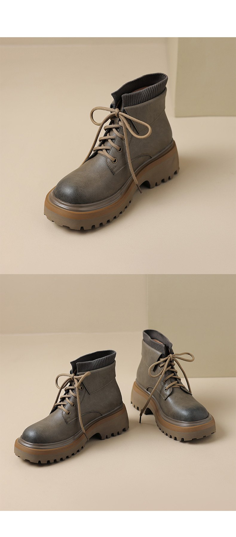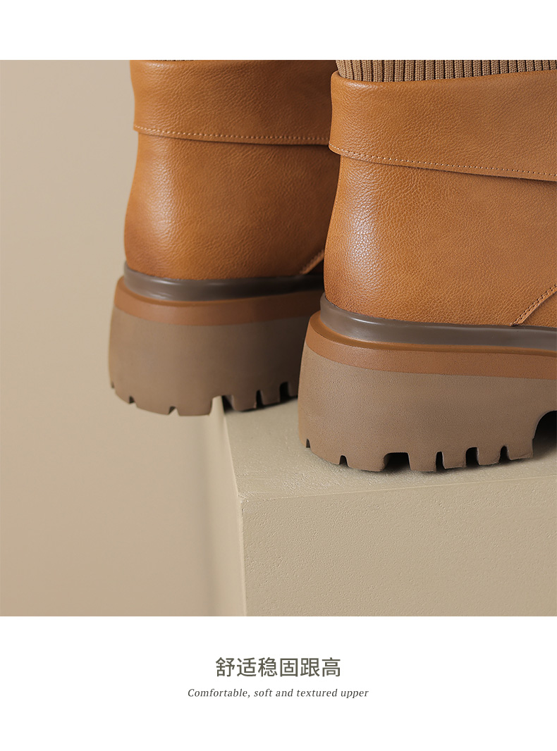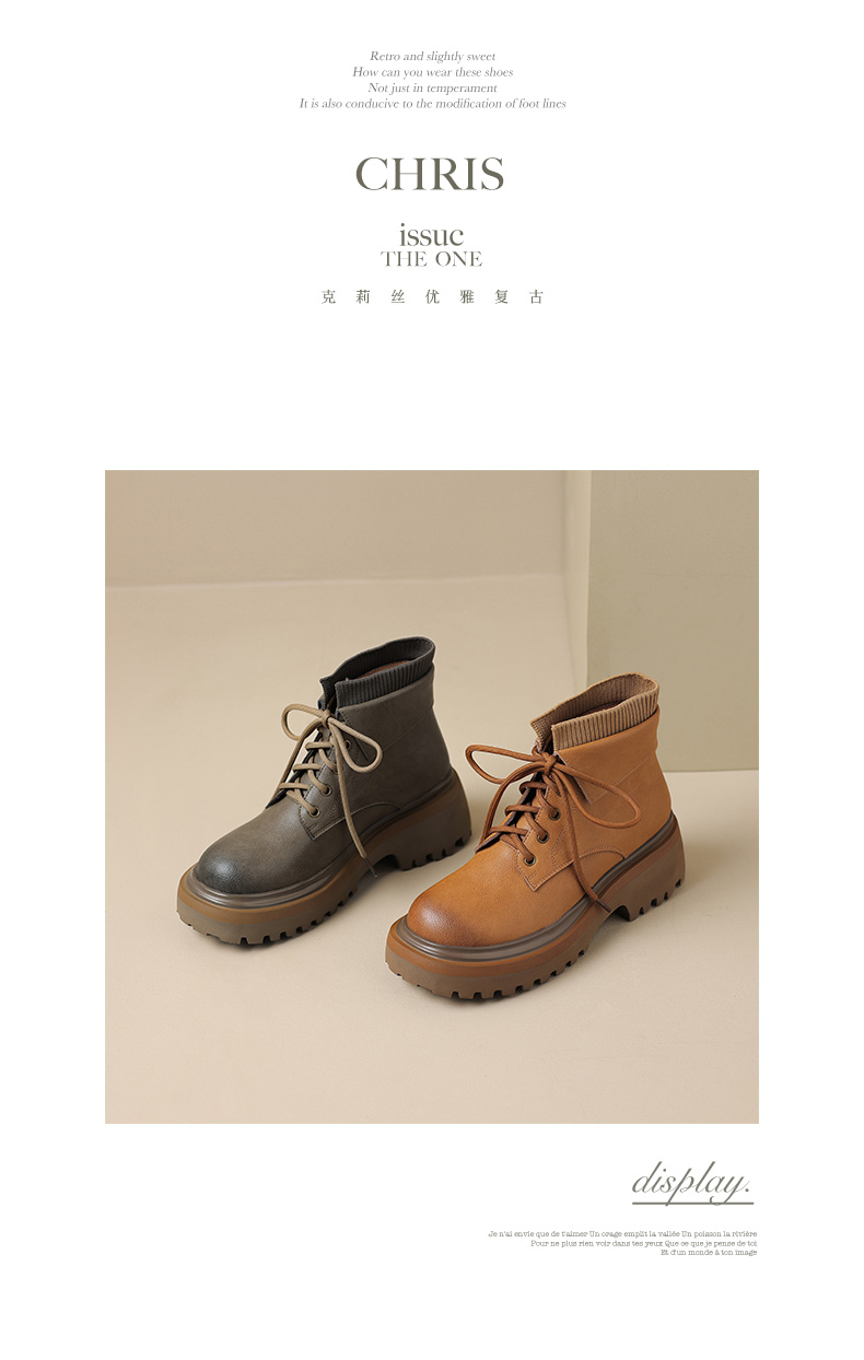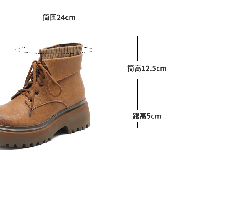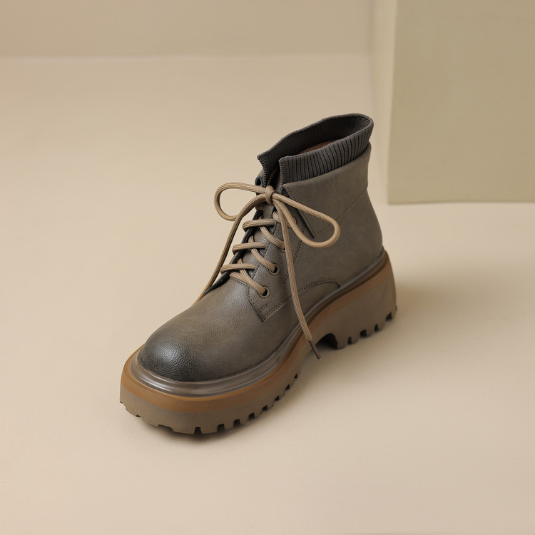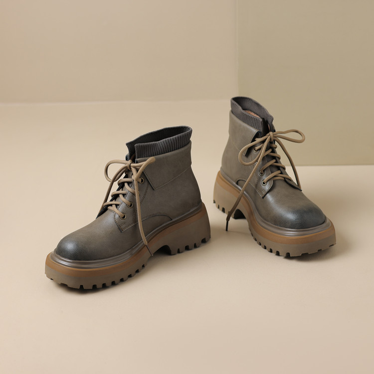 【预售5天】秋冬新款真皮厚底圆头擦色系带马丁靴女松糕底卡其色复古短靴MDY&AM2169-15