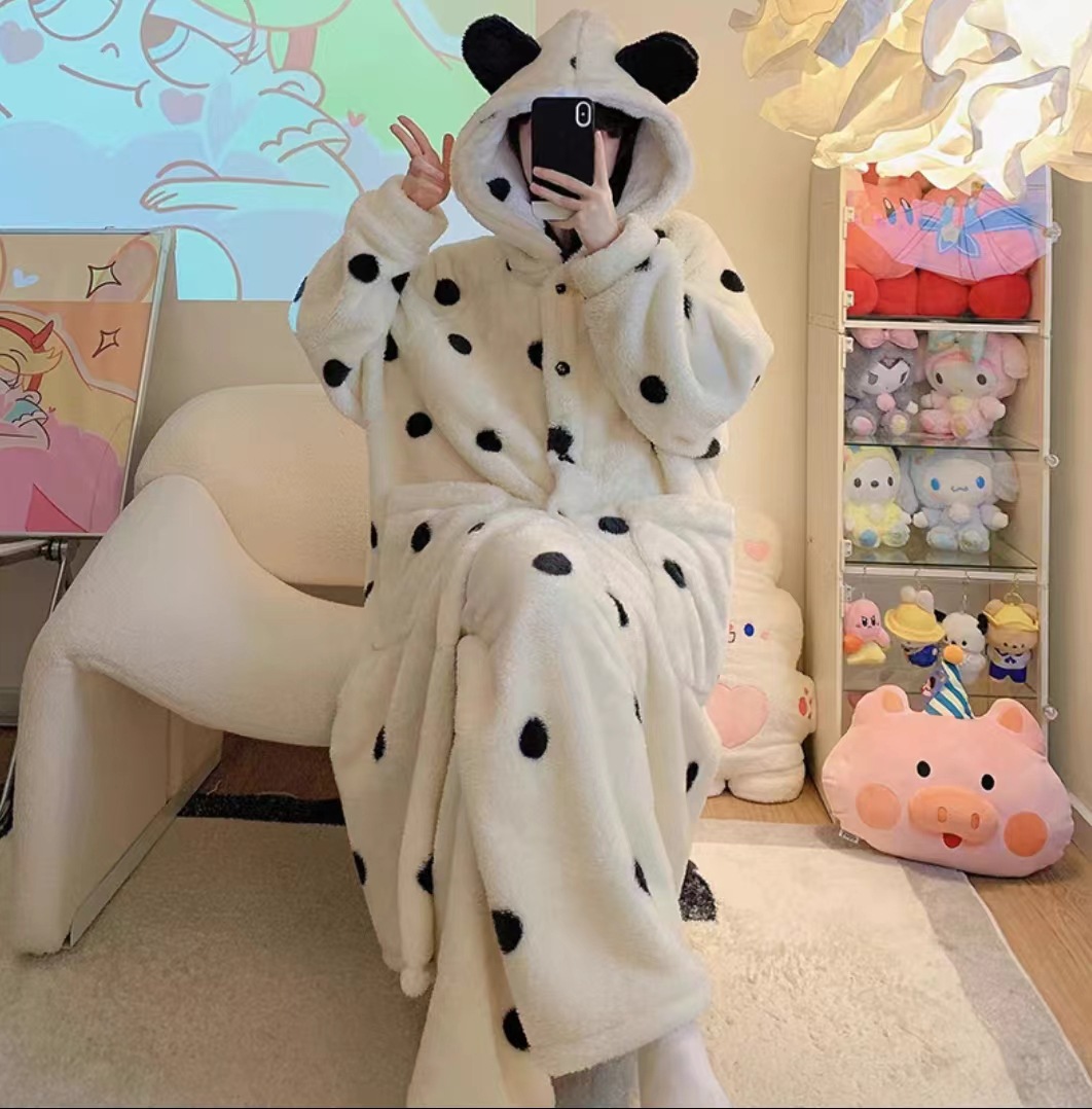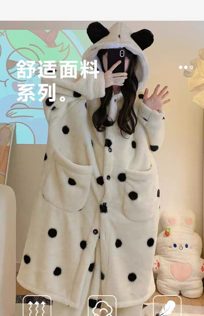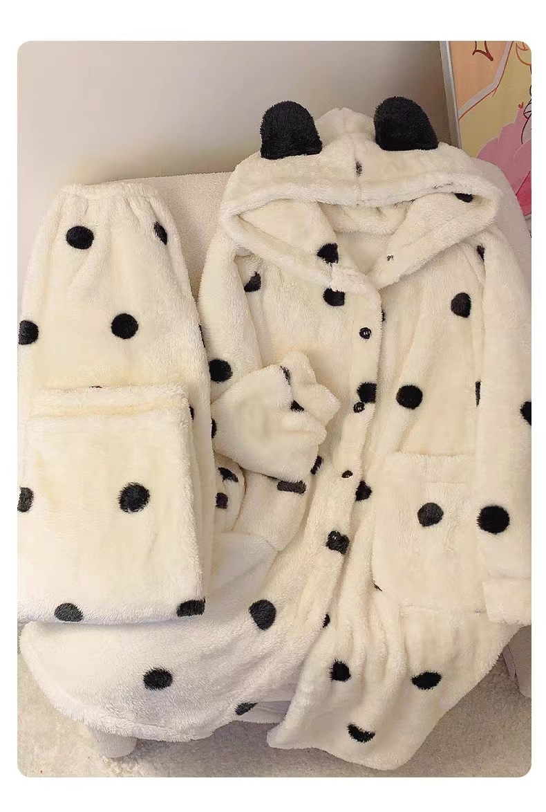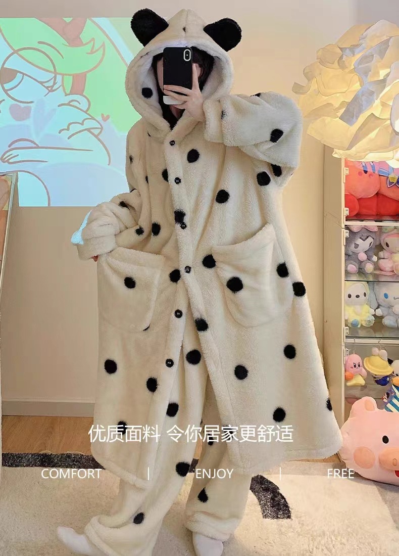 雀说 波点睡袍睡衣女秋冬新款法兰绒家居服珊瑚绒加厚长款甜美公主套装ALW 24007-1