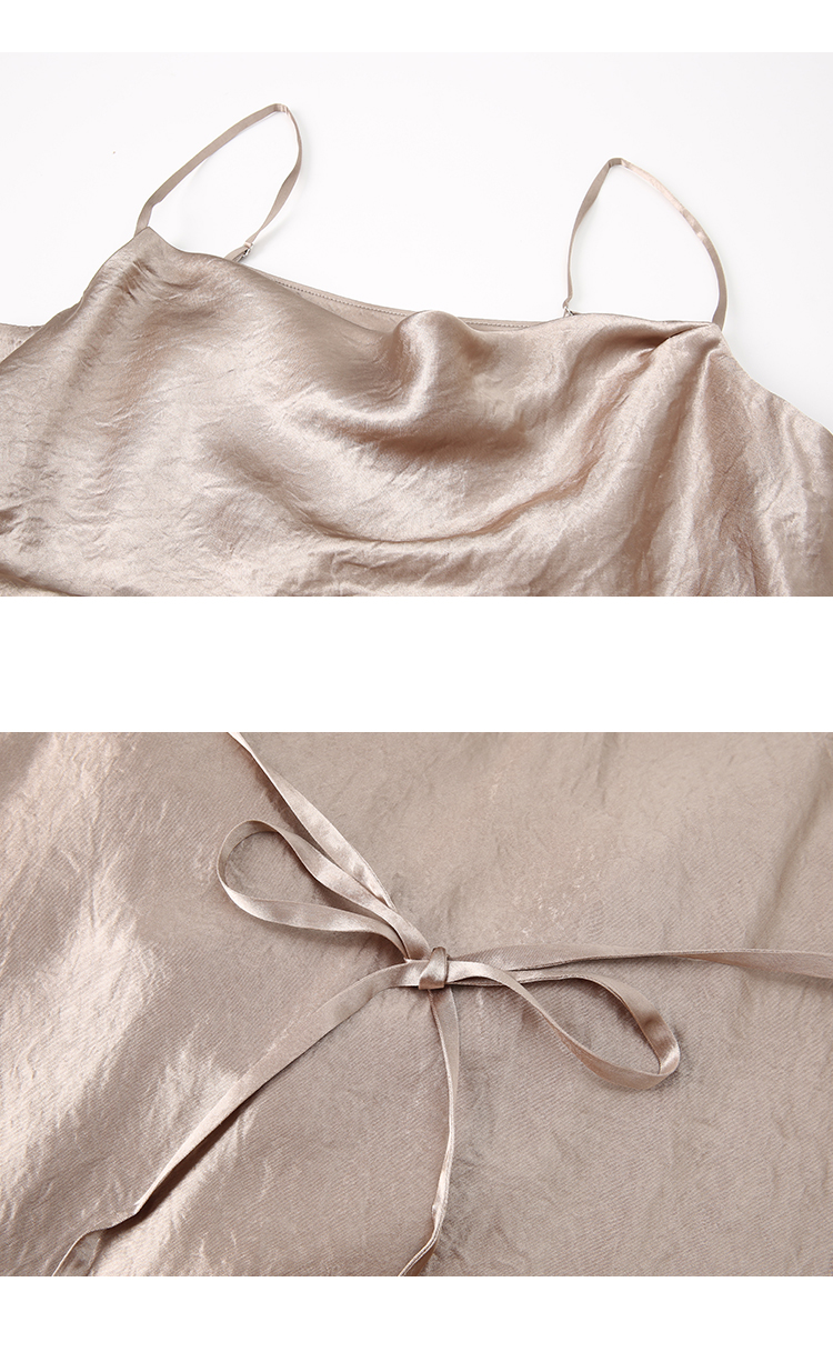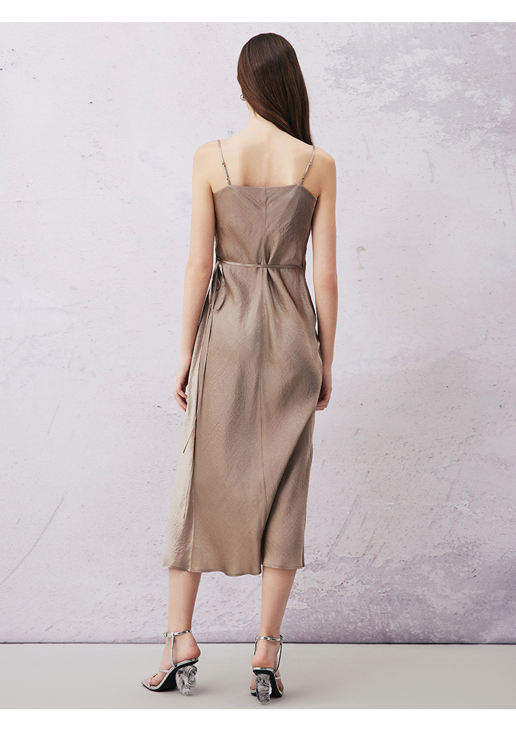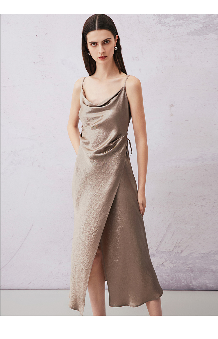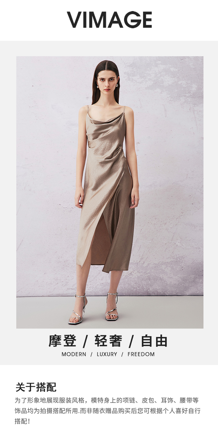 VIMAGE纬漫纪夏季新款气质慵懒荡领系带围裹开叉醋纤吊带连衣裙V2107720