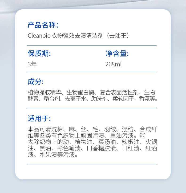 【清洁小帮手】cleanpie衣物qiang效去渍清洁剂 一瓶解决多种油渍柔顺呵护小巧身形设计