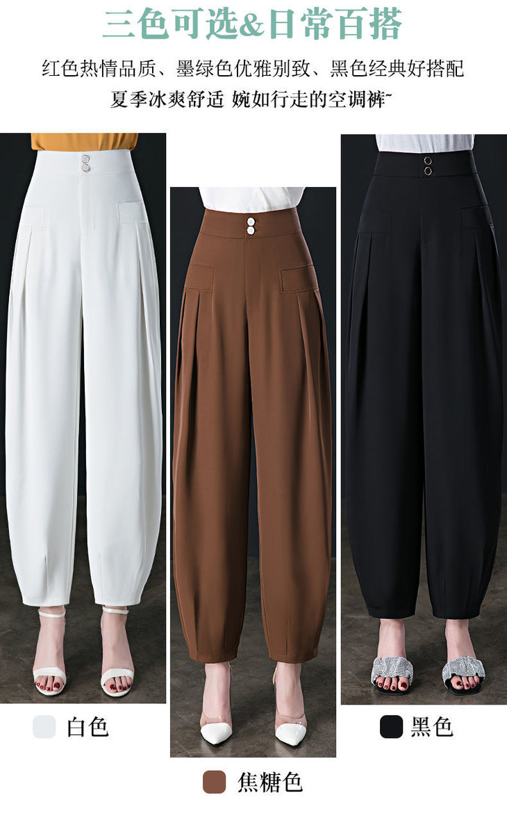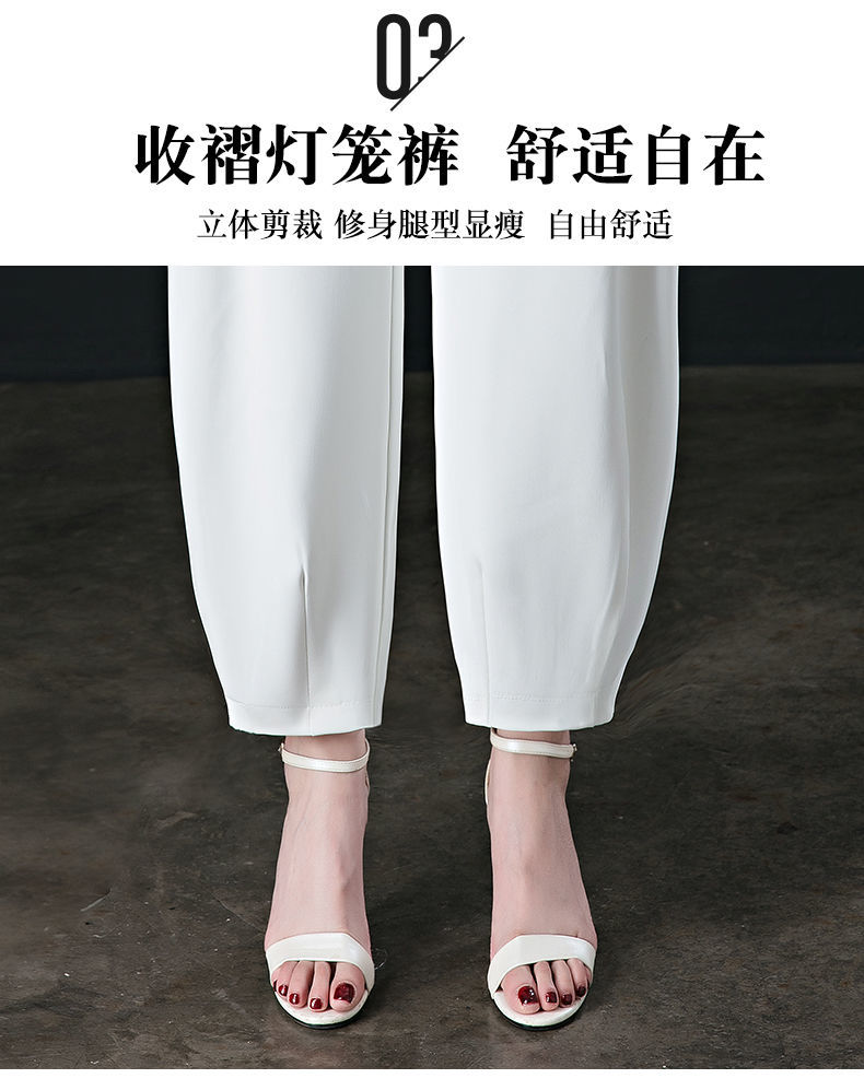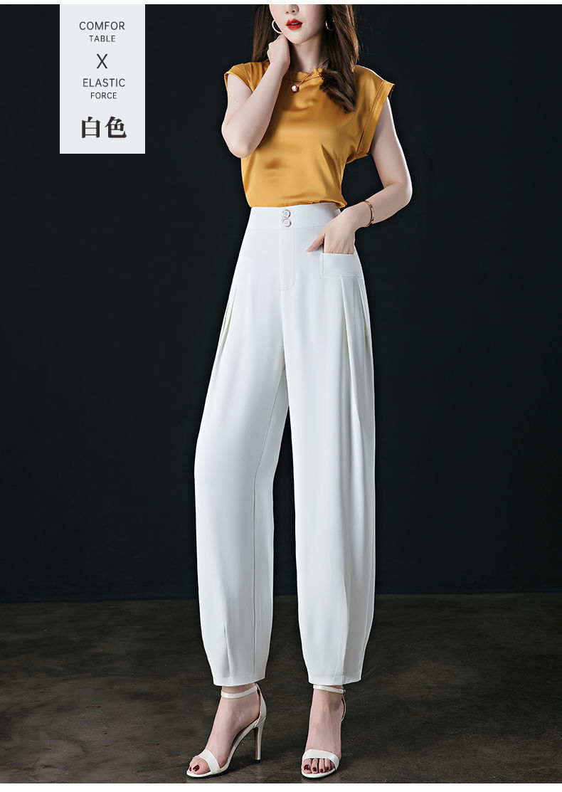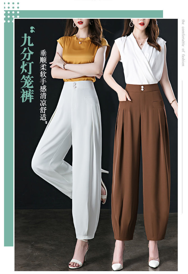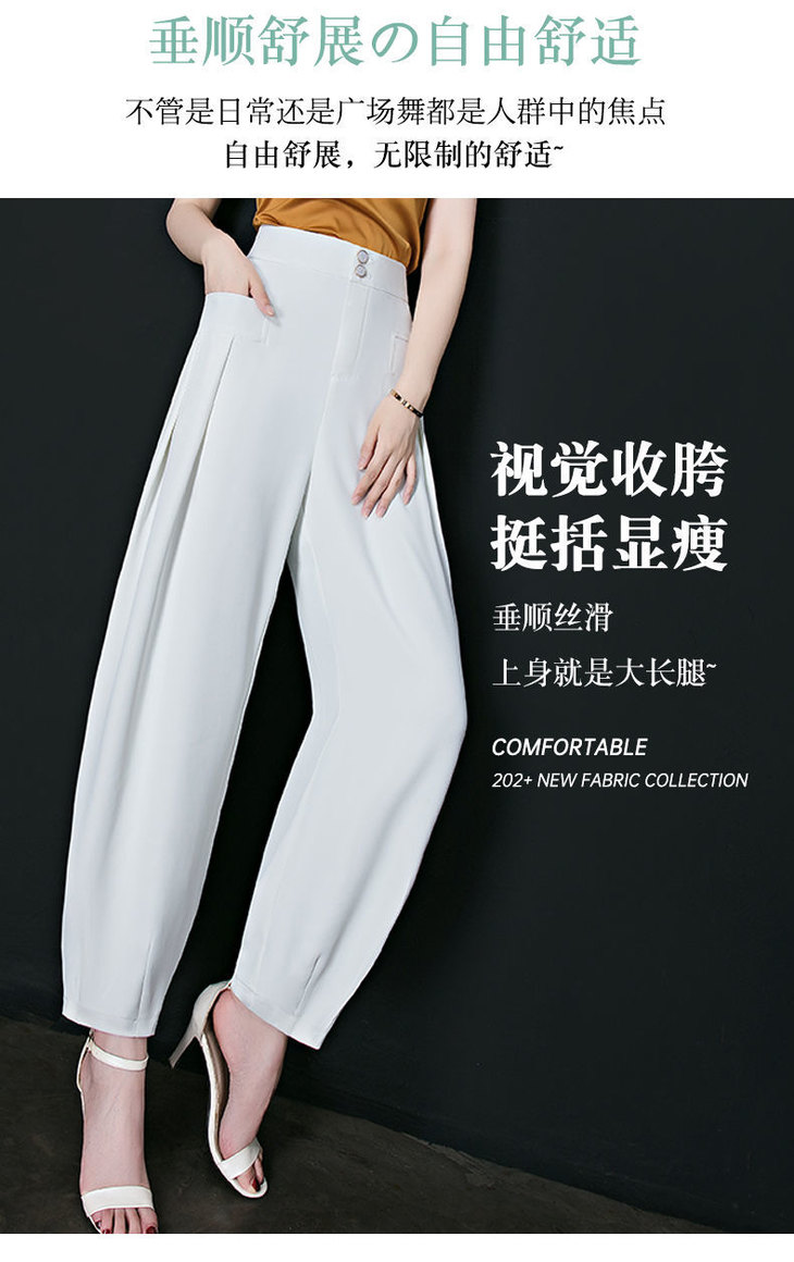 TZW-夏季薄款高腰休闲九分灯笼裤垂感时尚白色冰丝裤子