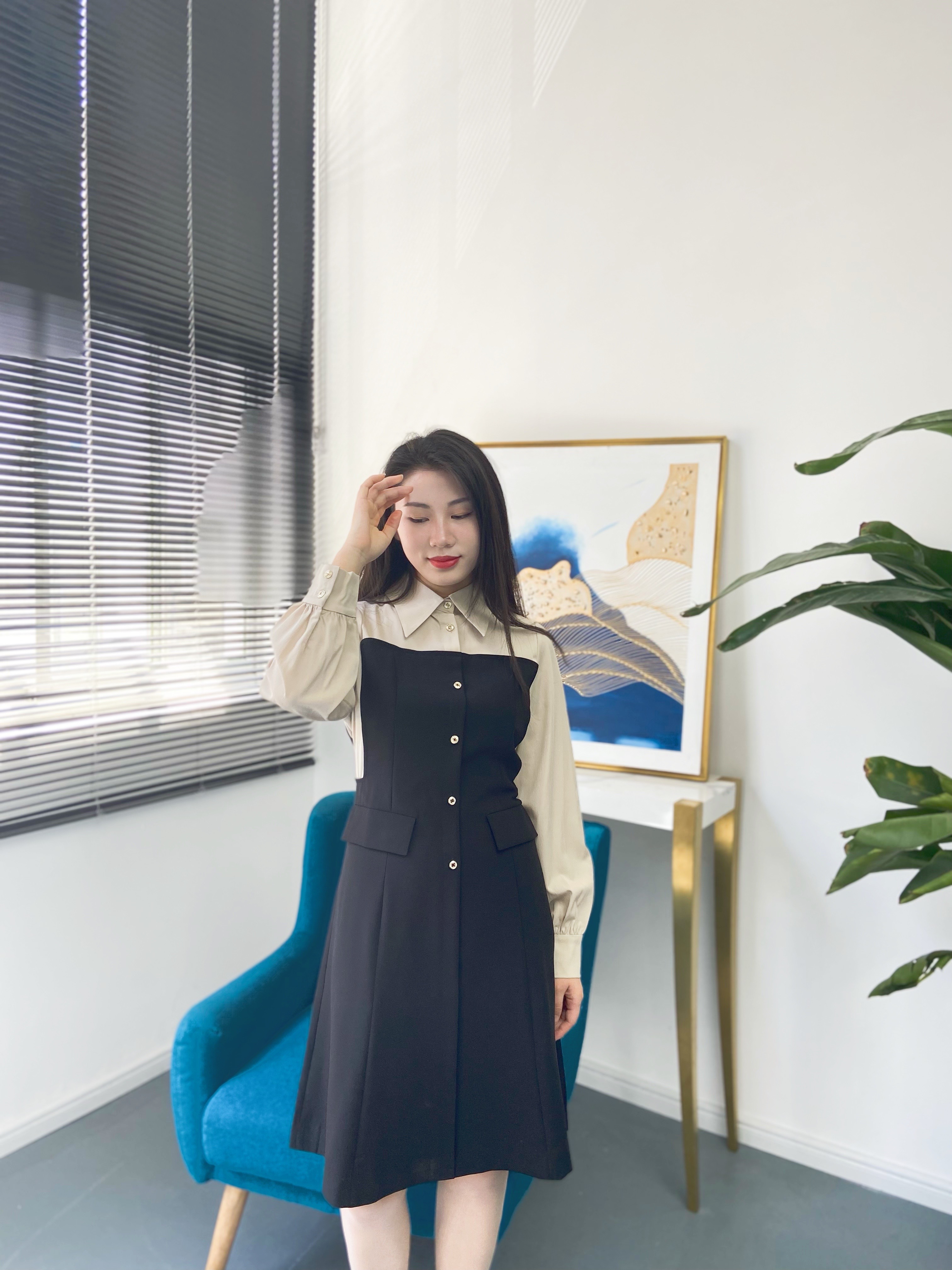 臣禾撞色单排扣设计显瘦连衣裙K221020702 现货