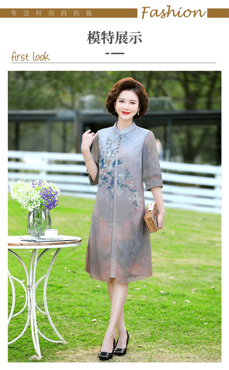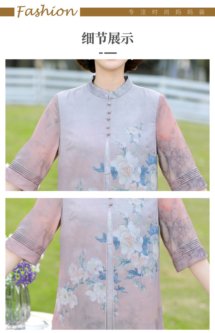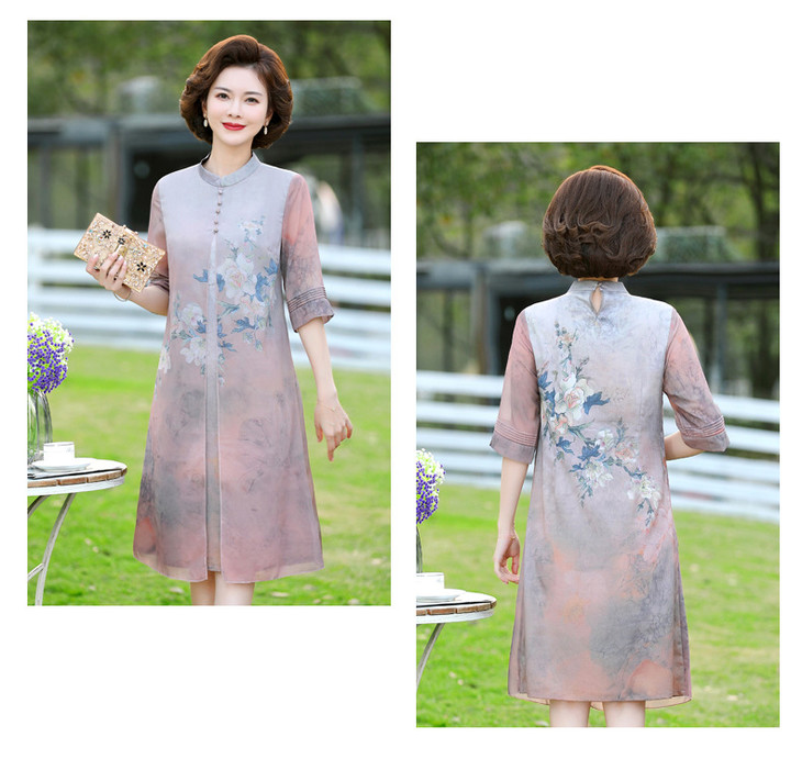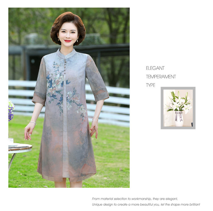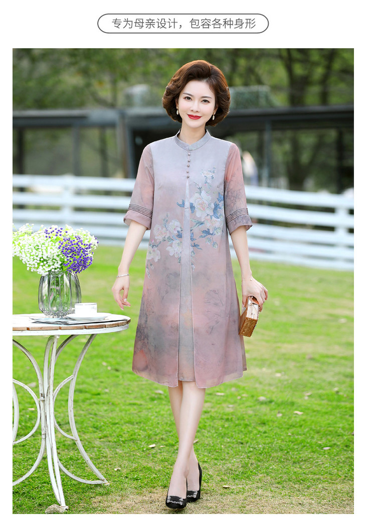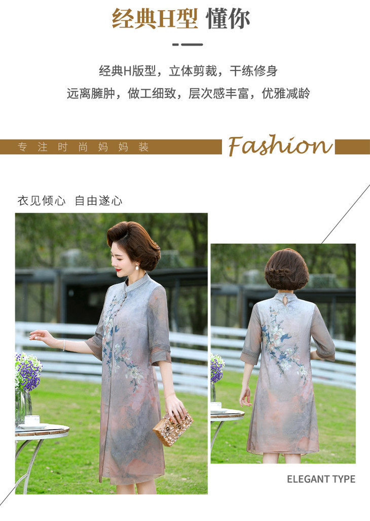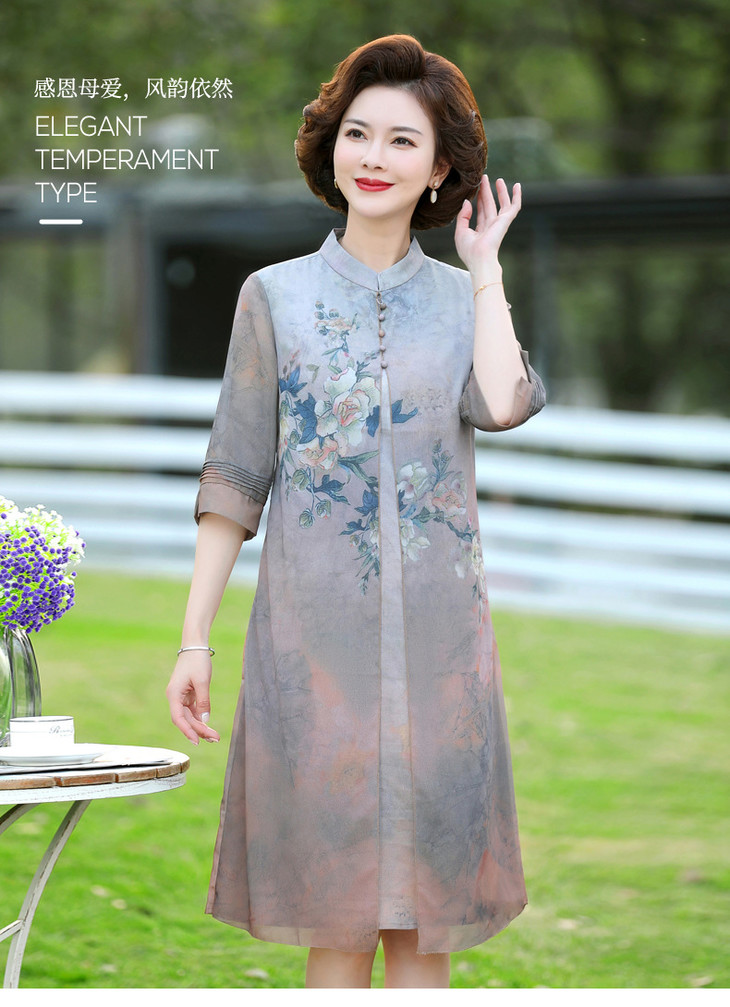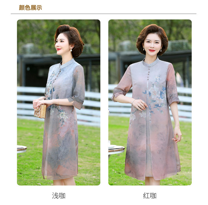 YJR-AA812新款优雅气质宽松立领五分袖拼接假两件印花雪纺连衣裙