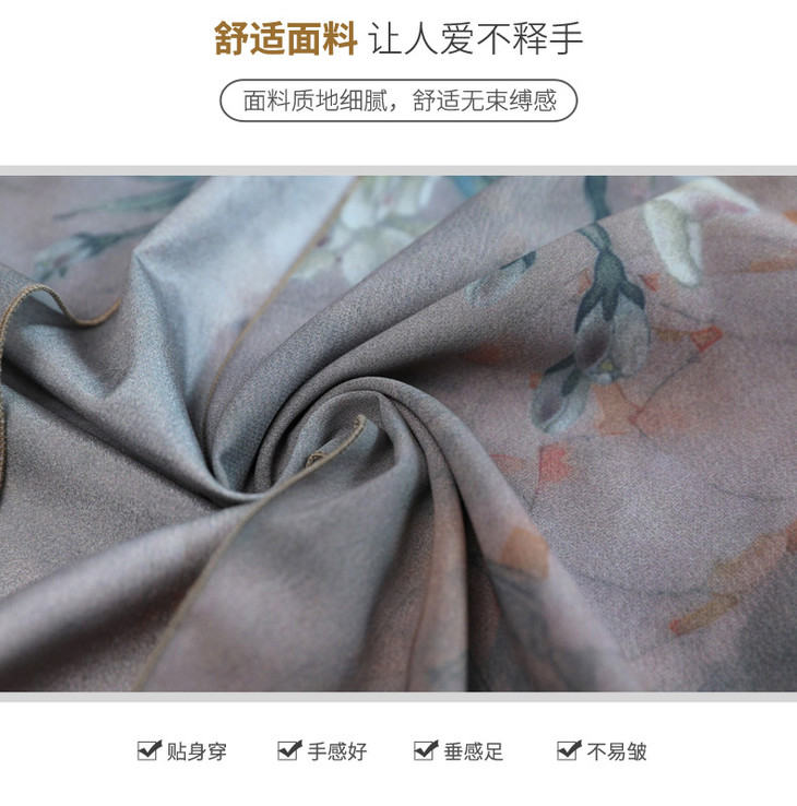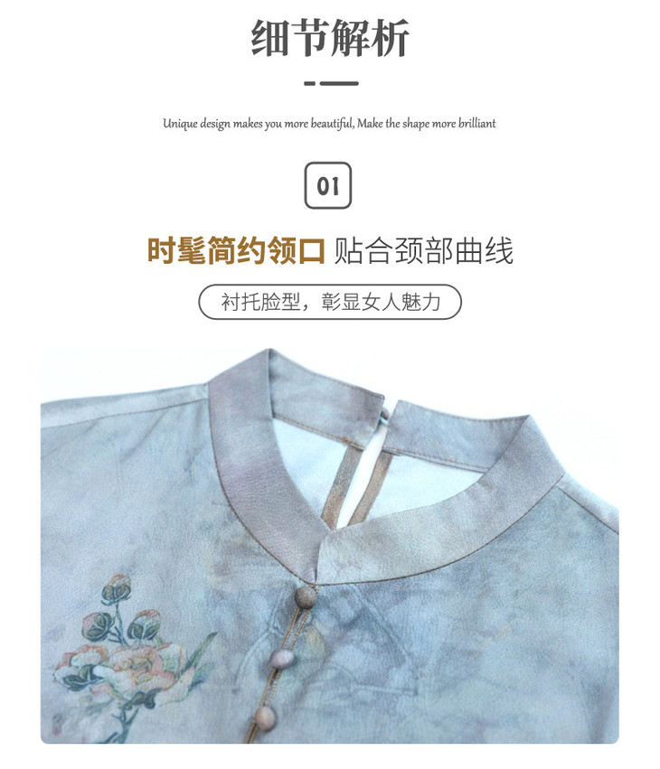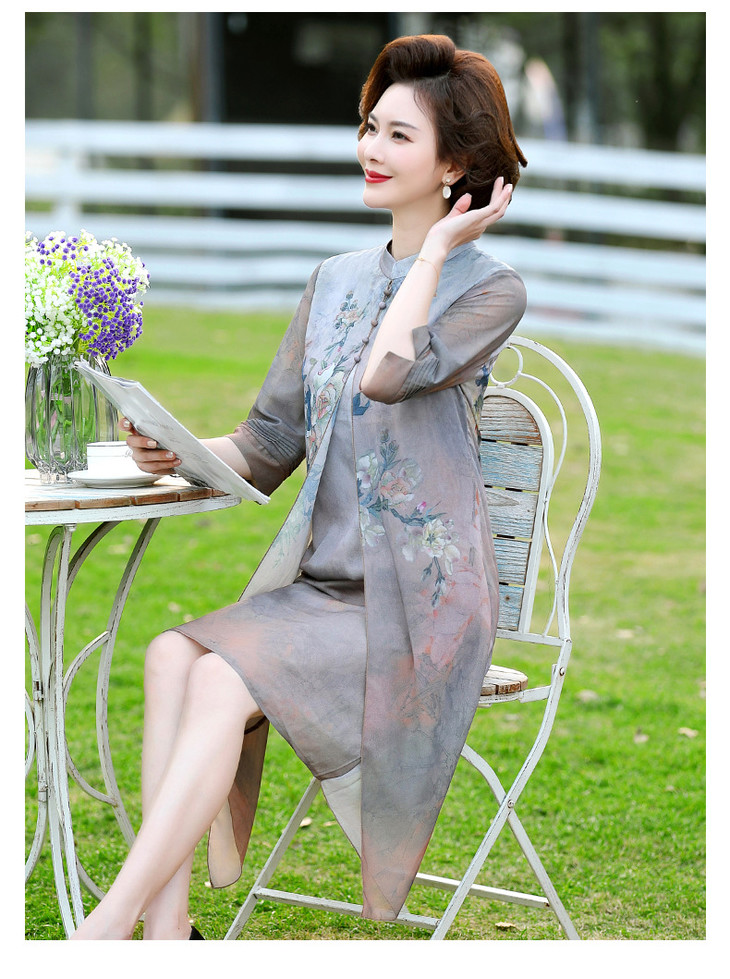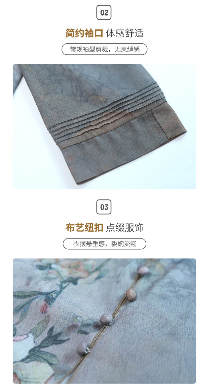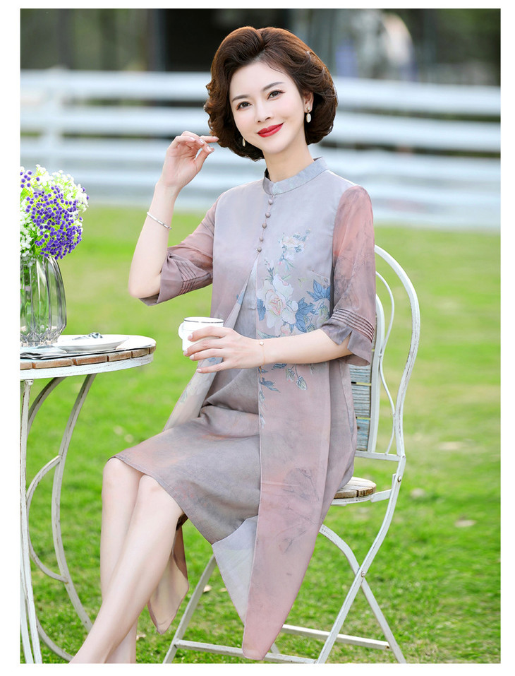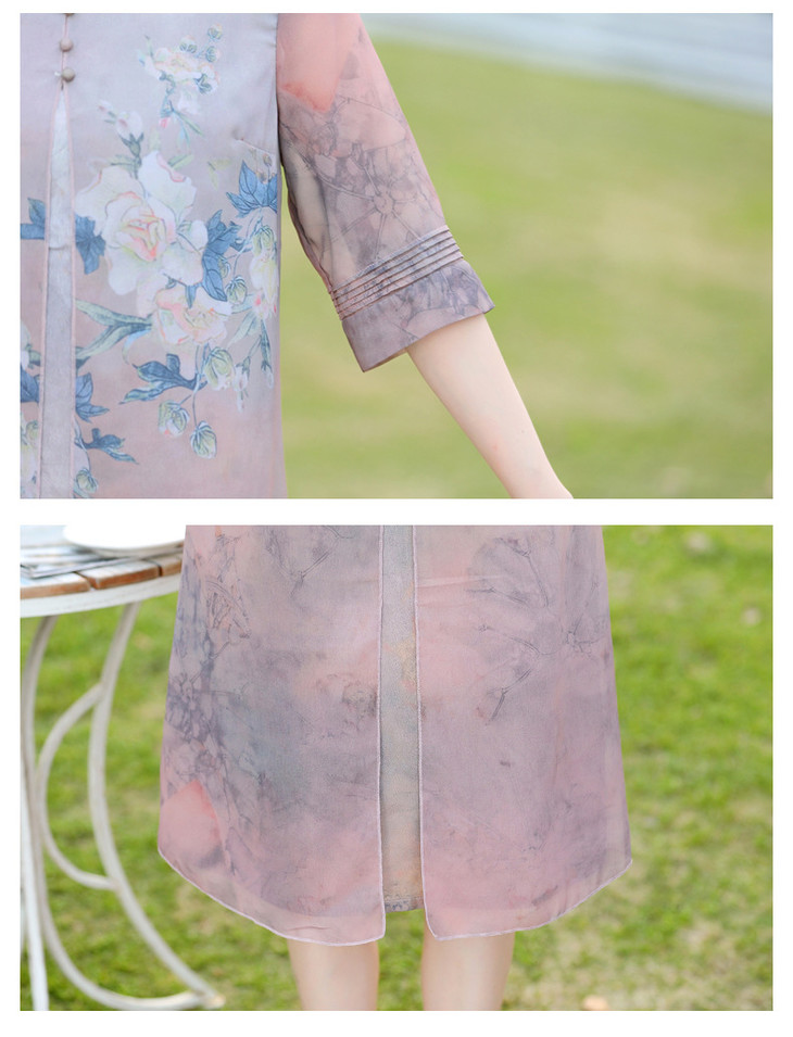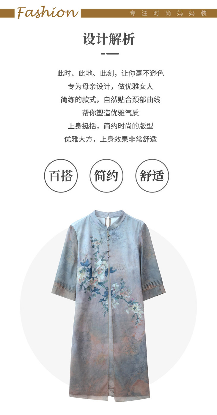 YJR-AA812新款优雅气质宽松立领五分袖拼接假两件印花雪纺连衣裙