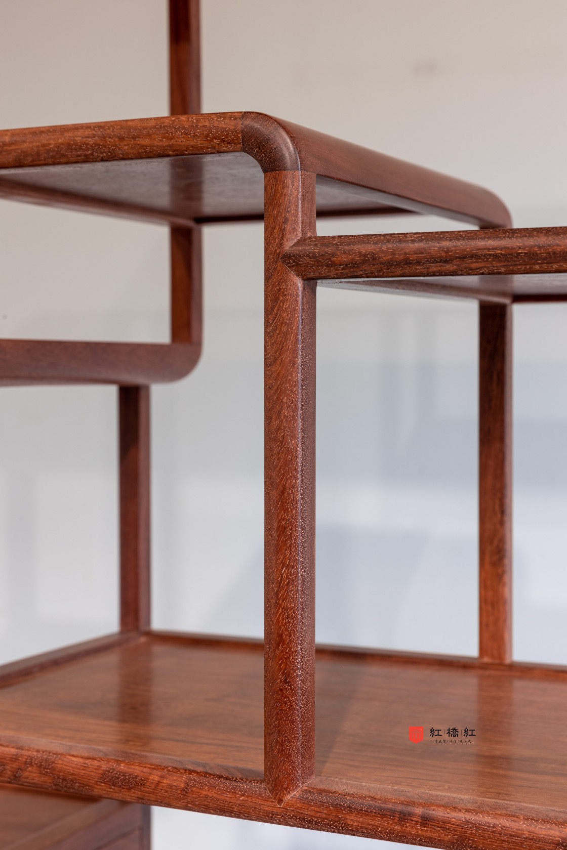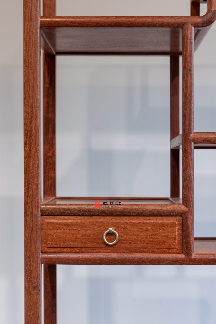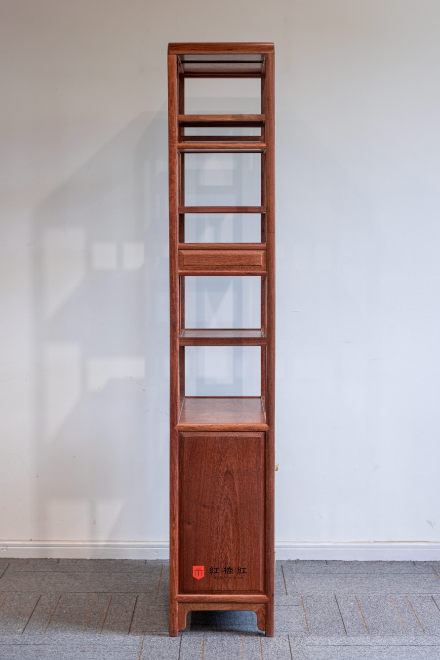 博古架外表俊秀,造型简洁,用材纤巧,全身光素,以宝格榫卯外向结合处做出大圆角,如扇面开合,抹去了方正器型的呆滞感,具有鲜明的明式文人家具气息。立足及横枨均用方材,看面倒出指甲圆,与整体造法呼应。