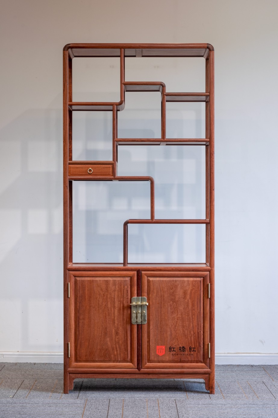 博古架搭配一柜一屉。柜沉底,三面饰素刀牙,落落大方;屉未及胸,纳雅物抽拉趁手。若置于文房、茶室,虚实静默,高山流水,存古赏今,怡然自得。