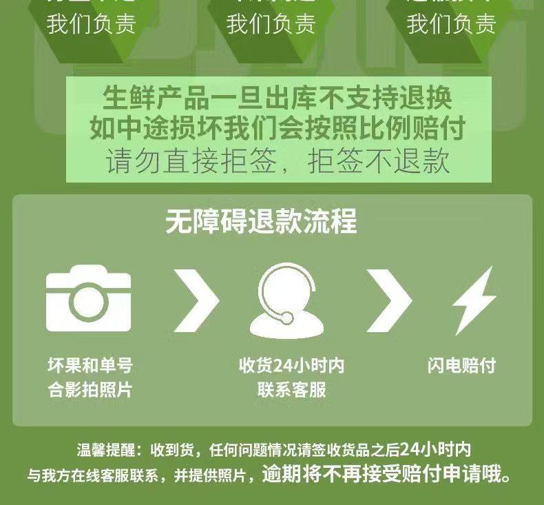 特别说明:由于生鲜水果市场价格波动较大,价保时间为:付款成功之后72小时之内联系客服有效,以付款成功的时间为准。