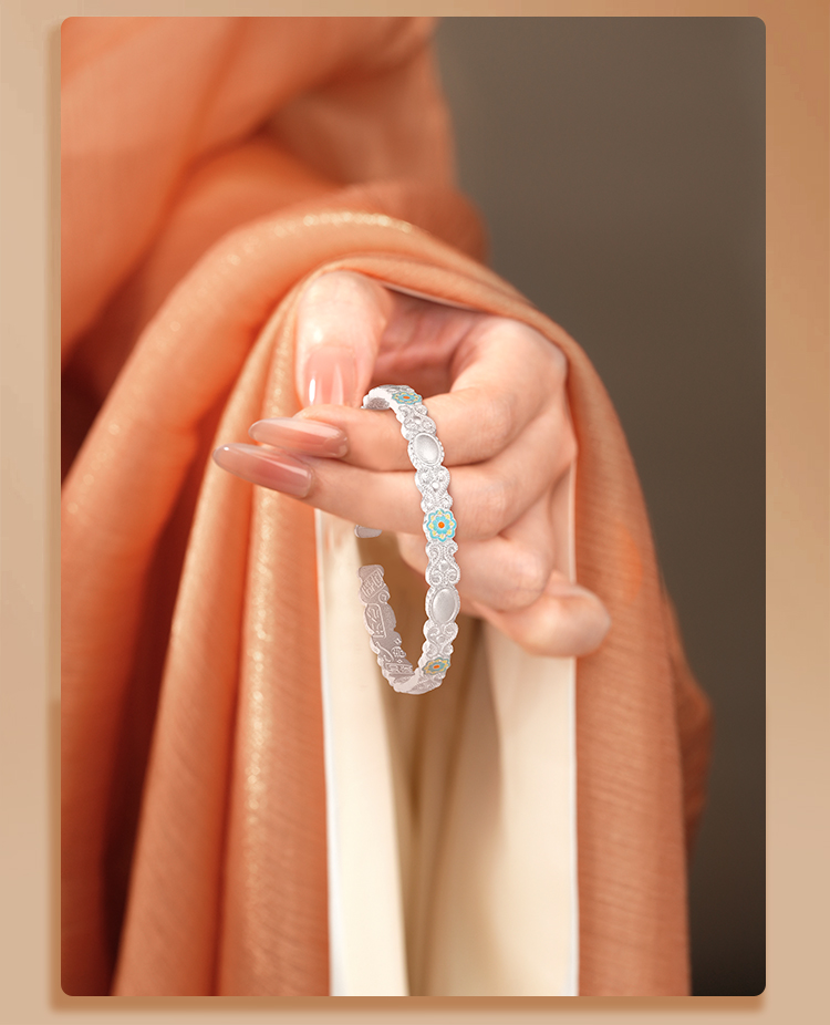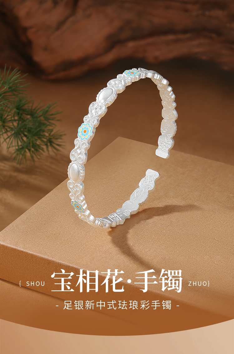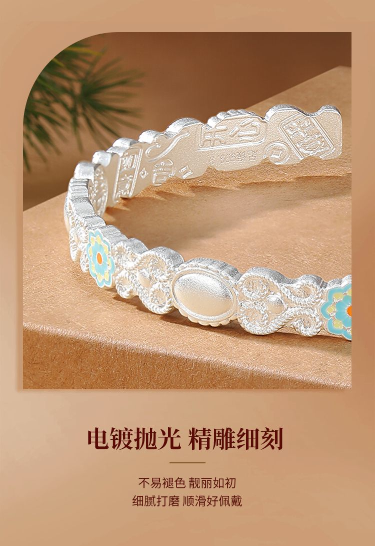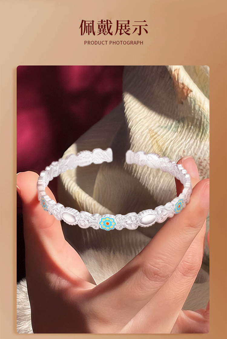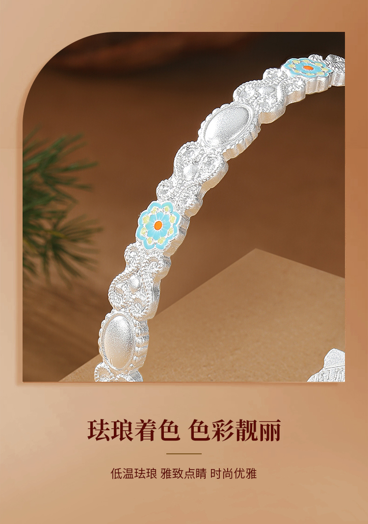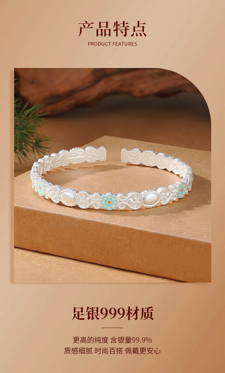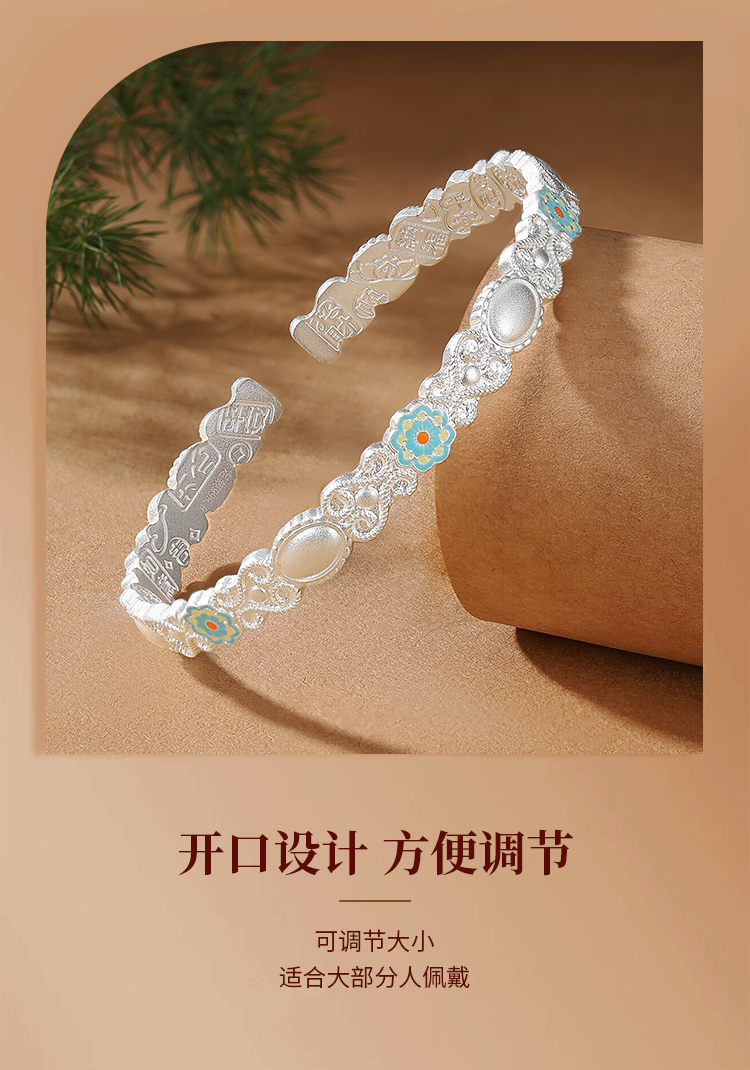 Winy 足银999 双花悦祥足银手镯 珐琅彩国风开口镯 送妈妈闺蜜生日节日礼物