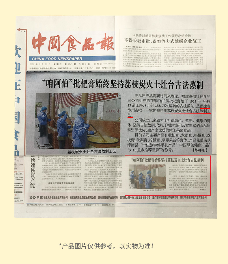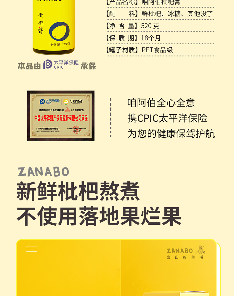 | 【品名】ZANABO咱阿伯枇杷膏 【规格】520g罐装/130g支装 【保质期】罐装18个月/支装12个月 【产地】福建漳州 【发货地】福建泉州 【发货快递】圆通 【不发货区域】新疆、西藏、港澳台地区不发 【补邮费地区】内蒙古、宁夏+10,北京+2元 【发货时效】48小时发货,周末节假日顺延 |
