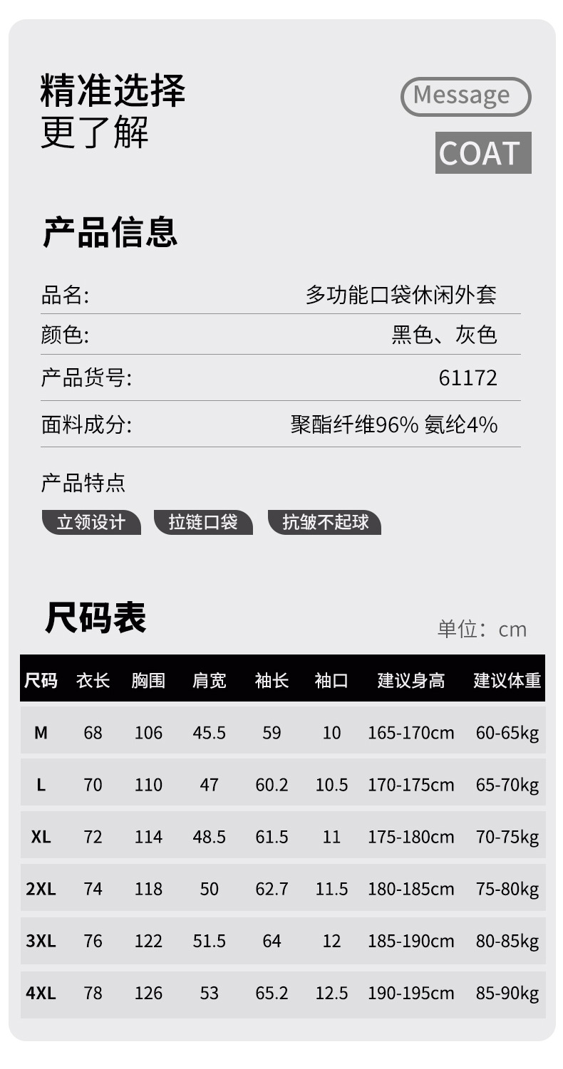 跃牌【PF系列】秋冬新款男士外套休闲运动多口袋上衣成熟修身商务夹克衫61172