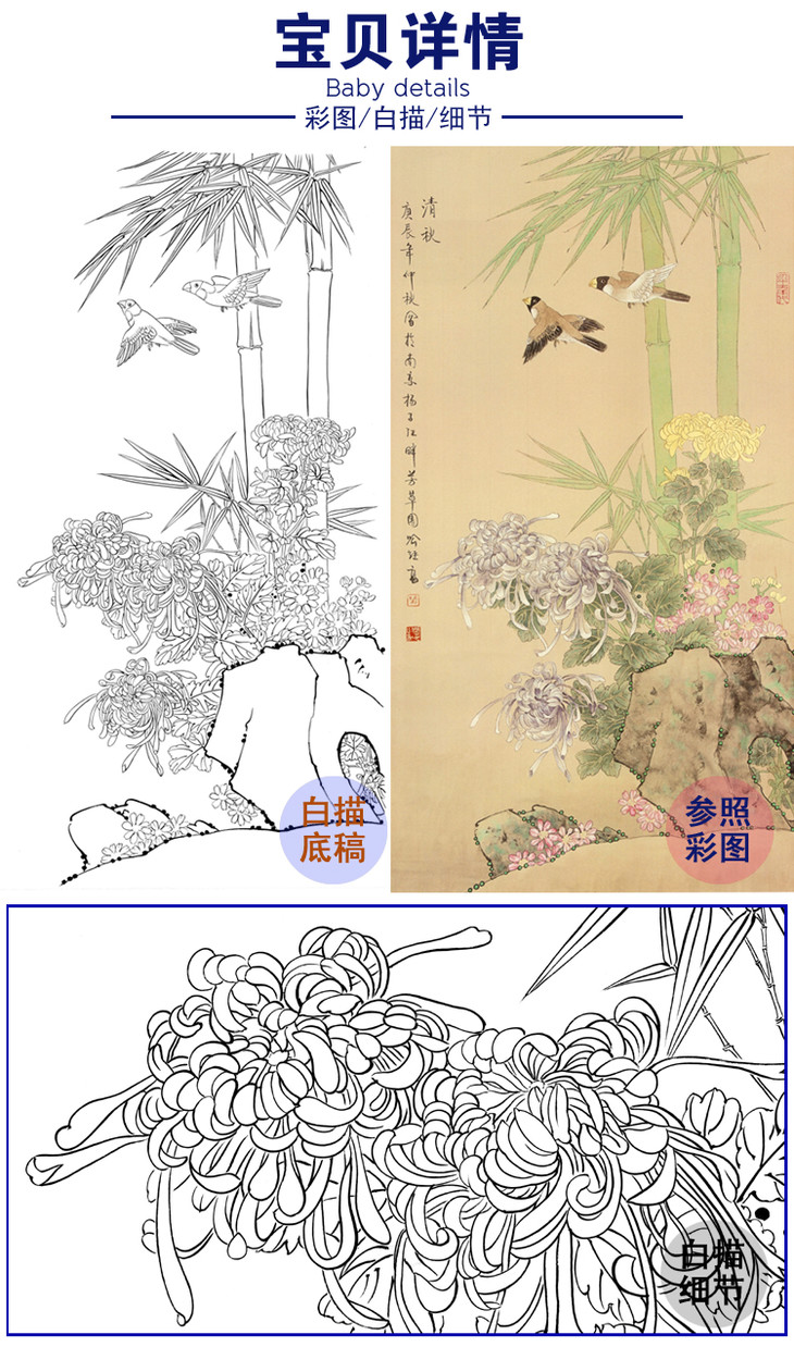 竖幅工笔花鸟白描底稿-喻继高-菊花竹子《清秋》-多种白描尺寸可选-A050