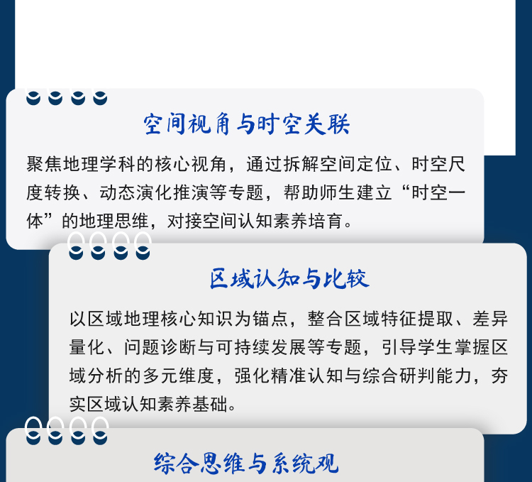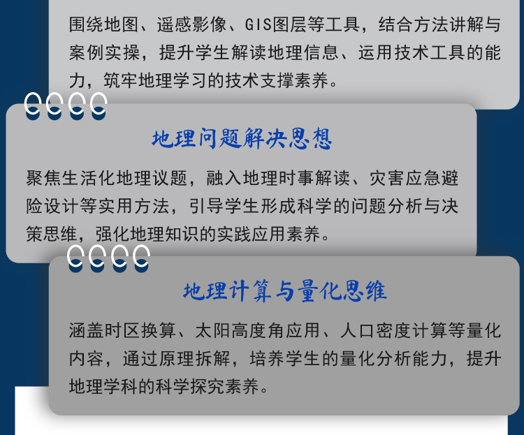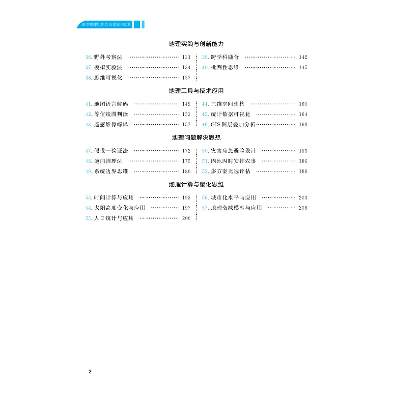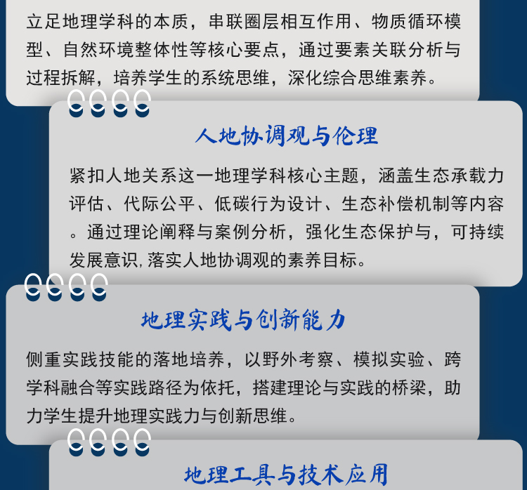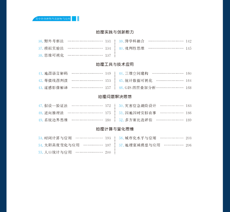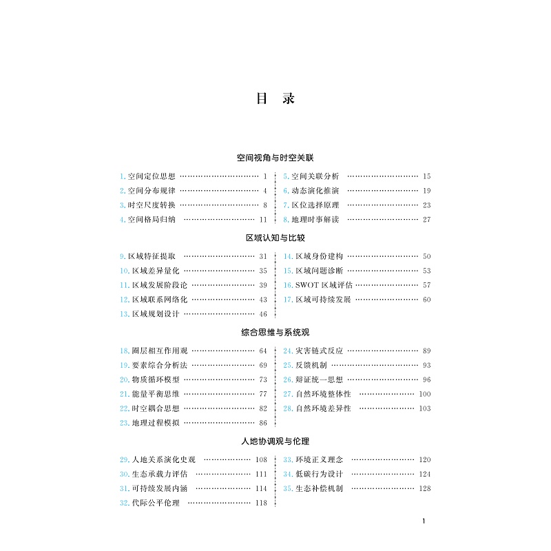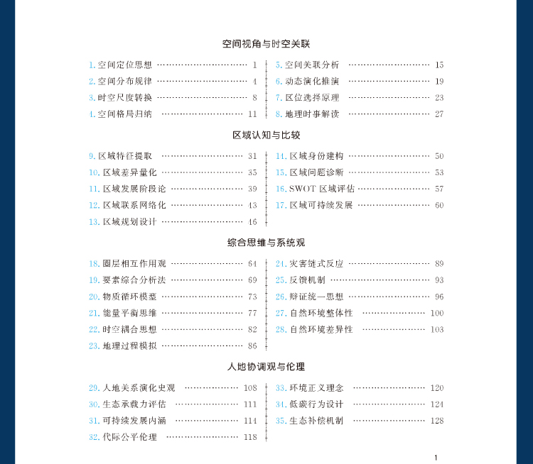 书稿围绕高中地理学科素养的培养这个核心,落实立德树人、能力立意,把高中地理的学科知识点分为八个模块:空间视角与时空关联、区域认知与比较、综合思维与系统观、人地协调观与伦理、地理实践与创新能力、地理工具与技术应用、地理问题解决思想、地理计算与量化思维。每个模块中分述5—10个思想,分别从历史、现状、演变等地理问题解决角度,阐述学习地理知识所应具备的思想,如“东北工业基地衰退症结”“碳足迹与减排方案”“城市群点轴结构”等实际问题和人类命运共同体理念的实践,将地理学科更多地与现实应用结合起来。