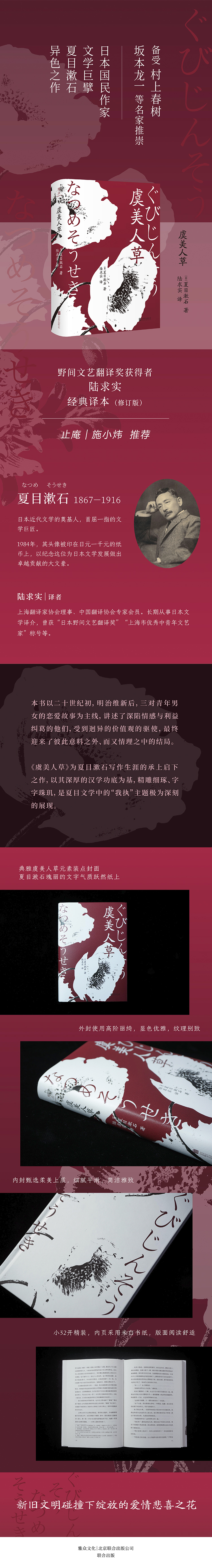 2、本书译者为翻译家、野间文艺翻译奖获得者陆求实,是国人初次呈现的译本,遣词造句经过精心打磨,深受读者赞誉。本次经过全新修订,译本更趋完善,很好地呈现了夏目漱石带有浓厚幽默讽刺色调及浪漫色彩的优雅文字。