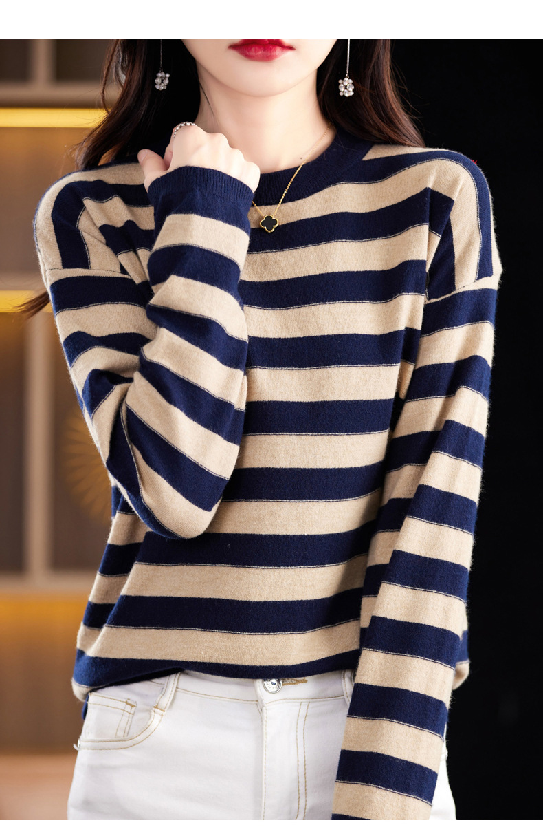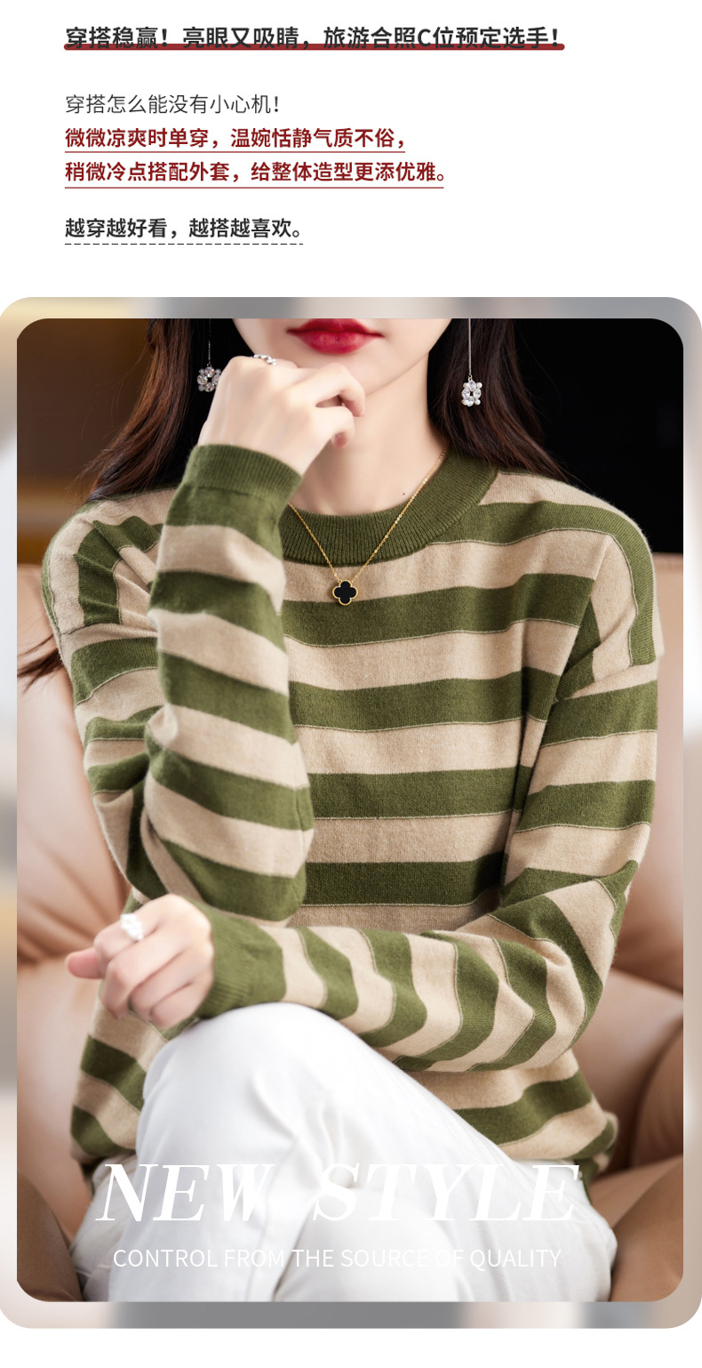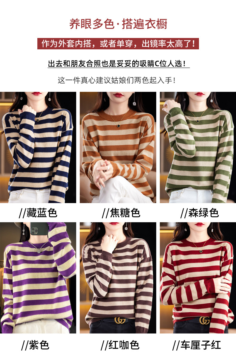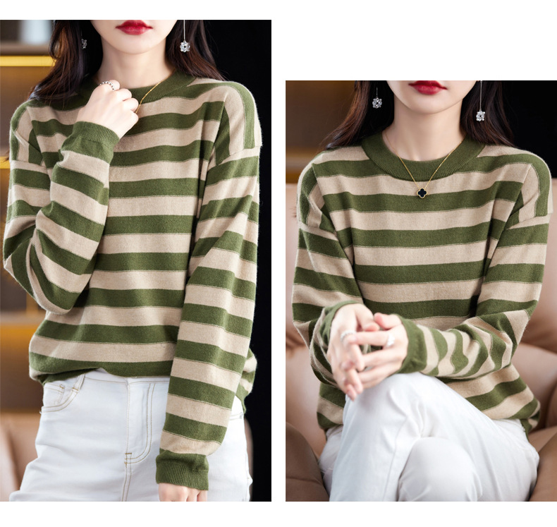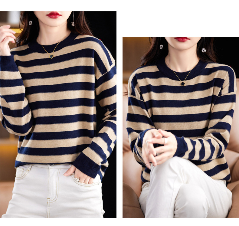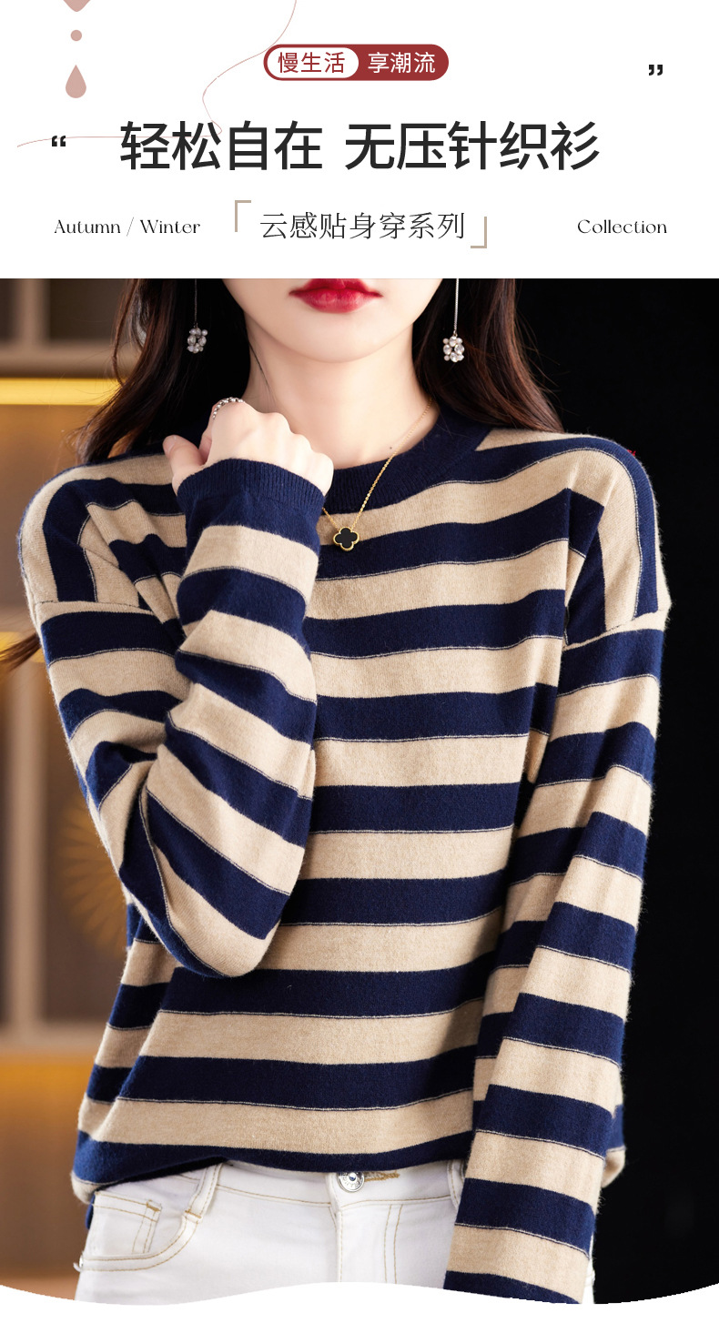 百媚生 条纹圆领针织衫落肩袖打底衫H330