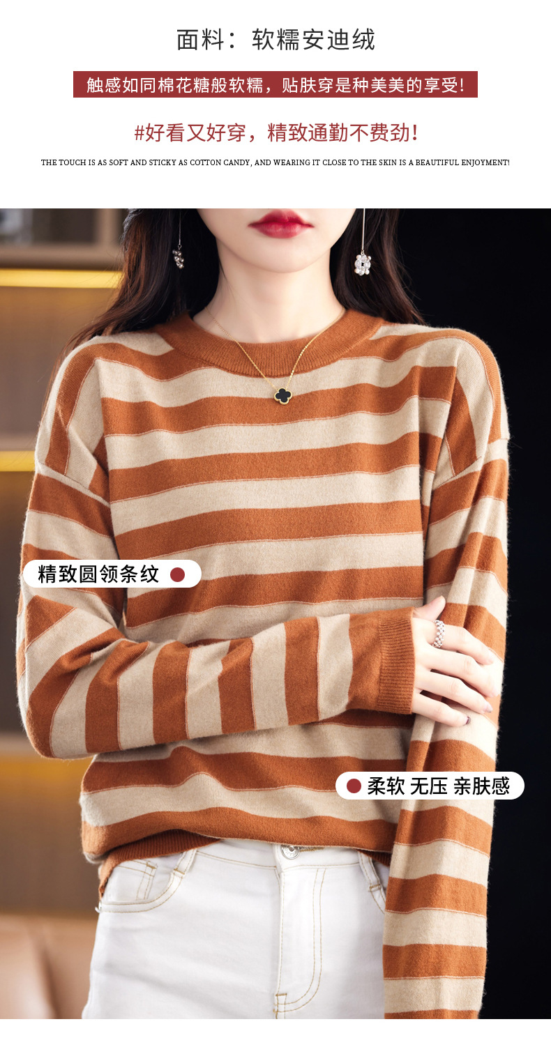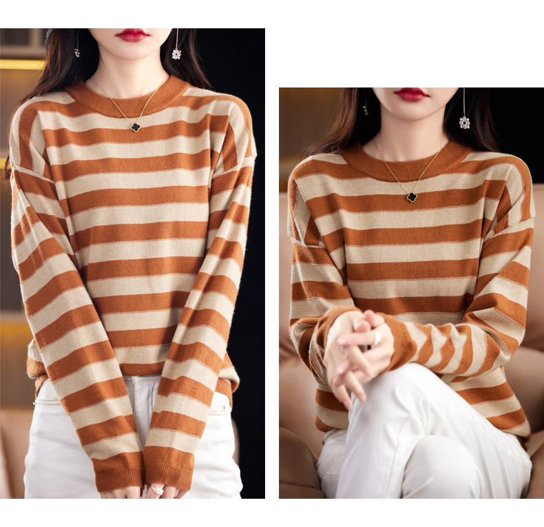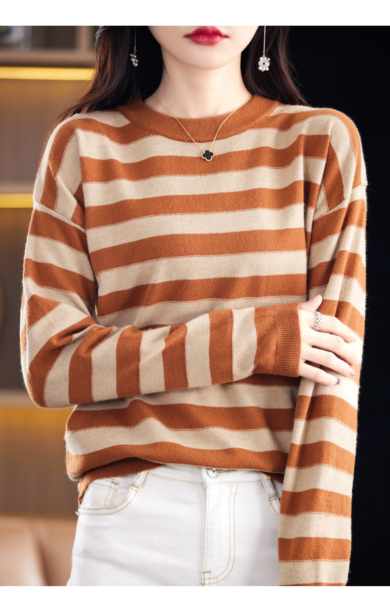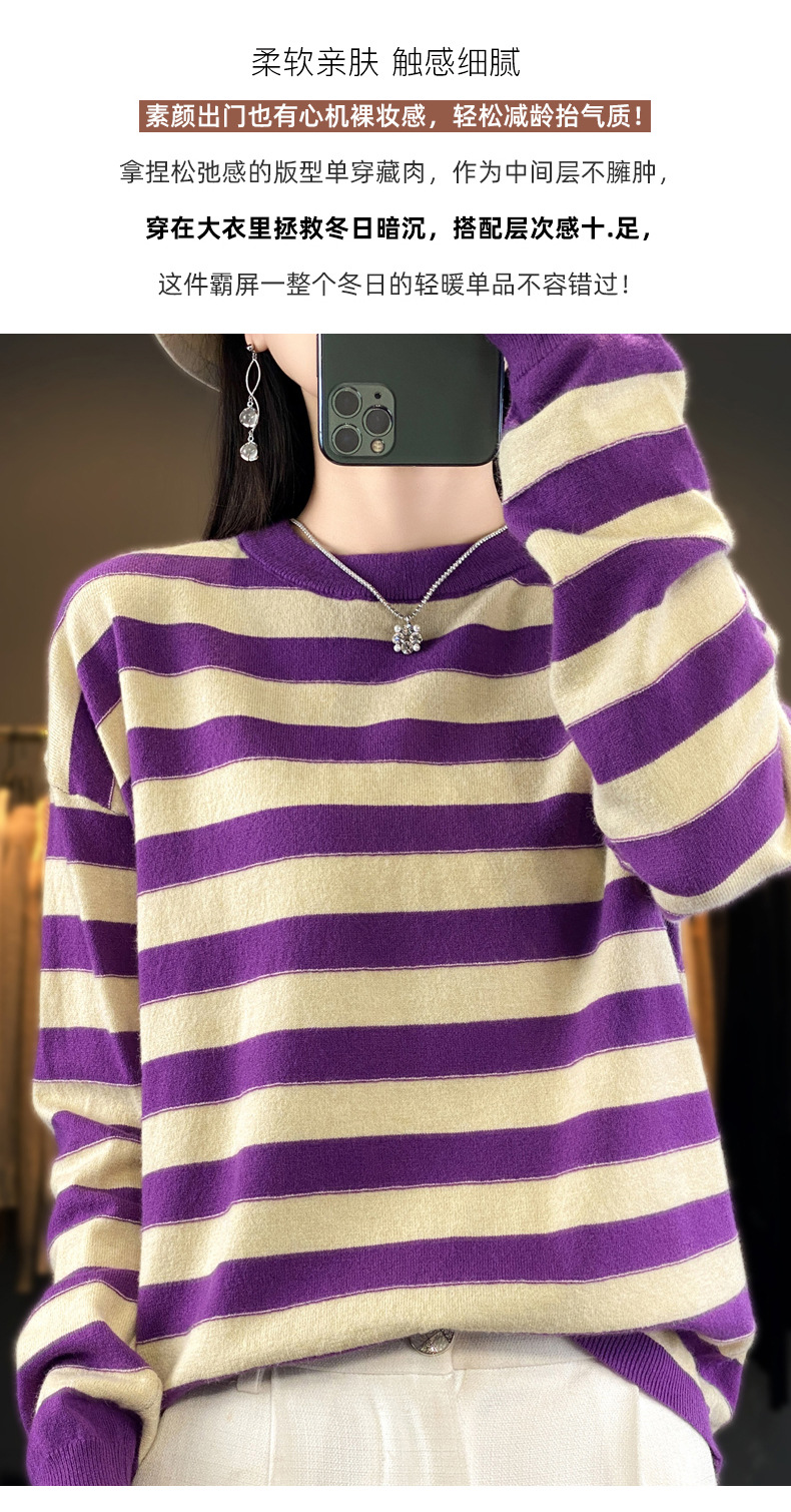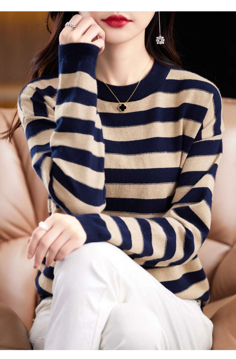 百媚生 条纹圆领针织衫落肩袖打底衫H330