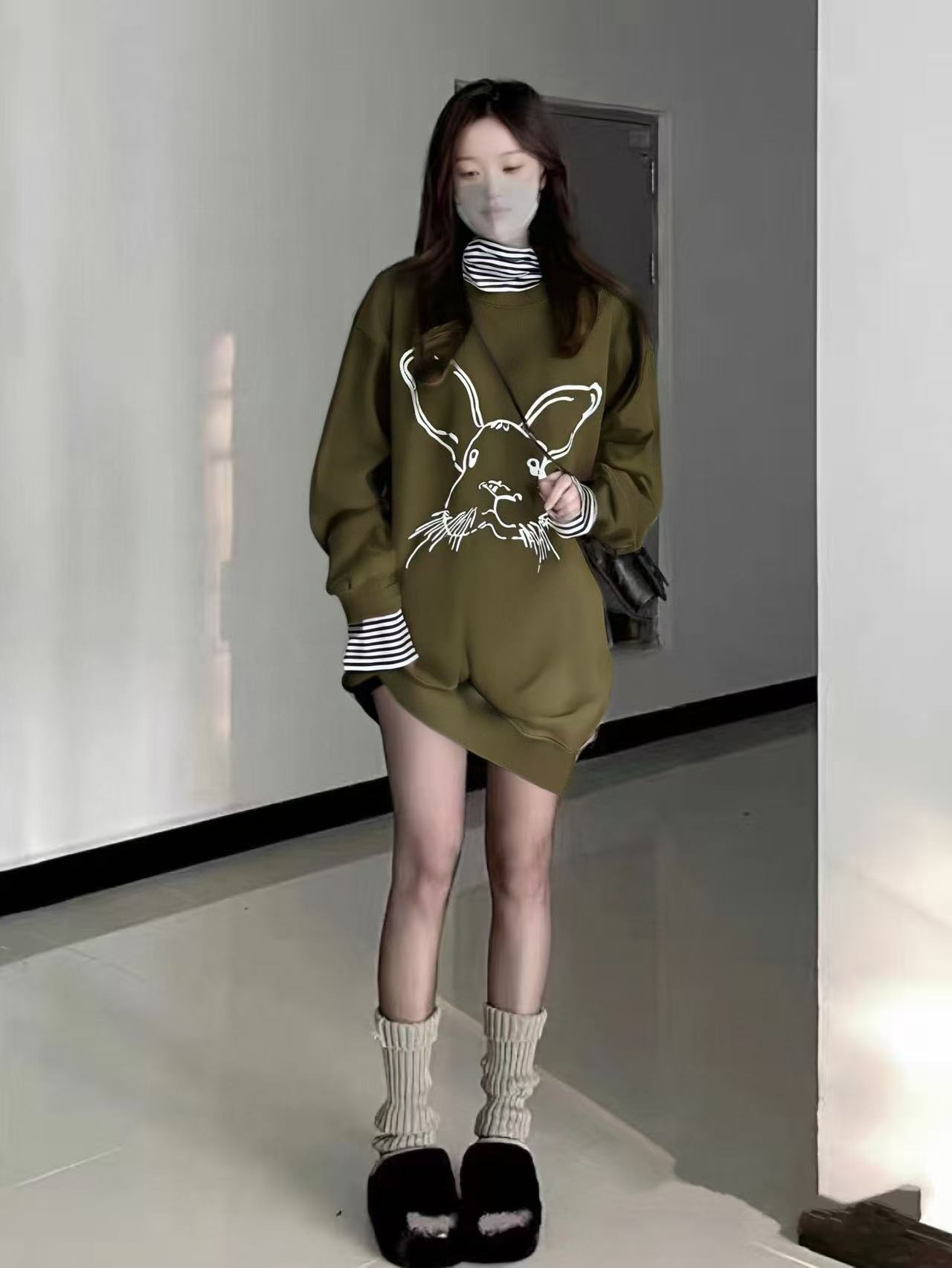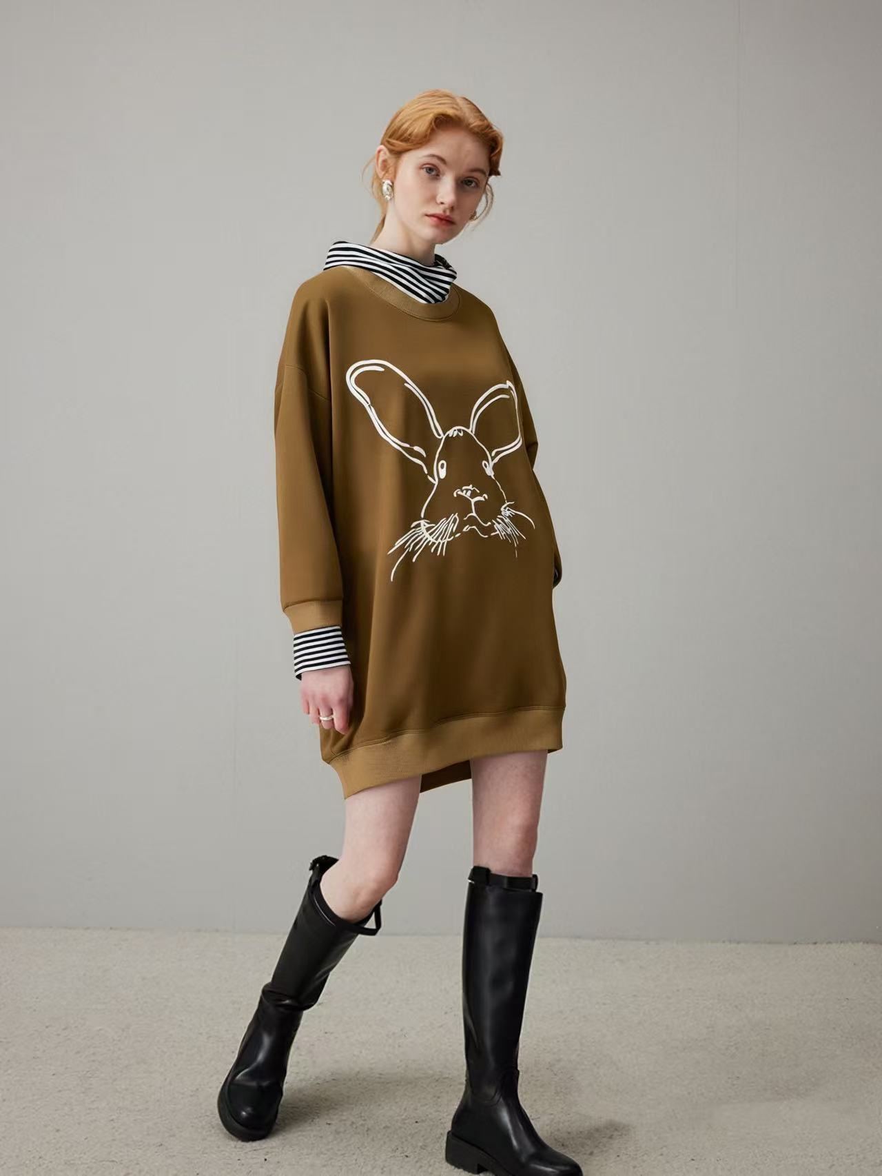 【诗铭洛可】045P卡通卫衣拼条纹假两件兔子中长卫衣A8-1