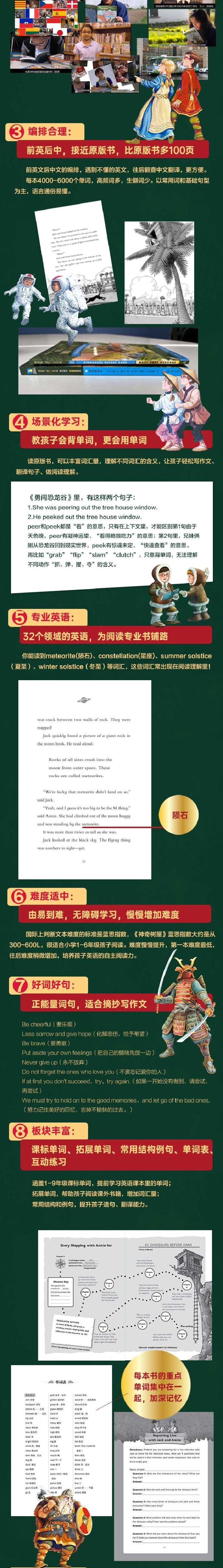 国际上判断文本难度的标准是蓝思指数,《神奇树屋》蓝思指数大约是从300~600L,很适合小学1-6年级孩子阅读。难度慢慢提升,一本难度Z低,往后难度稍微增加,培养孩子英语的自主阅读力。