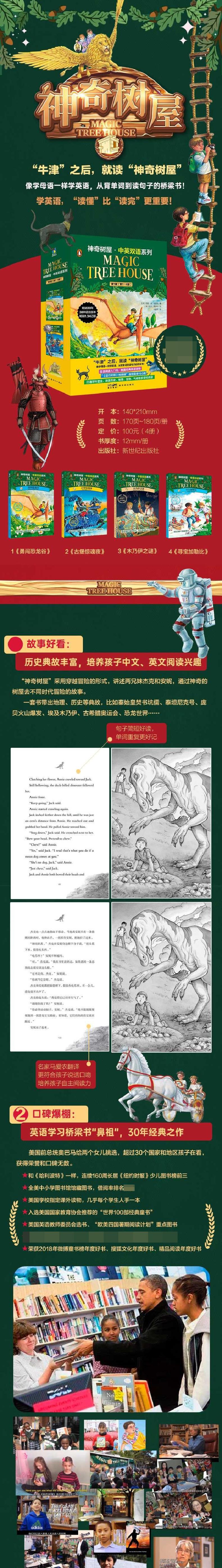 “神奇树屋·中英双语系列”全套32本,一共包括4本:《勇闯恐龙谷》《古堡惊魂夜》《木乃伊之谜》《寻宝加勒比》。
