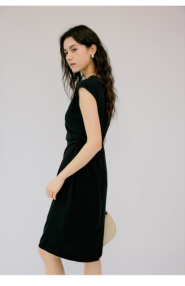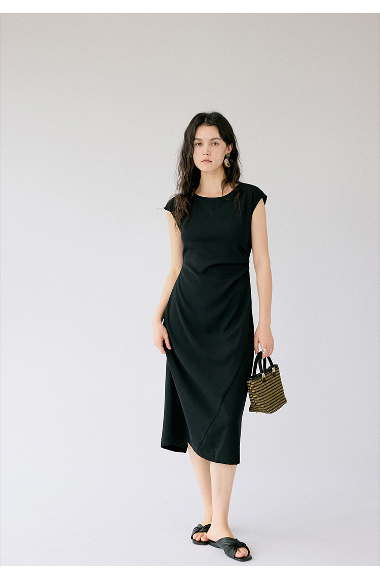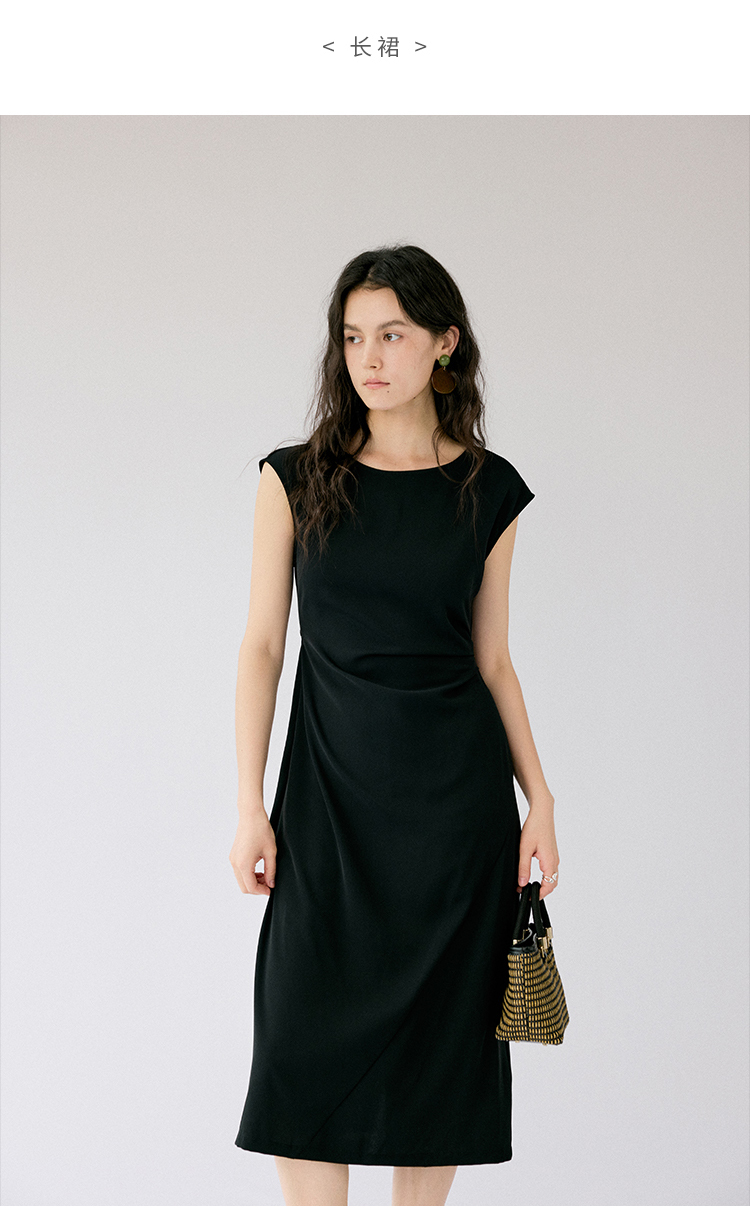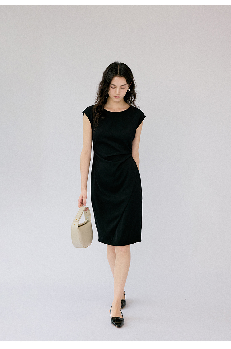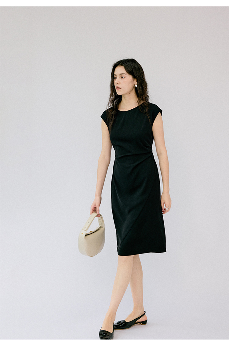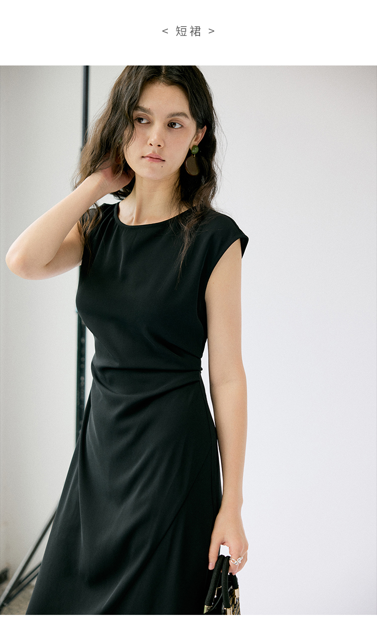 HeyDress法式连衣裙女夏季圆领收腰显瘦设计感宽肩袖通勤小黑裙子