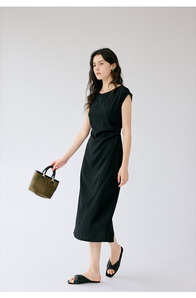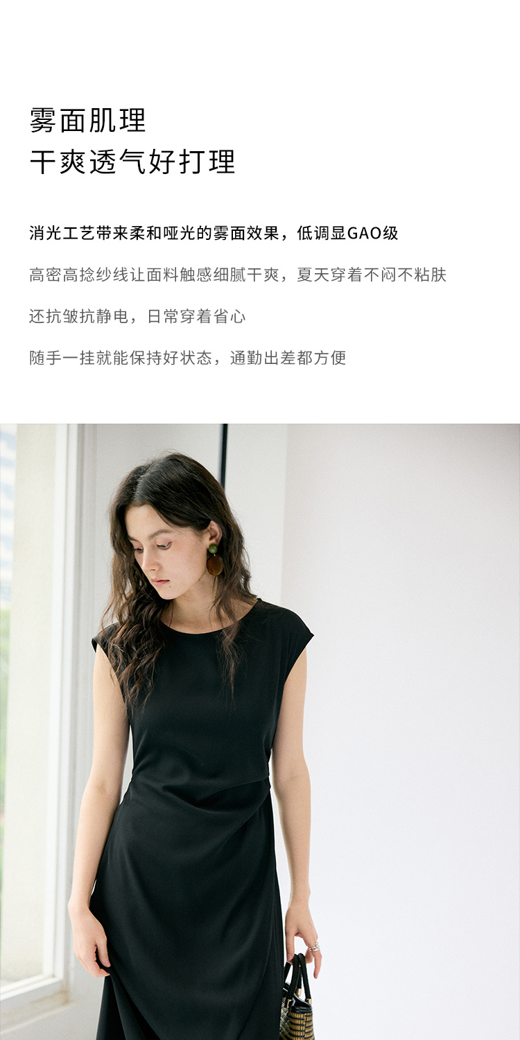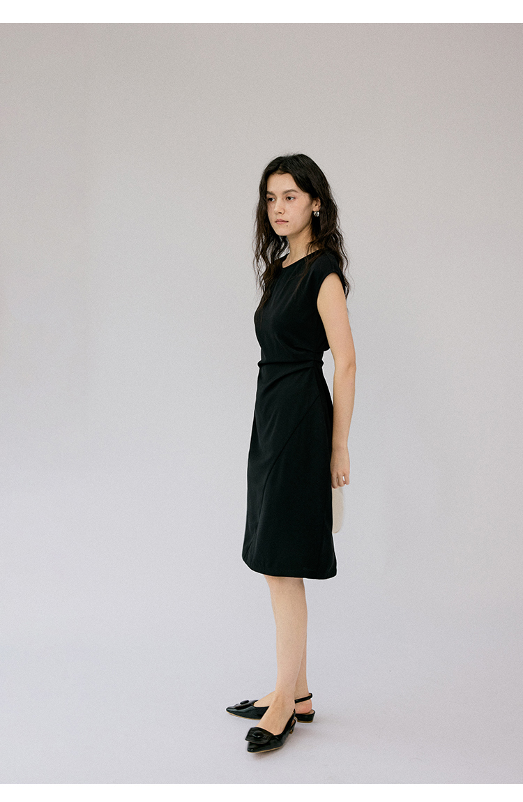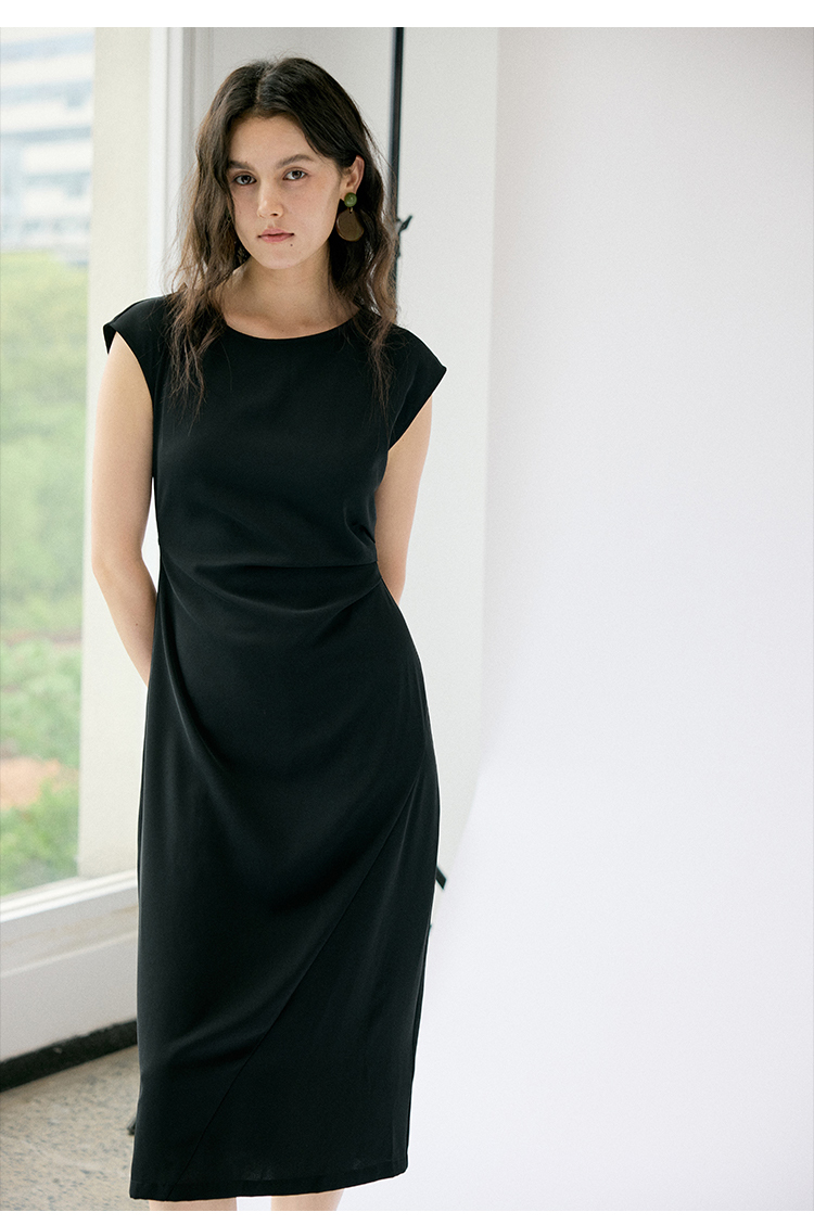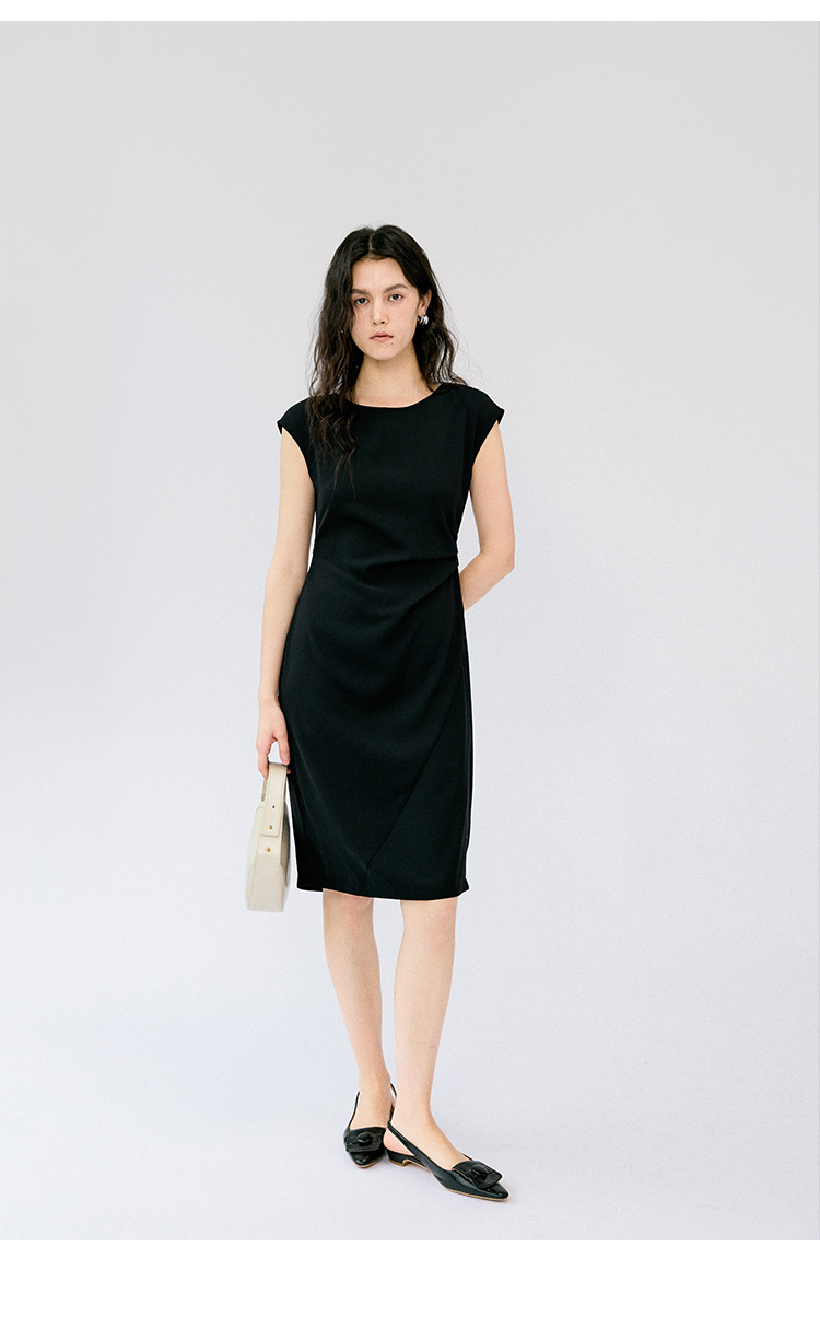HeyDress法式连衣裙女夏季圆领收腰显瘦设计感宽肩袖通勤小黑裙子