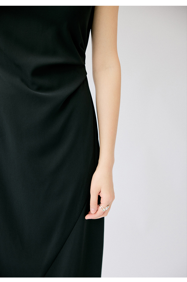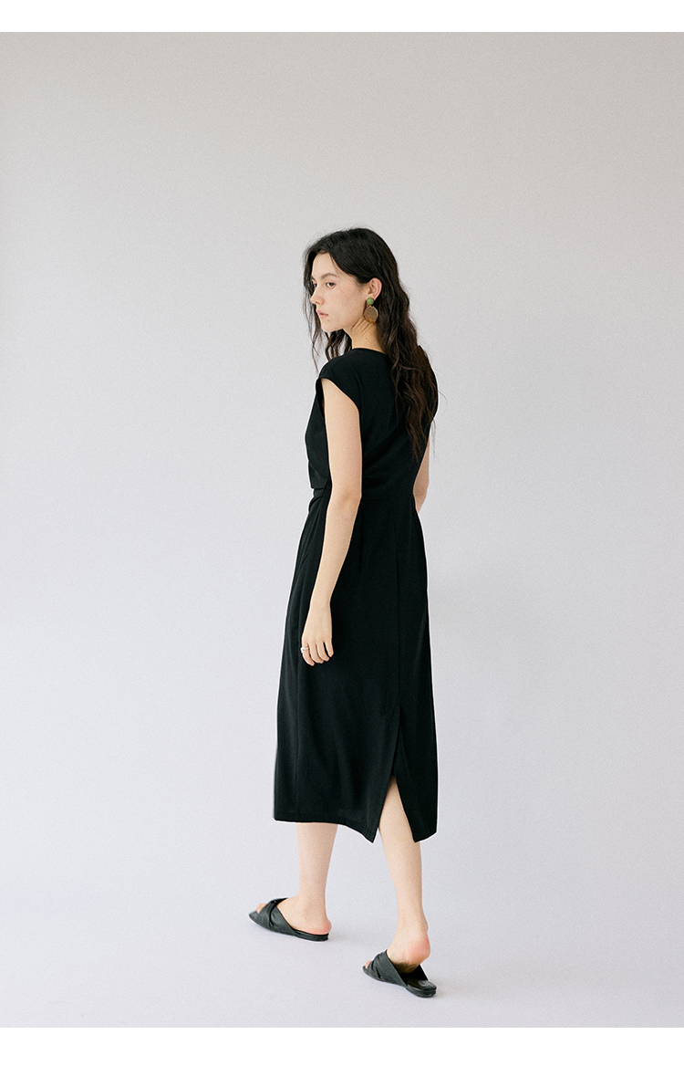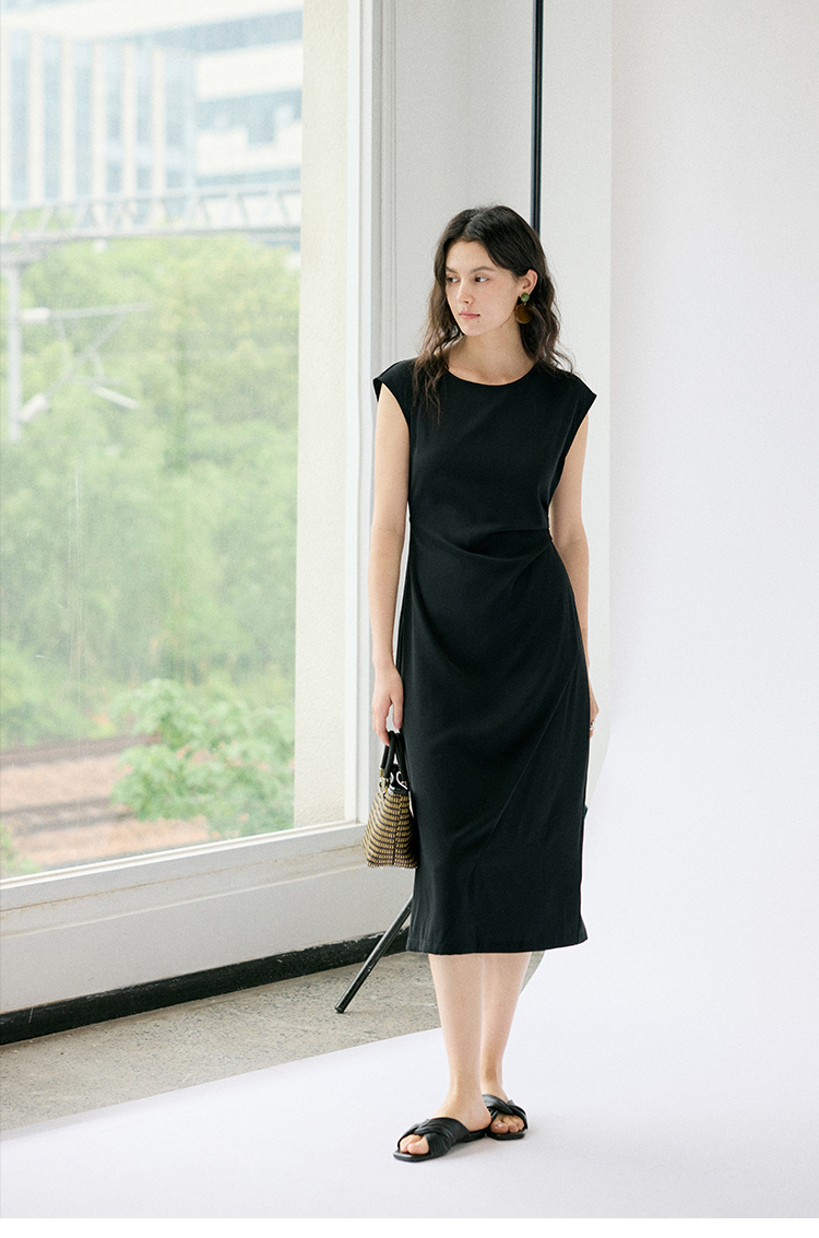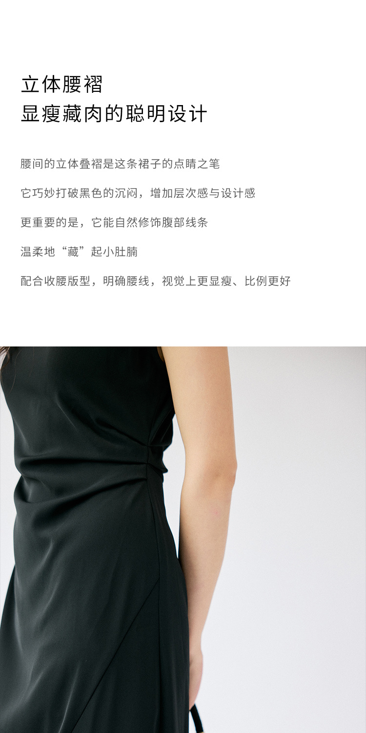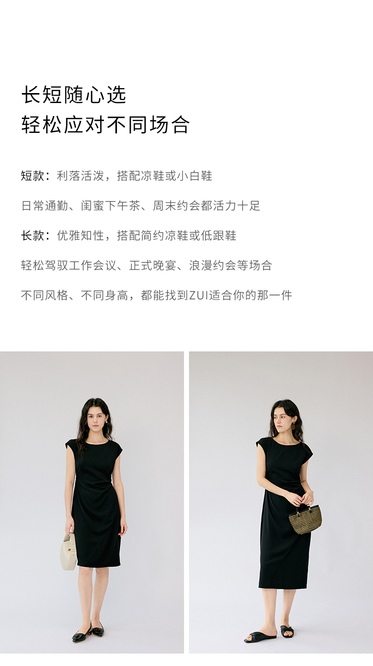 HeyDress法式连衣裙女夏季圆领收腰显瘦设计感宽肩袖通勤小黑裙子