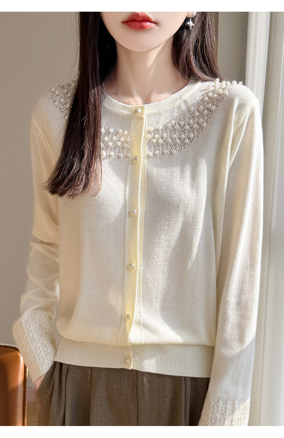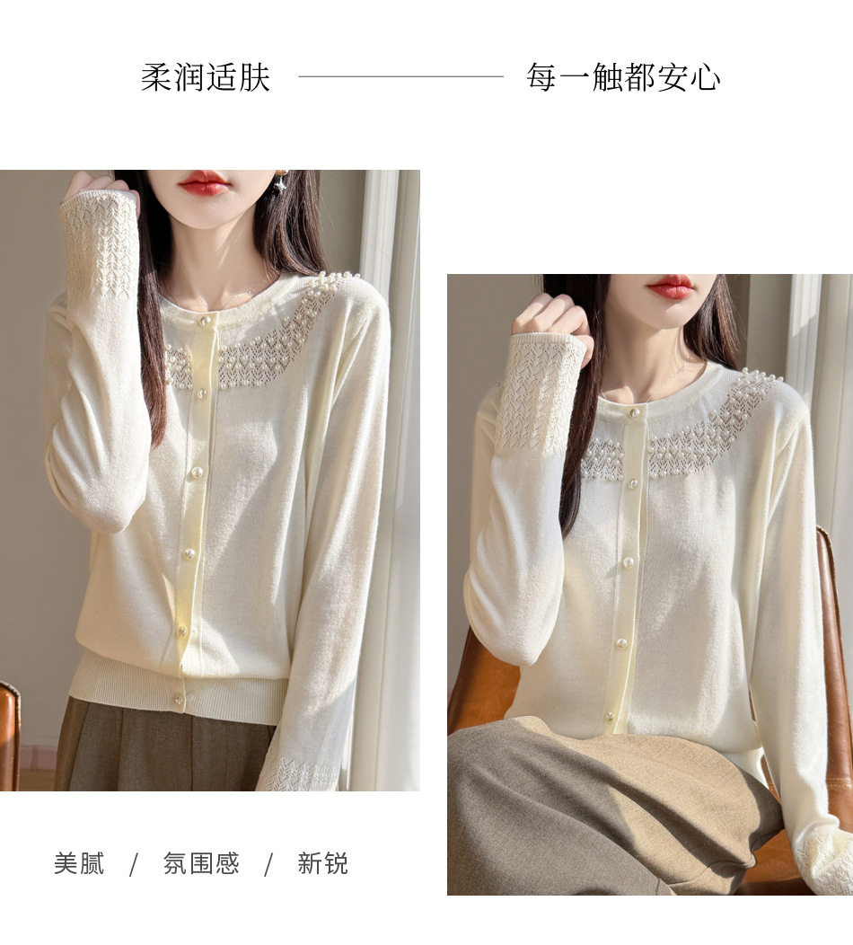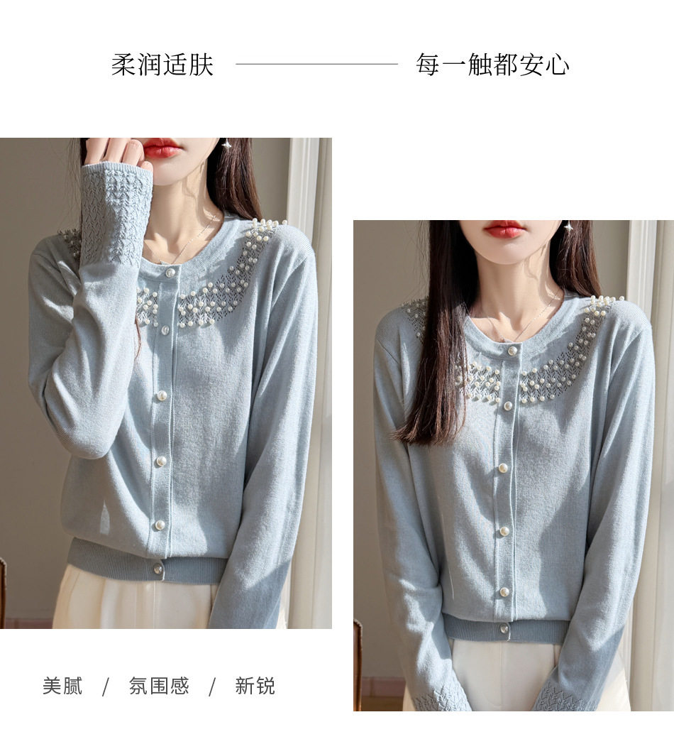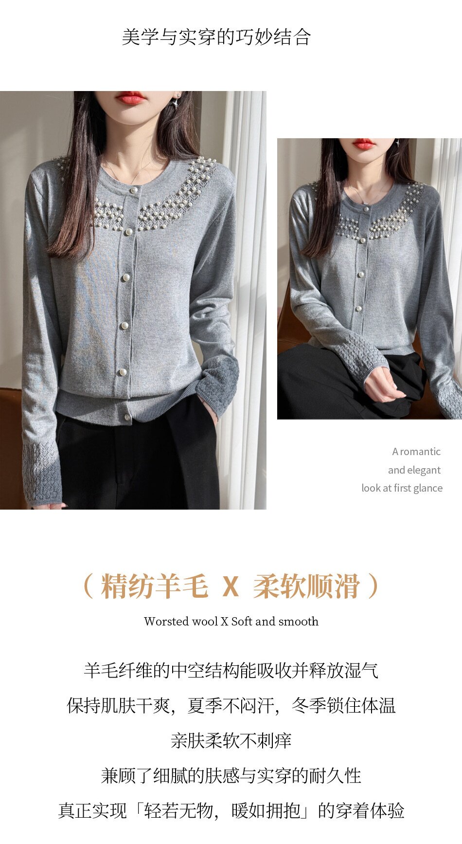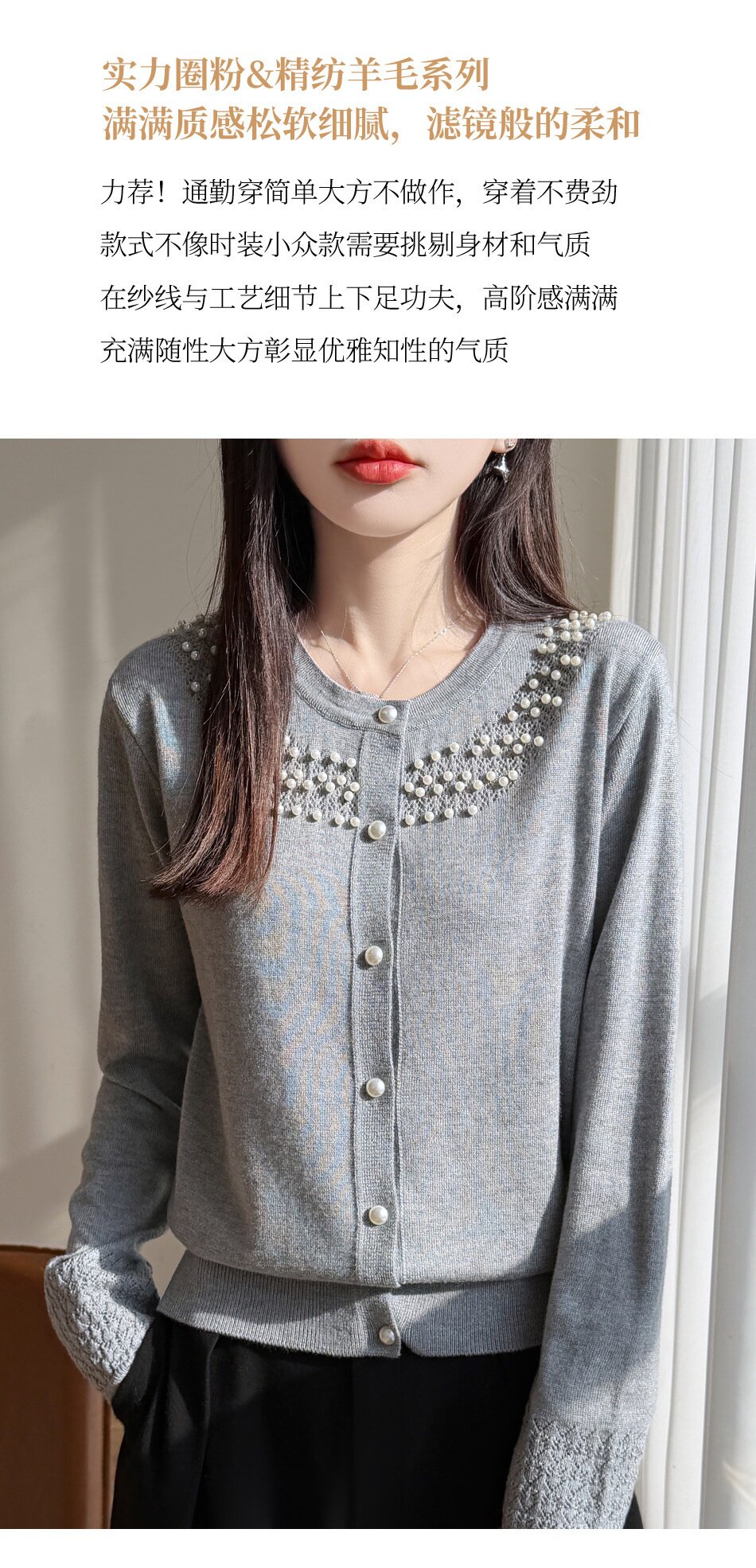 「自」全新升级【铂金会员119/天猫159/差价40】(23443)洛诗琳羊毛混纺圆领针织开衫2026春季钉珠镂空纯色空调开衫