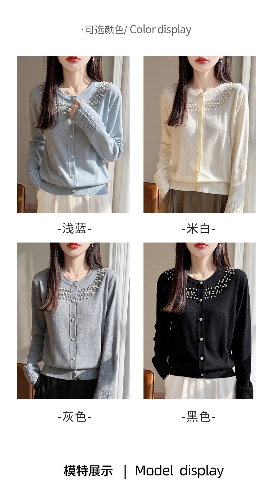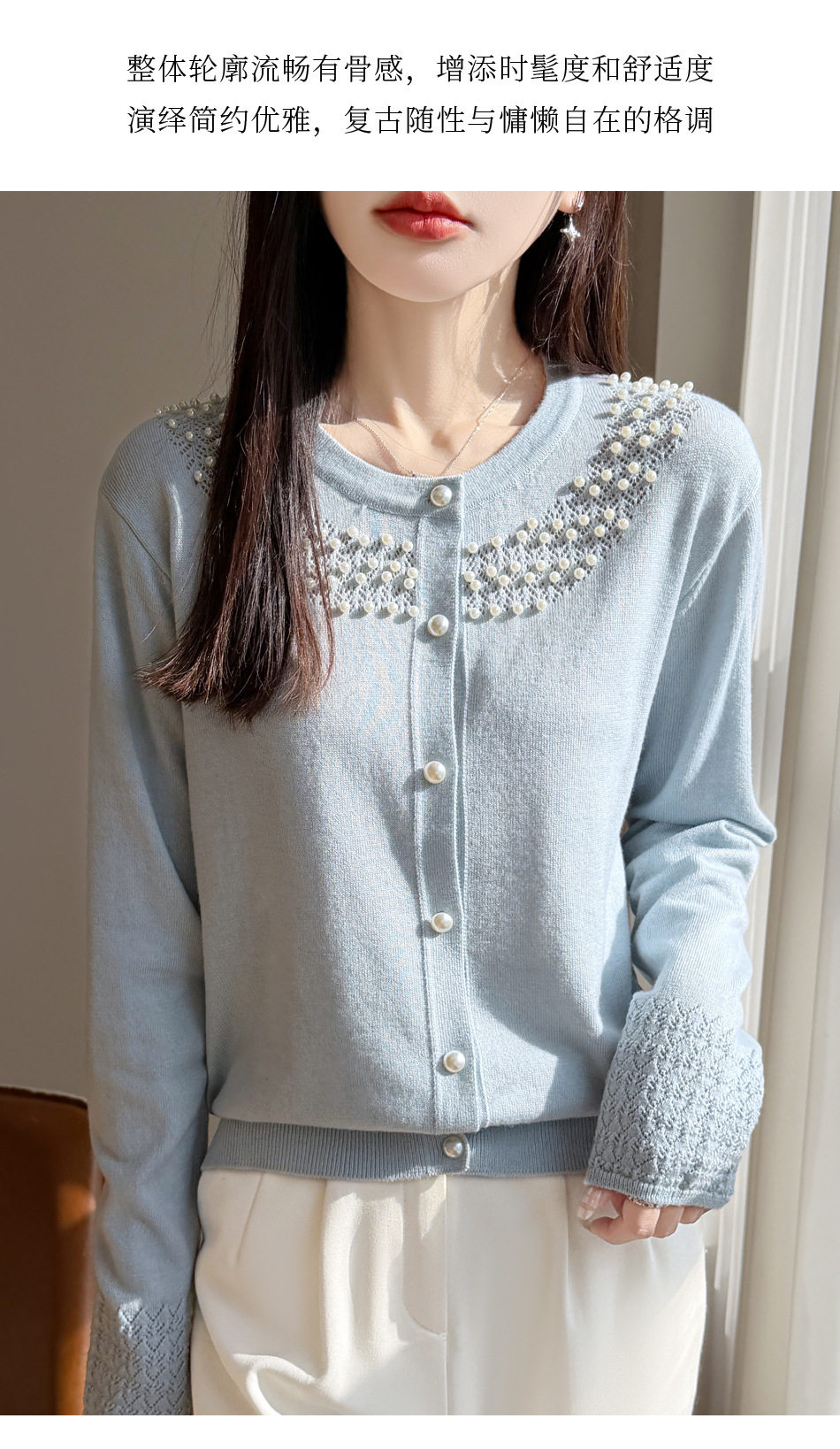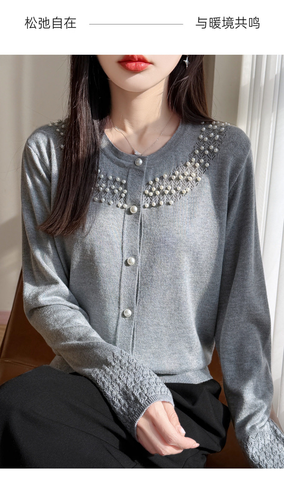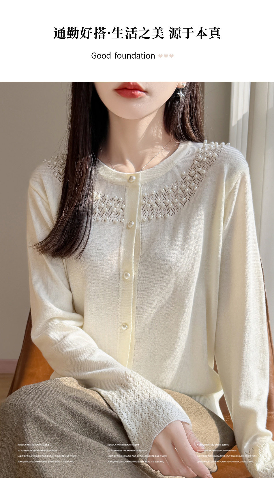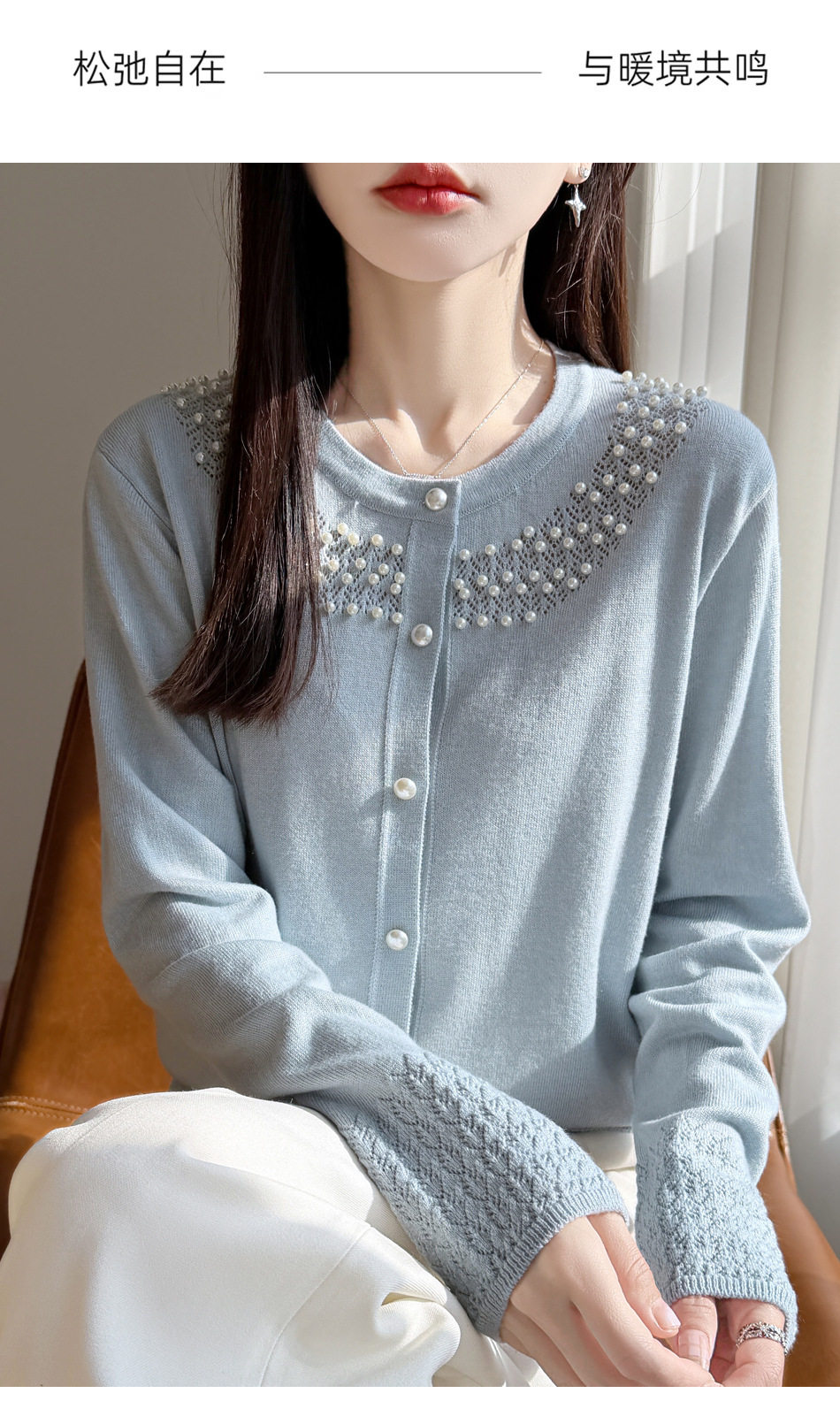 「自」全新升级【铂金会员119/天猫159/差价40】(23443)洛诗琳羊毛混纺圆领针织开衫2026春季钉珠镂空纯色空调开衫