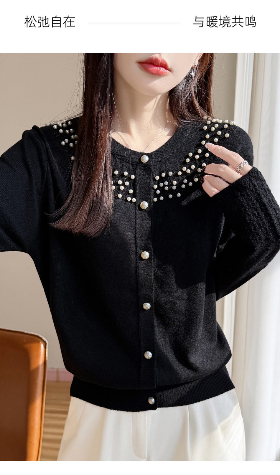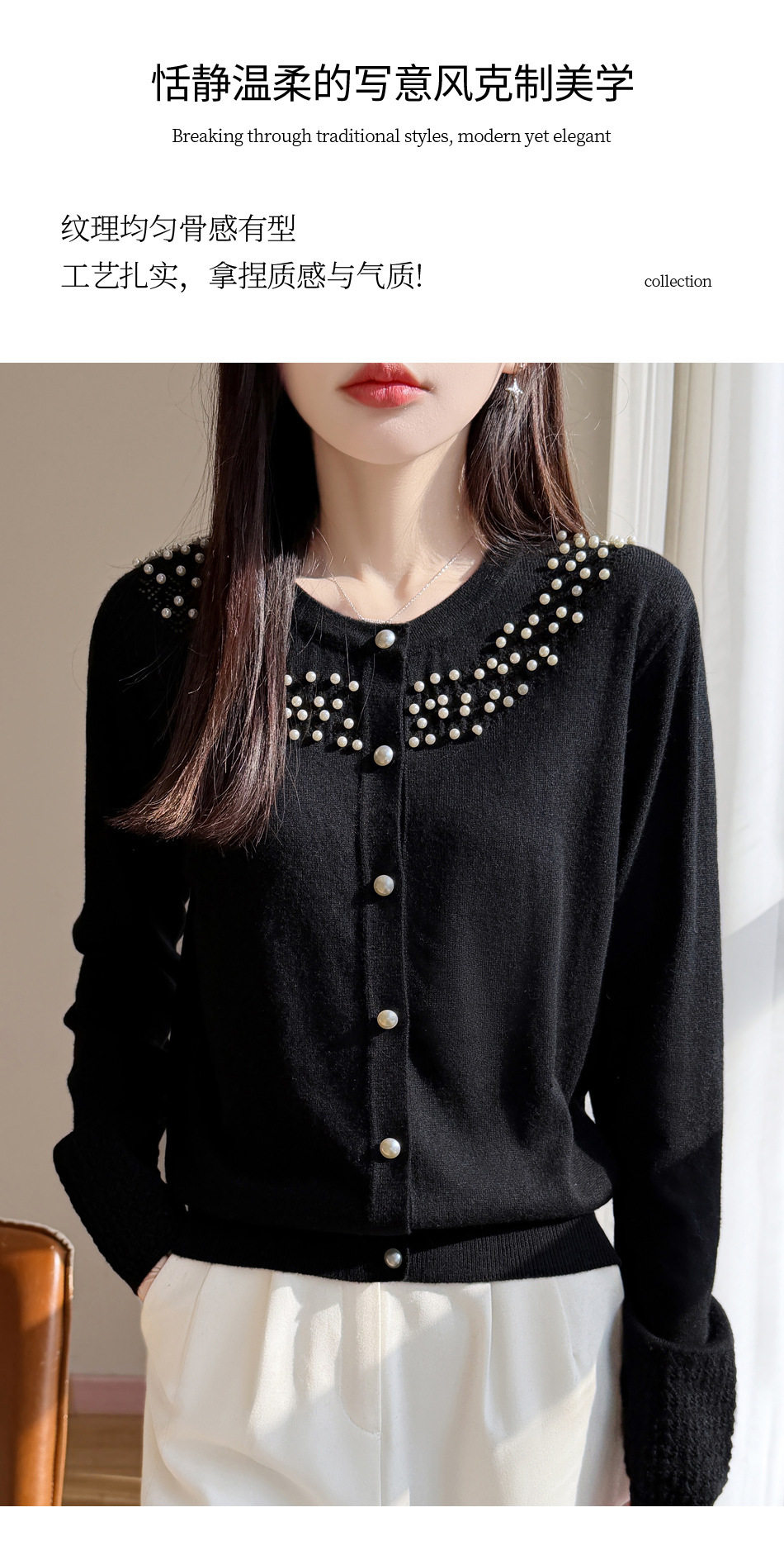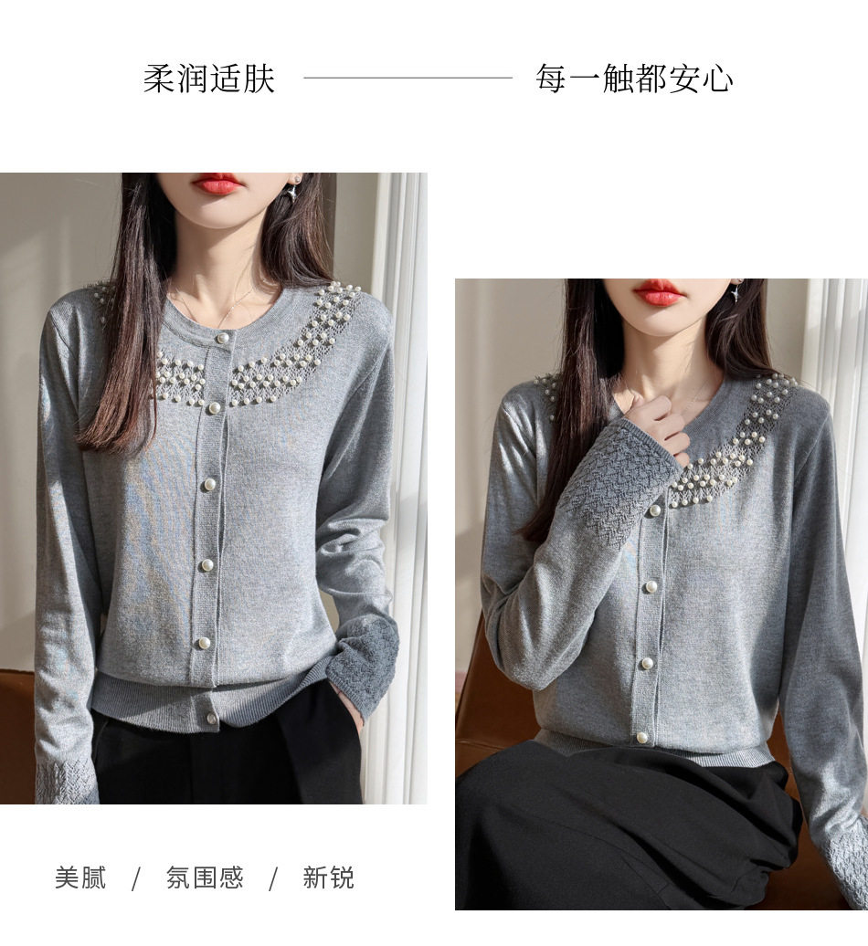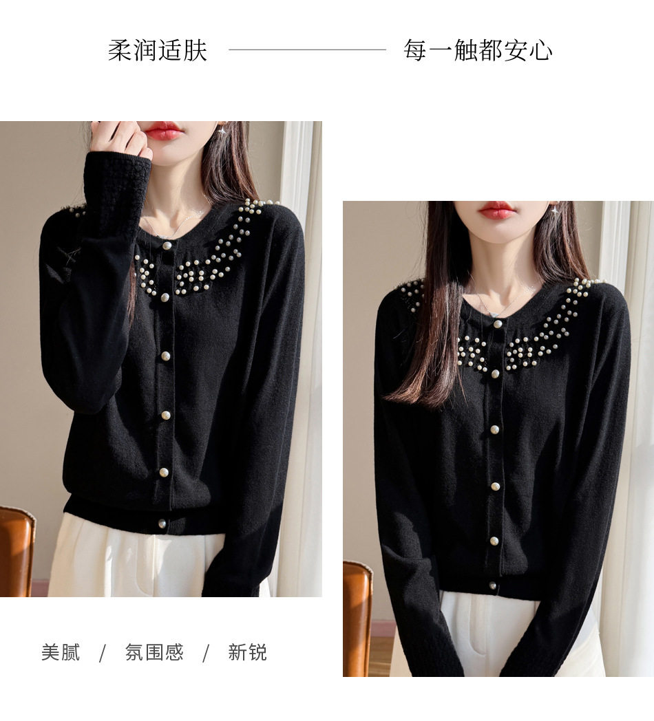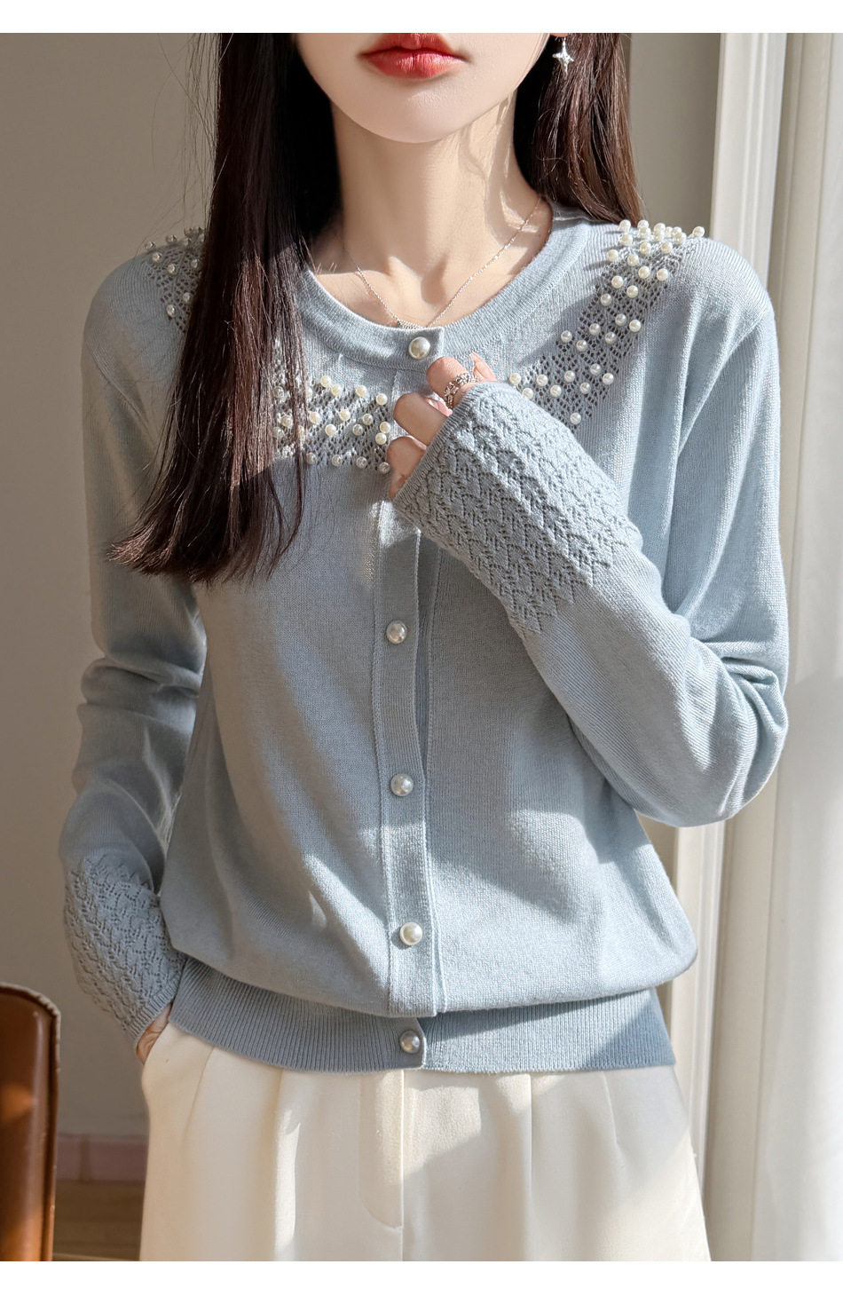 「自」全新升级【铂金会员119/天猫159/差价40】(23443)洛诗琳羊毛混纺圆领针织开衫2026春季钉珠镂空纯色空调开衫