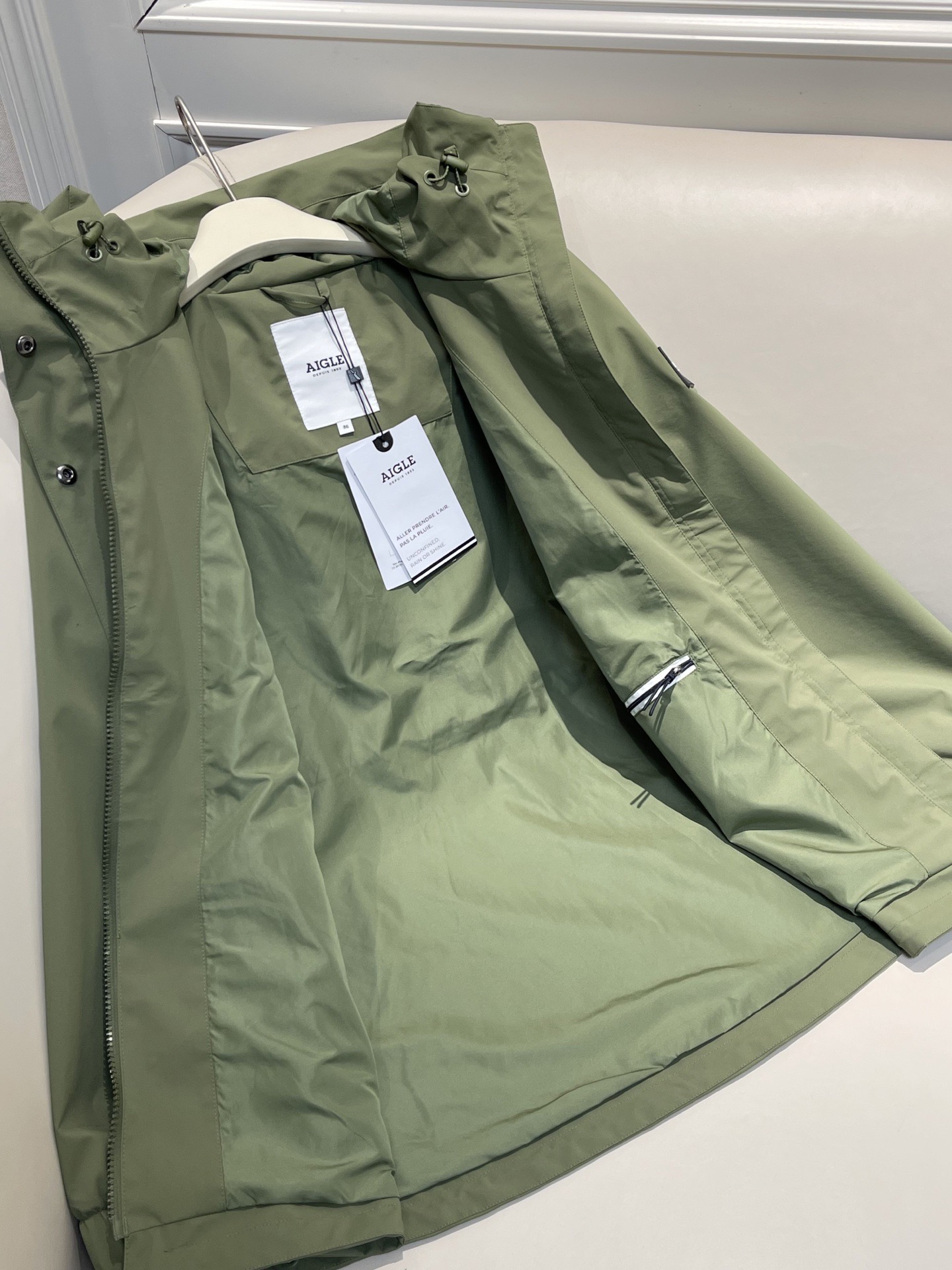 官网在售原价2900➕ 咱家性价比超高,同步两色,完全区别传统冲锋衣的硬核感,艾家更加注重对女性时尚风格的诠释,兼顾法式优雅与功能性,可通勤商务可轻户外运动!把舒适与格调完美融合~正肩版型显气质的效果很绝,腰部抽绳可调节 完全不挑身形,上身衬的人精致又贵气,叶绿色和大地沙色非常适合春秋穿着,一秒吸睛,户外拍照也很出片‼️ 轻户外或通勤出行穿都可以轻松驾驭~正单细节欣赏~ 独家研发的MTD面料具有防水防风和透汽功能,有效应对复杂环境,可通勤可户外~⚠️帽子不可拆卸‼️信我 这个品质一定要带回去亲自体验,绝对会爱上!顺丰包邮 国内代工厂订单余裁,纯原 最新款AI*LE艾高女士中长款连帽冲锋衣夹克~官网在售原价2900➕ 咱家纯纯福利款 回馈给大家,标牌齐全 自留款,可直接送人!