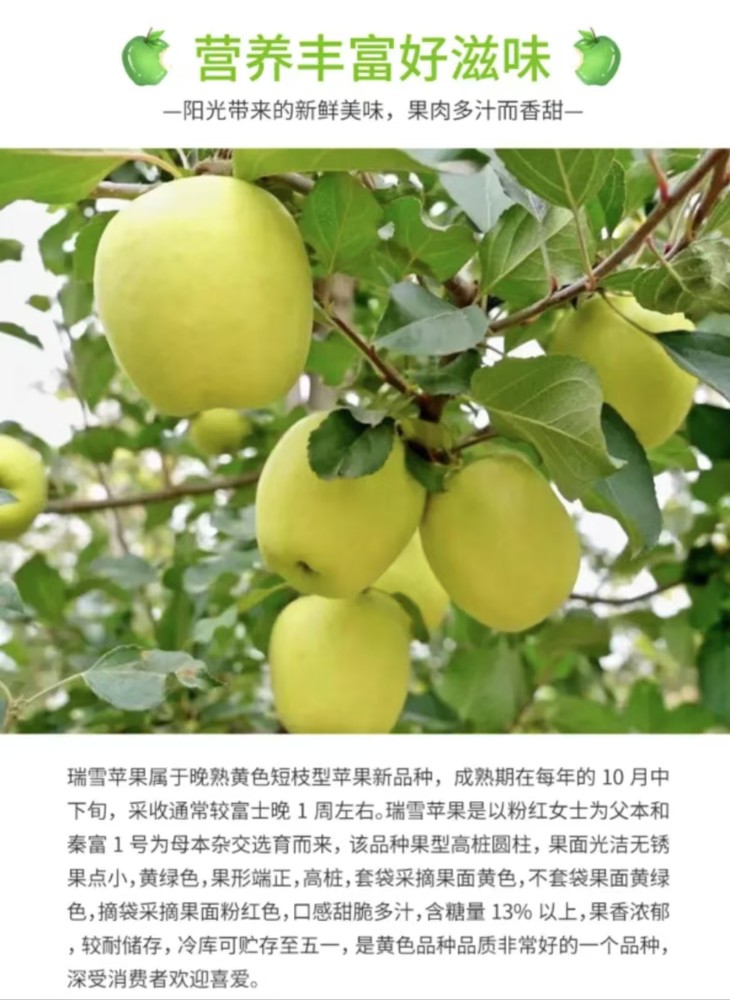 【重要提示】瑞雪苹果本身皮薄肉酥脆,生长中的擦伤、枝磨、果绣果斑、干疤等均属正常情况,不影响食用,另运输中轻微扎伤、碰伤面积小于一元硬币大小,果子碰伤1个不在售后范围内,超过一个,第二个果子开始按比例赔付。