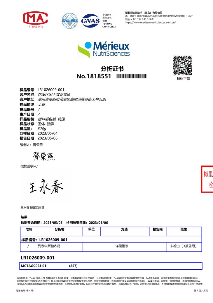土豆上架前也做了农残检测,无检出。