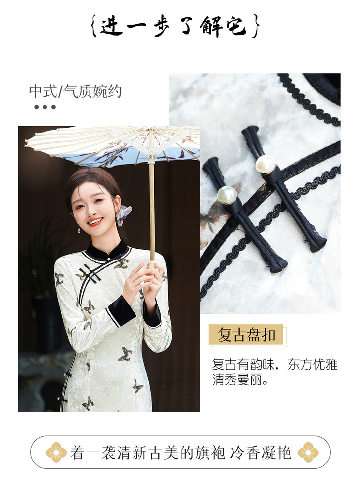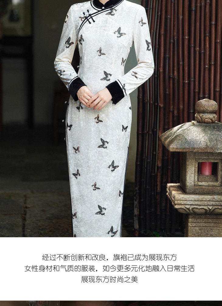 秋冬款丝绒印花白色连衣裙,高端年轻款改良新中式旗袍XLY25157