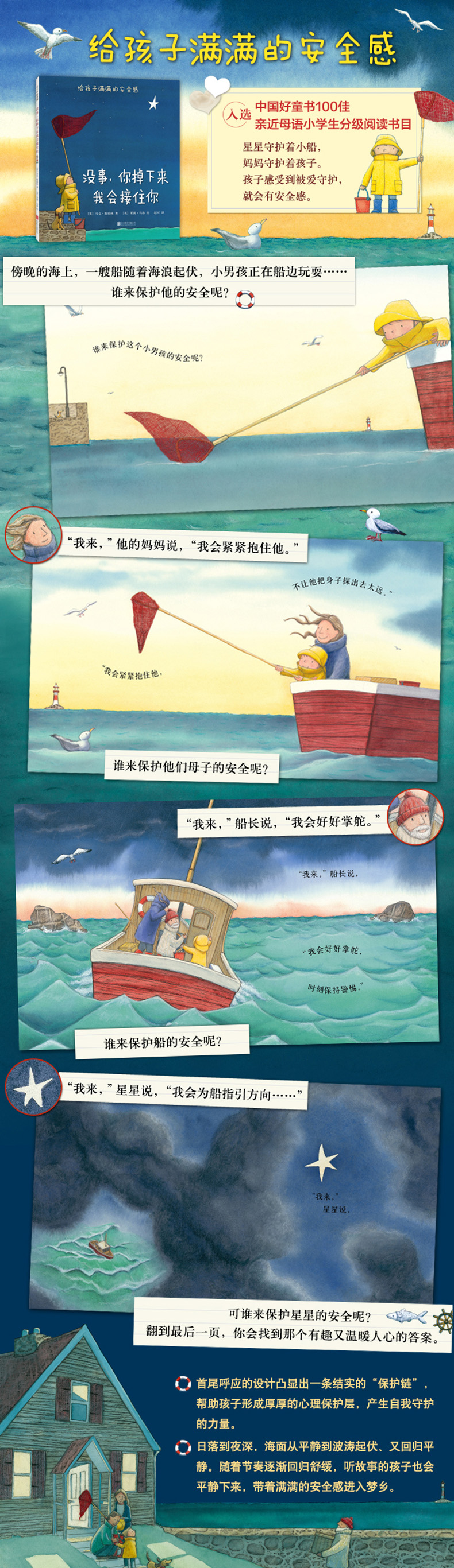马克·斯珀林著的《没事你掉下来我会接住你(精)》以温柔简洁的文字探讨了“爱和安全感”这一主题。首尾呼应的设计凸显出一条结实的“保护链”,让孩子获得“每个人都在被守护”的确信,从而产生强大的安全感。角度丰富、极具表现力的插图展现了海面从平静到波涛起伏、再到平静的多样景象,让人有身临其境之感;从日落到夜深,以蓝色为主色调的水彩画如梦如幻,美不胜收。随着节奏逐渐回归舒缓,听故事的孩子也会平静下来,带着满满的安全感进入梦乡。