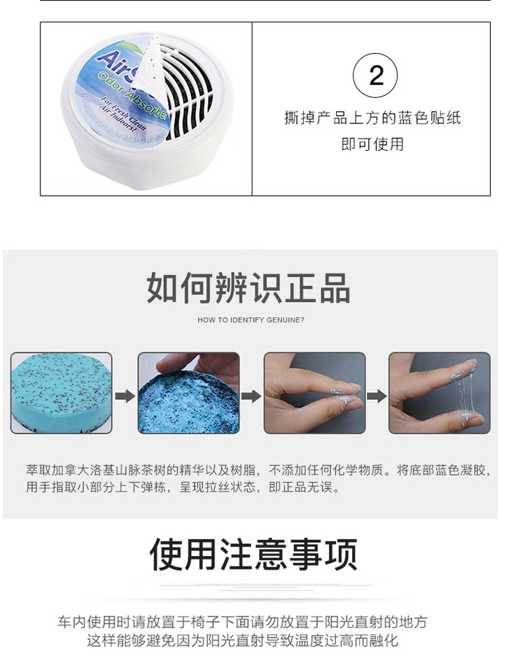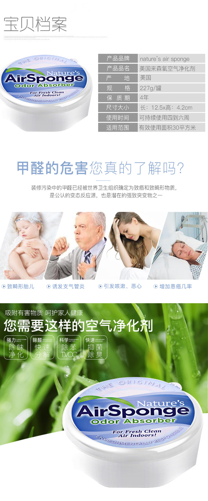 2 关于产品:Nature's Air Sponge空气净化剂采用的是活性炭+加拿大植物凝胶+天然植物香氛精油等成分,可有效除去烟味、甲醛等有害气体;另外产品还可散发出香气。