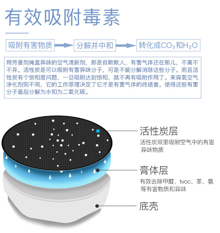 传统空气净化剂一般通过香味来掩盖难闻的气味,而Nature's Air 空气净化剂由皂胚融合活性炭而成,活性炭强吸附、其他成分散发与空气污染物中和反应,分解成二氧化碳和水,从而产生新鲜高质量的空气。