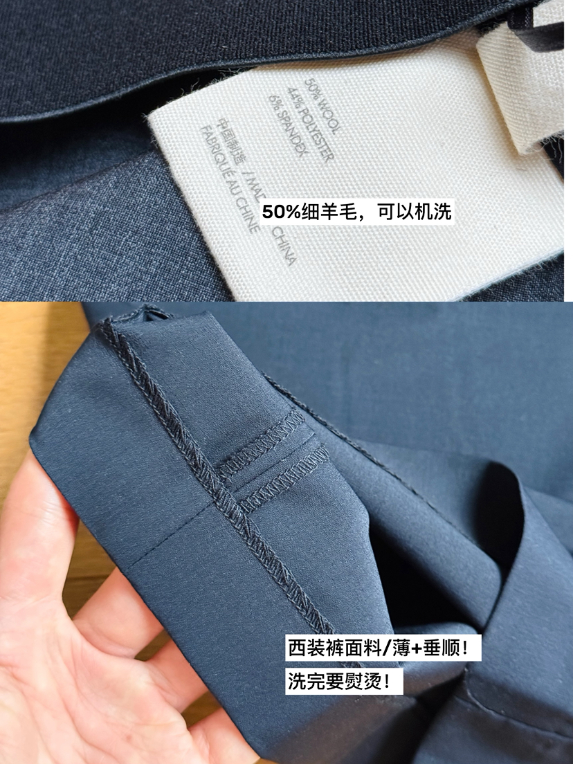面料:50%羊毛 44%聚酯纤维 6%氨纶【可以机洗,不可以烘干】薄面料!春夏穿!洗后熨烫会呈现最佳状态,有点褶皱喷点水挂一夜褶皱也消除!