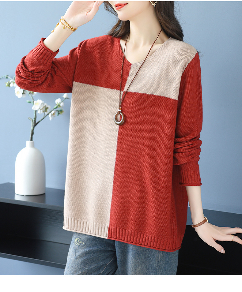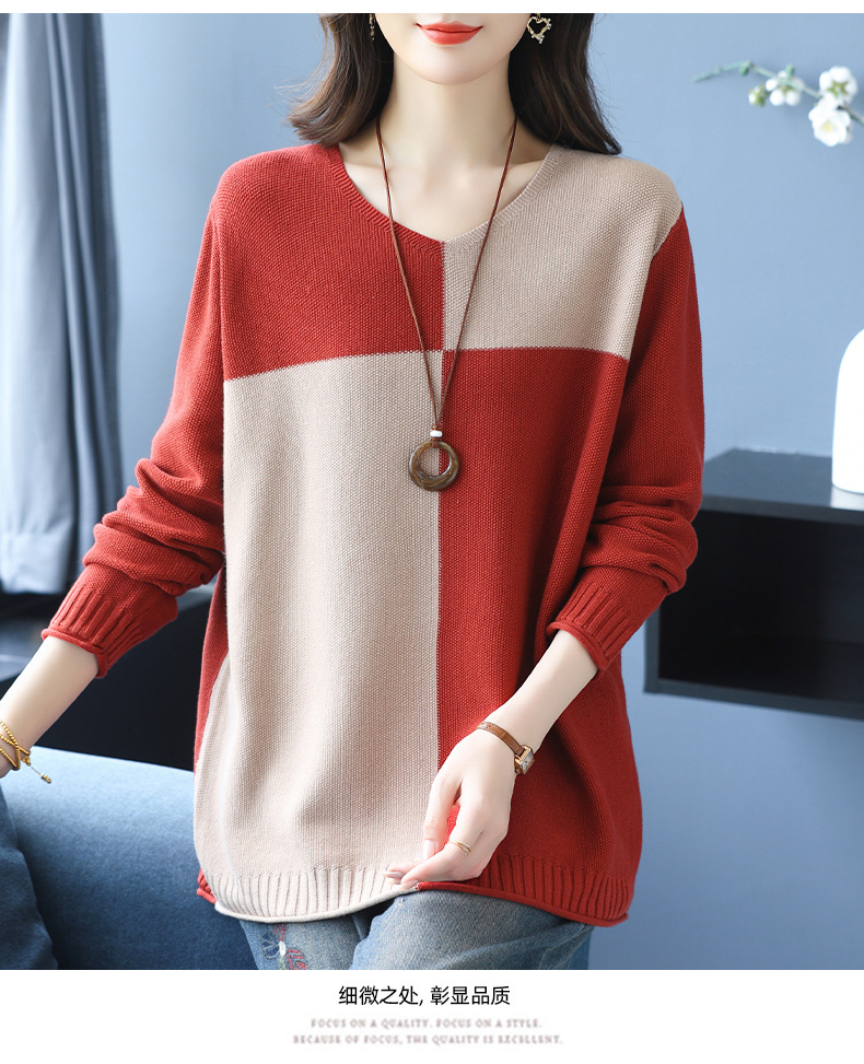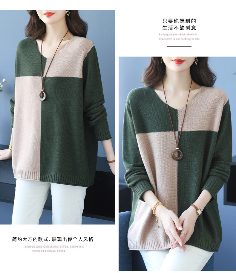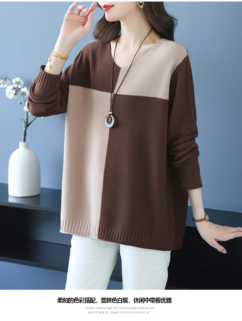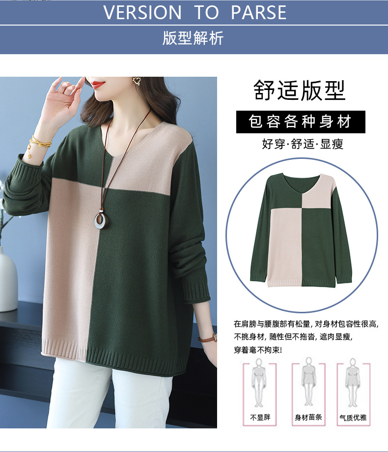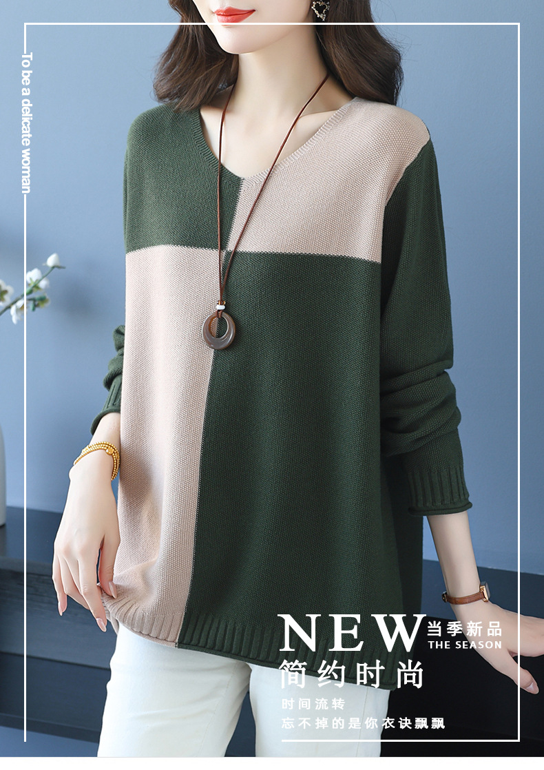CC 37-3130拼色V领长袖针织衫气质宽松大码